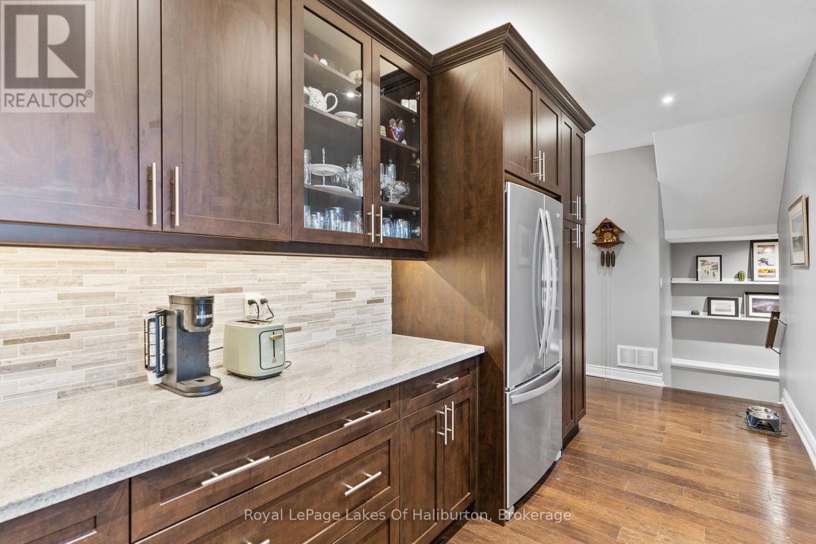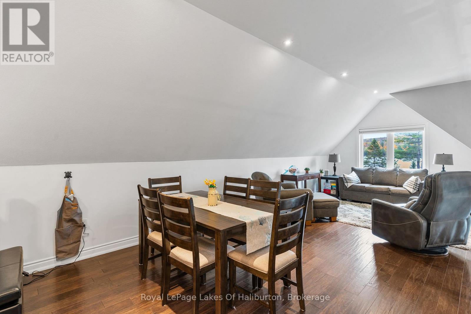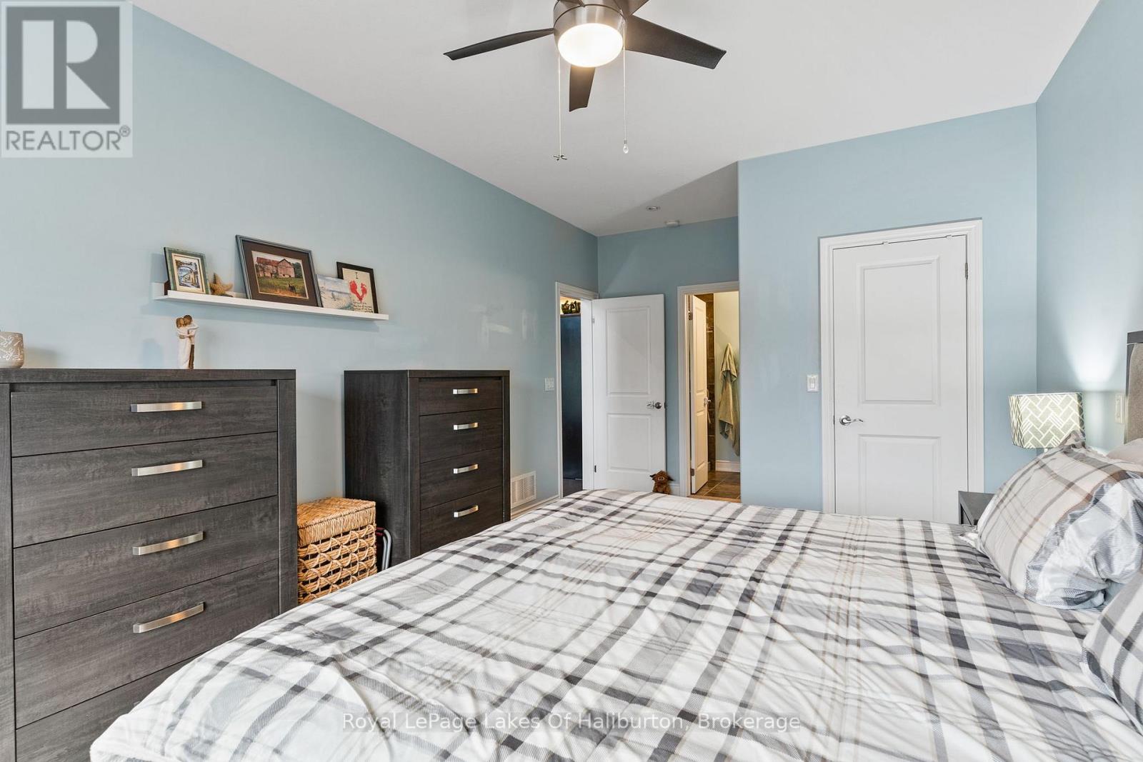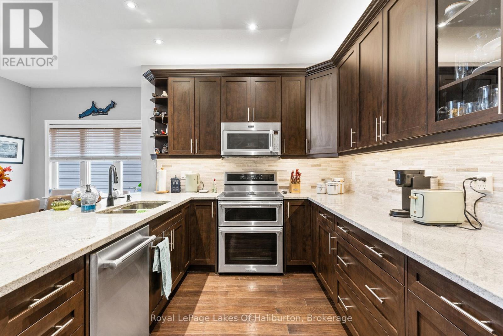 Welcome to this 4-bedroom, 4-bathroom executive home in the prestigious Silver Beach waterfront community on Kashagawigamog Lake, part of the sought-after 5-lake chain. With 2,955 sq. ft. of refined living space, this home combines quality craftsmanship, luxury finishes, and spectacular lake views.The foyer offers keyless entry, retractable screen, and tile floors leading to a gourmet kitchen with upgraded cabinetry, granite counters, under-cabinet lighting, sit-up area, stainless steel appliances, and elegant fixtures. The great room impresses with cathedral ceilings, a stunning floor-to-ceiling stone propane fireplace, hardwood floors, soaring windows, and walkout to a lakeside composite deck featuring a cedar timber-frame pergola and BBQ area and endless lakeviews.The primary suite provides a peaceful retreat with walkout to the deck and awning, ceiling fan, ensuite with heated floors and glass shower. The upper level offers a bright family room with glass panels overlooking the great room, high ceilings, hardwood flooring, 2 bedrooms, carpeted, ceiling fans, and custom blinds, while a walk-in closet area adds generous storage and 4pc bath with soaker tub.The lower level features a spacious rec room with propane fireplace, pot lights, and walkout to an interlocking lakeside patio. A guest suite offers a walkout to waterside patio, walk-in closet, and 4-pc ensuite. Additional highlights include, all bathrooms with heated floors, a multi-zone HVAC system, new hot water on demand (2025), 18W Generac generator, NFTC fibre optics, and a heated, insulated garage with storage and retractable screen. Exterior upgrades include programmable soffit lighting, glass railings, firepit area, and under-deck shielding.Enjoy exclusive access to the Silver Beach Clubhouse featuring a grand hall, kitchen, fitness center, games room, guest suite, two beaches & trails, close to Haliburton for all your amenities. Dock slip available to purchase ($25K). See full list of features. (id:64974)