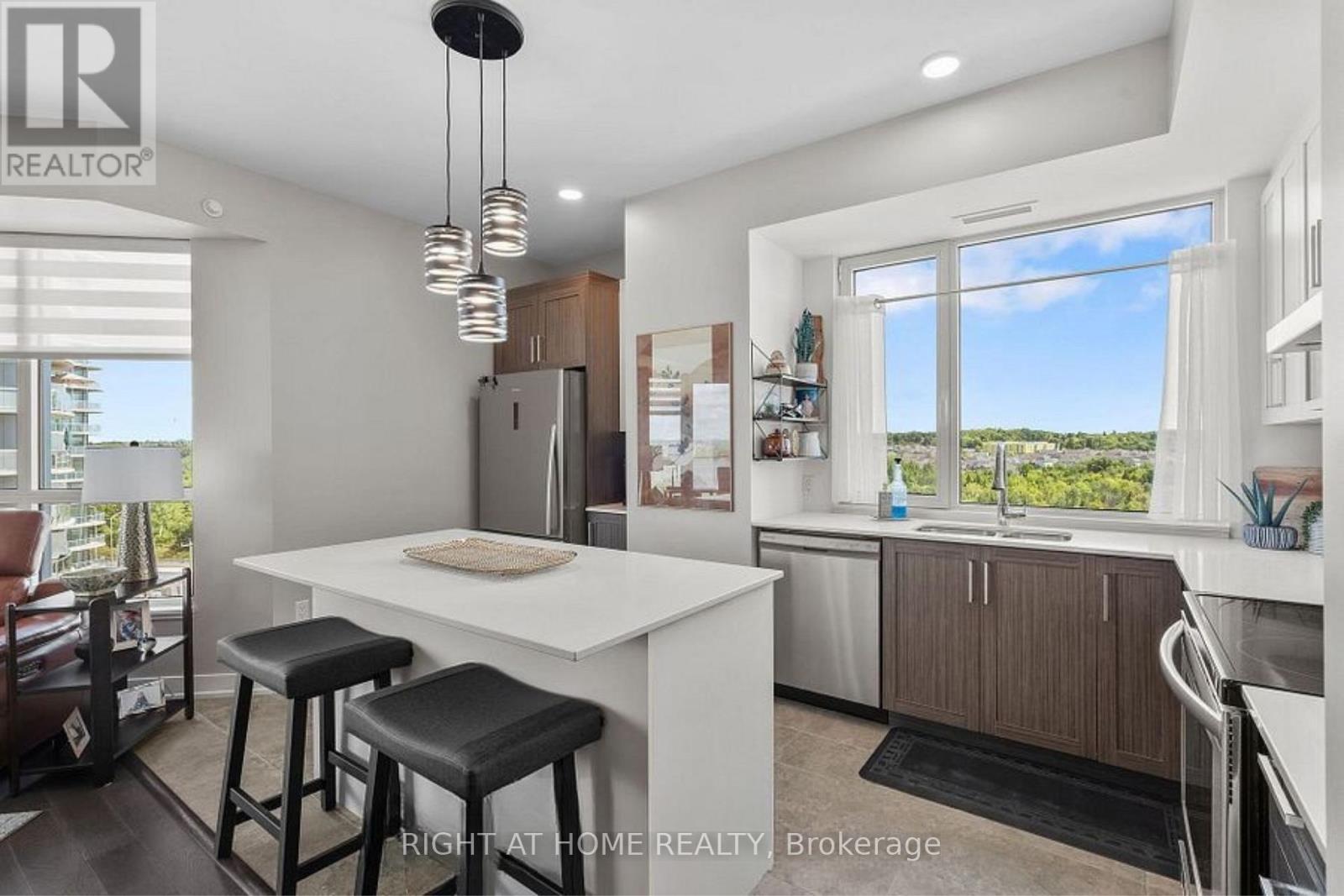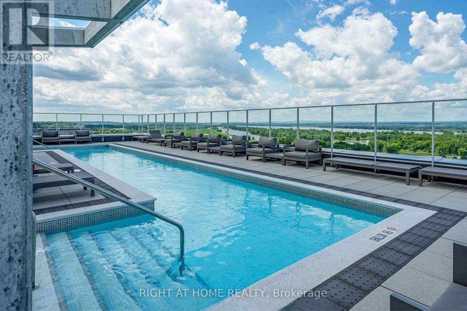 Lifestyle is what this condo is all about! Step into modern elegance with this stunning condo featuring a well thought open concept layout. Gorgeous large foyer with ceramic tiles, leading to a bright living space with expansive windows that flood the room with natural light with views of the Ottawa river and Gatineau Hills. Spacious and well laid out 2-bedroom, 2 bath condo in the coveted Petrie's Landing area with River view. Over 1180 square feet of living space, with 2 balconies (extra 287 s.f.) one with views of the river and the other overlooking Orleans (North- East-South views). The condo comes with 1 underground parking space and one storage locker. No carpets in the unit, all engineered hardwood or tiles. Bright unit with living-dining-kitchen open plan, bedrooms separated by the living space each have their own full bathroom. The primary bedroom offers a walk-through closet and luxury spa like bathroom with double vanity, separate tub and double shower; the 2nd bathroom is a 3-piece bathroom. Good sized vestibule at the entrance, in unit laundry and storage area. Kitchen has a breakfast island, generous counter space counters (Quartz) and a window. Linen closet near the dining area. Quality automatic blinds throughout, stainless kitchen appliances. You will love the roof top amenities, including lap pool & spa with gorgeous views of Petrie Island, the adjacent party room (looks like a luxury lounge!) and exercise room. Other amenities include bicycle storage, kayak, paddleboard storage& indoor car wash. Also walking distance to the LRT Park & Ride at Trim Rd and soon to be LRT stop on Line 1. Immediate Occupancy. (id:64974)