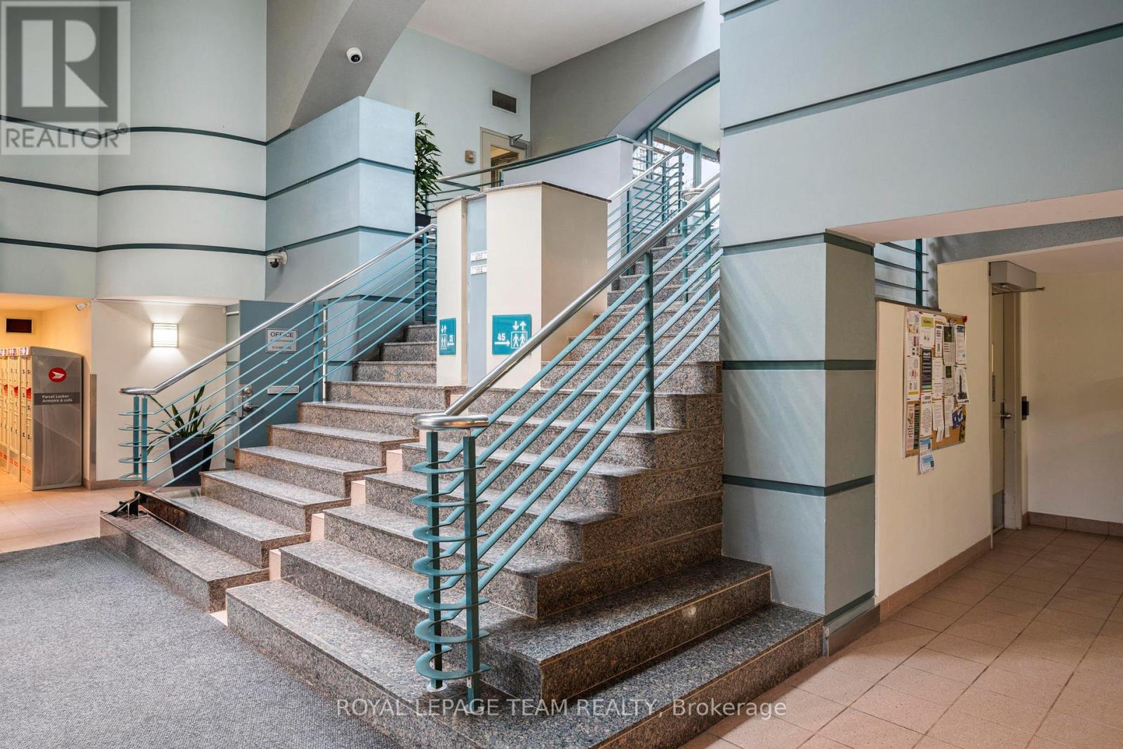 Welcome to urban living at its finest in this bright and spacious 1-bedroom + den condo, ideally located between Hintonburg and Westboro. This thoughtfully designed unit features an open-concept layout, with the den seamlessly incorporated into the living area to maximize space and functionality. Exclusive to the top floor of 45 Holland Avenue you will enjoy 9 ft. ceilings and wall to wall windows in this unit. Beautiful hardwood flooring throughout, a renovated galley kitchen with a convenient passthrough to the dining area, and an updated bathroom. Step out onto your private open balcony and take in stunning east facing downtown views. The building offers a rare and inviting interior courtyard complete with a gazebo and BBQ area-perfect for relaxing or entertaining. Location highlights include: steps to Tunney's Pasture LRT station, walking distance to Wellington Street West shops, cafés, and restaurants, close to Parkdale Market, near the scenic Ottawa River Pathway and parkway and outstanding walk score (93) and bike score (99) .Condo fees include: heat, hydro, and water, building insurance and management and maintenance and caretaking. (id:64974)