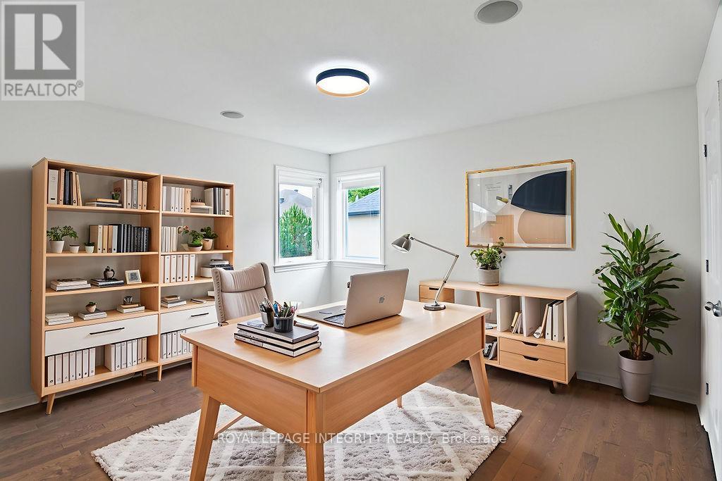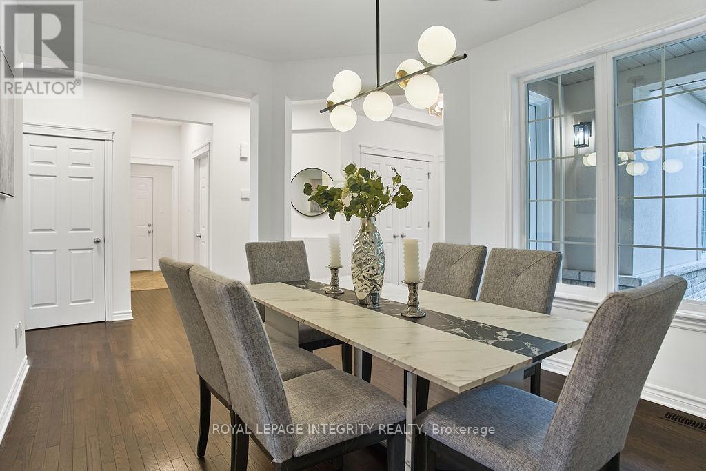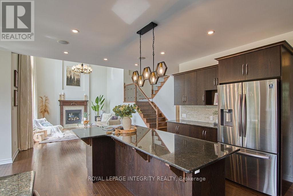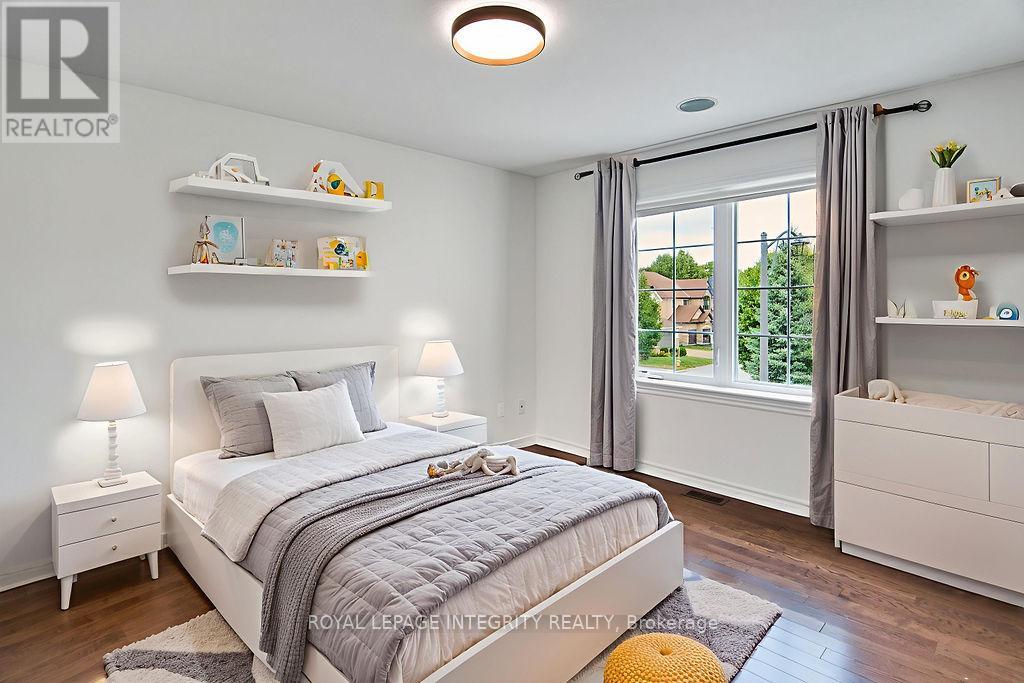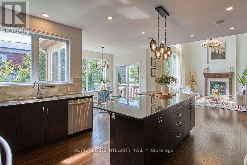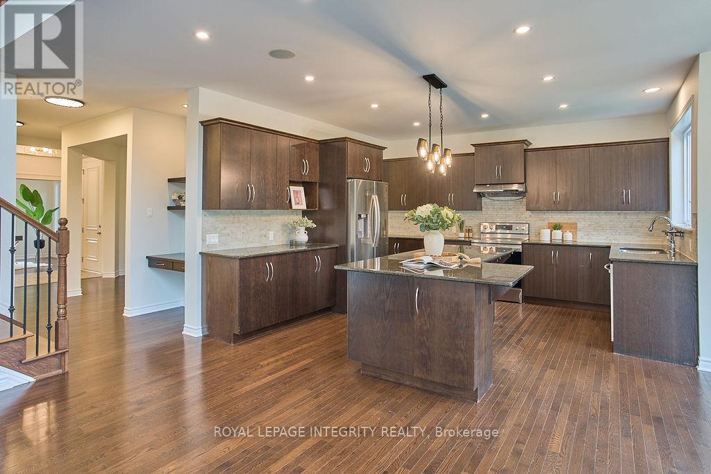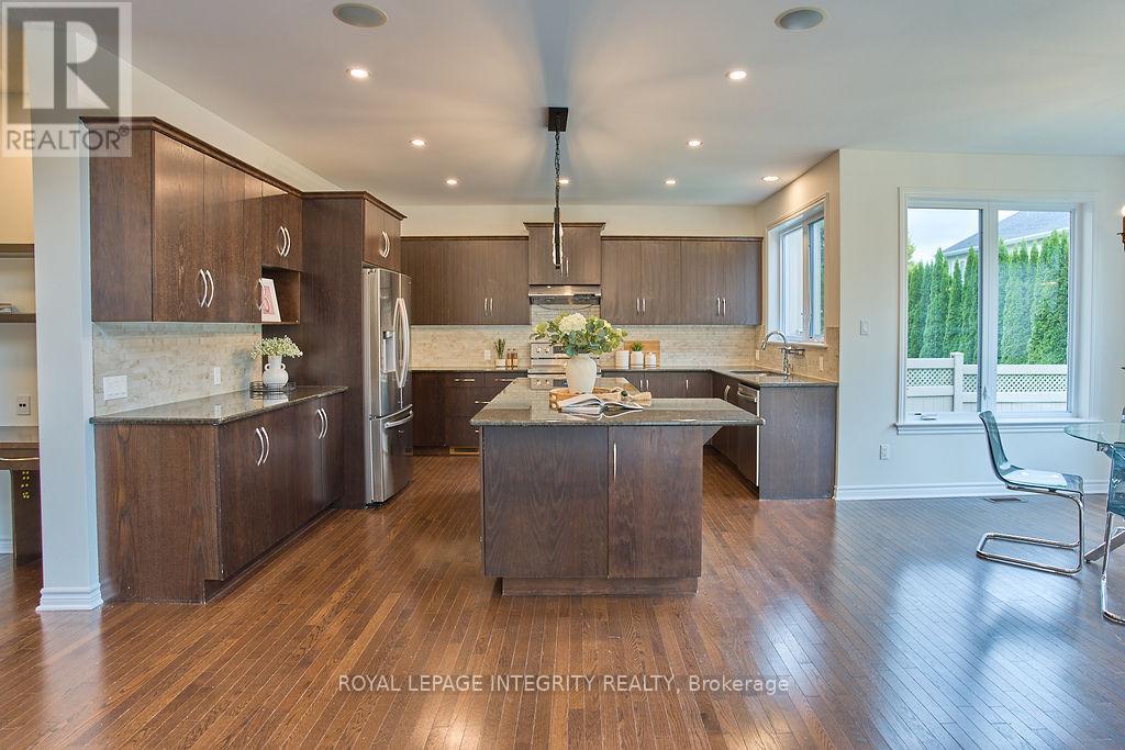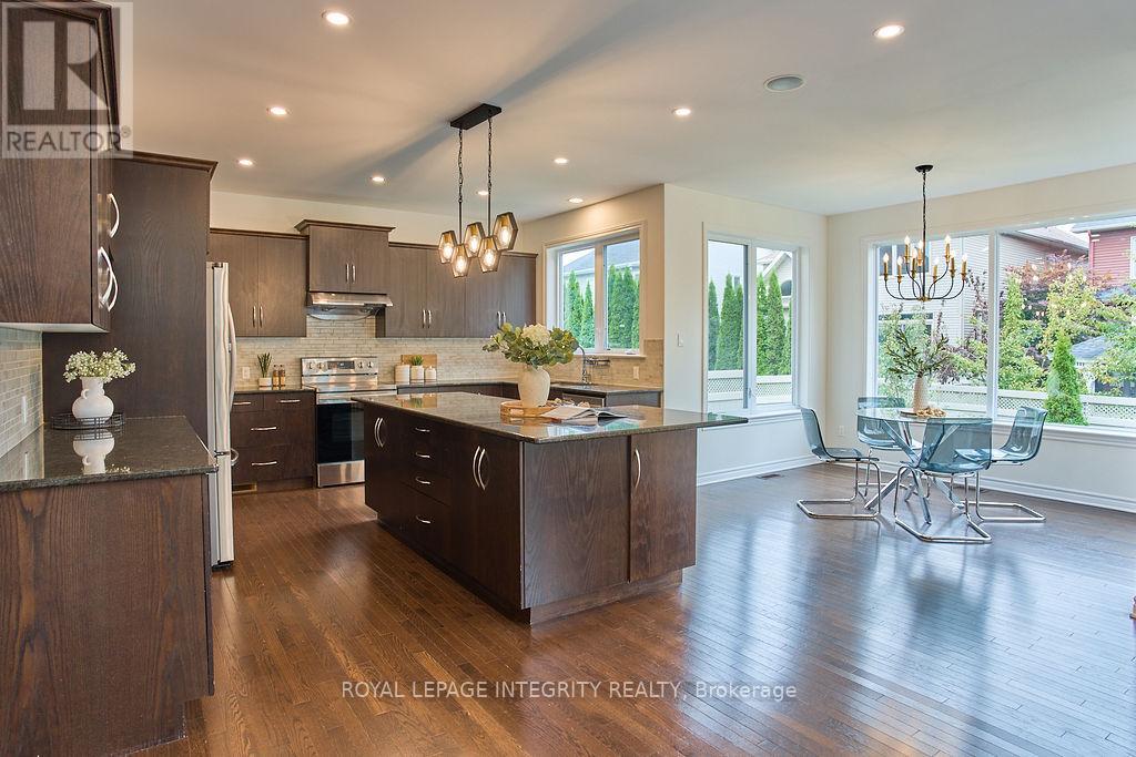 Nestled in the prestigious Kanata Estates, this Cardel Custom-Built masterpiece is a symphony of architectural elegance with functionality of 5 bedrms+4 baths; Situated on an exclusive quiet street, this home makes an unforgettable first impression with its Expensive EIFS exterior and an Oversize 2.5 -Car Garage. Cross the private entrance, the rich Solid Hardwood flooring throughout the 3158 sqft of meticulously curated above grade living space and a magnificent staircase. Soaring cathedral ceilings and 2-story, SW-facing windows bathe the living room in natural light, a sun-drenched backyard offers the perfect sanctuary for family gatherings. Whether you are hosting an elegant soirée or curling up by the Towering gas fireplace on a snowy evening, this room radiates a sense of "home" that is impossible to replicate. The enormous modern kitchen is a dream realized, boasting gleaming SS appliances, premium Granite counter-tops and a massive Central Island. The dedicated Walk-in butler's pantry ensures your gourmet essentials are always tucked away, while the built-in Tea Bar and Laptop Niche allow you to work or relax while your masterpieces simmer. The main floor also features a private executive Office and a large mudroom with a walk-in closet for seamless organization. The primary suite is a palatial retreat, offering 2 walk-in closets and a spa-inspired ensuite with 2 brand-new quartz counter-tops and a deep soaking tub. 3 additional spacious bedrooms, a large 4pc main bath, and a generous laundry complete this level. The massive Fully Finished basement features high-end laminate, a large 5th Bedroom, a Gym, an Open Den and a large 3pc Full Bath. This location is unbeatable: Top-Tier School Zone, walk to Gabriel Elementary, All Saints HS, and Beaver Pond trails; enjoy the proximity to the High-Tech Hub. It's the ultimate, rare blend of sophisticated Luxury, elite Education, and serene Tranquility in the heart of Kanata Lakes! (id:64974)