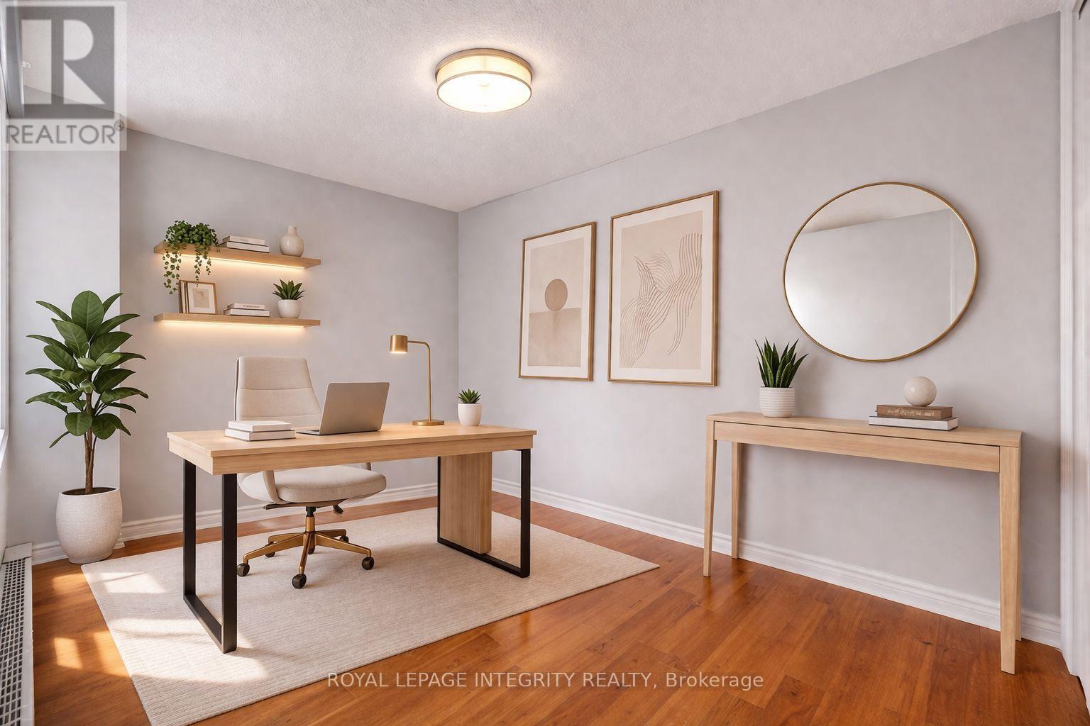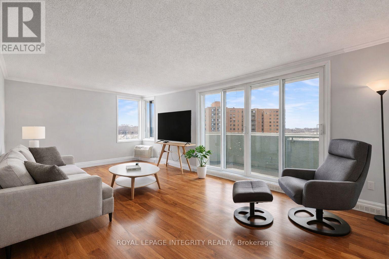 If you love nature and amazing building amenities, this is the one! Welcome to this beautifully updated 2-Bedroom + DEN, 1-bathroom corner unit offering exceptional natural light, and stunning views from two private balconies. Thoughtfully designed and move-in ready, this bright condo features a sunken living room with an adjacent den-perfect as a home office, guest room, or hobby space. The updated kitchen overlooks the living area and provides ample cabinetry and counter space for everyday living and entertaining. The spacious primary bedroom includes patio doors leading to a second private balcony. Enjoy carpet-free living with a combination of hardwood and luxury vinyl flooring throughout. Additional conveniences include in-suite storage, a separate storage locker, and one underground parking space. Take special note of these amazing and all-inclusive amenities! Indoor pool, saunas, exercise room, party room, residents' lounges with Wi-Fi, guest suites, workshop, tuck shop, bicycle storage, and ample visitor parking. Condo fees include building insurance, heat, hydro, water, internet, and Bell Fibe TV with Crave-offering exceptional value. Ideally located near the Ottawa River, scenic walking and cycling paths, shopping, transit, and the New Orchard Light Rail Transit (LRT) station, this home offers the perfect balance of comfort, convenience, and lifestyle. Book your showing today! Some photos virtually staged for Tenant privacy. (id:64974)