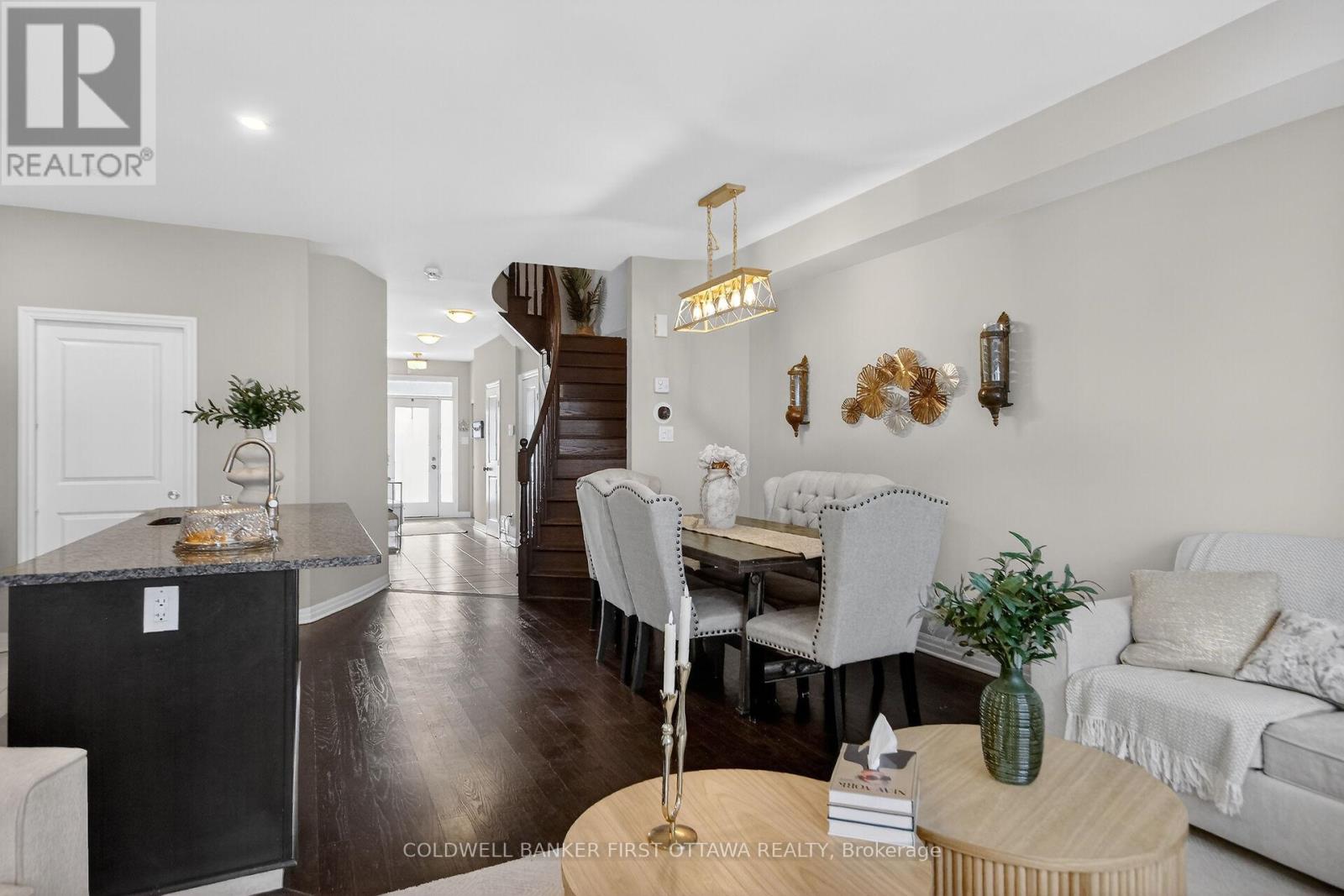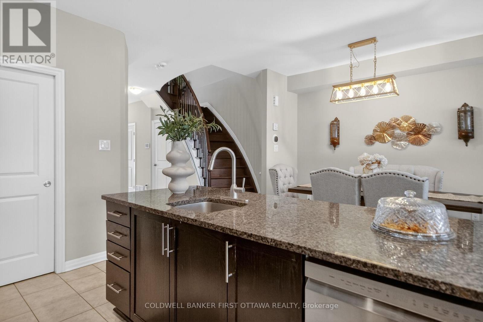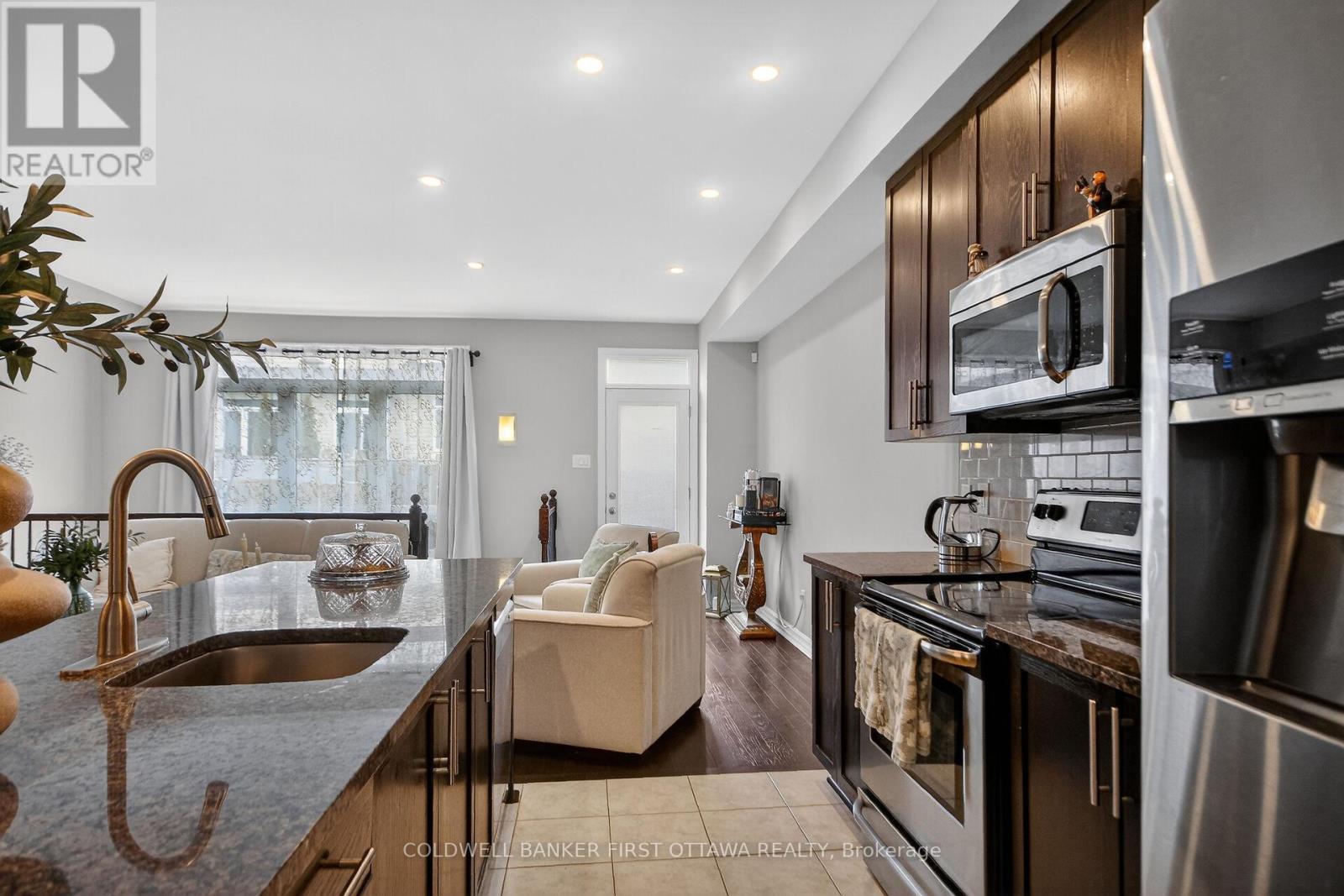 Welcome to this Stunning, Sun-Filled Executive Townhome in the highly sought-after Findlay Creek community. This beautifully designed Claridge Infinity model offers approximately 2,160 sq. ft. of elegant living space, featuring a bright open-concept layout perfect for modern living. The main floor boasts 9-foot ceilings, rich hardwood flooring, and a spacious living area ideal for both relaxing and entertaining. Recently refreshed with a fresh interior paint throughout. The well-appointed kitchen is a true chef's delight, complete with granite countertops, stainless steel appliances, a stylish backsplash, premium cabinetry, and a convenient walk-in pantry. Enjoy casual meals in the breakfast area or host gatherings in the formal dining space. Upstairs, you'll find three generously sized bedrooms and two full bathrooms. The spacious primary suite offers a private ensuite and ample comfort, while the additional bedrooms provide flexibility for family, guests, or a home office. The finished basement adds even more living space with a large family room featuring a cozy gas fireplace-perfect for movie nights or relaxing evenings. Step outside to a fully fenced, low-maintenance backyard with no grass to mow, ideal for easy outdoor enjoyment. Ideally located adjacent to a park, this home is perfect for families with children and offers easy access to outdoor recreation. Recent updates include: Dishwasher (2025), Refrigerator (2022), Upper floor carpet (2026), Basement laminate flooring (2022), Interlock backyard (2021). This home is truly Move-In Ready!!!! (id:64974)