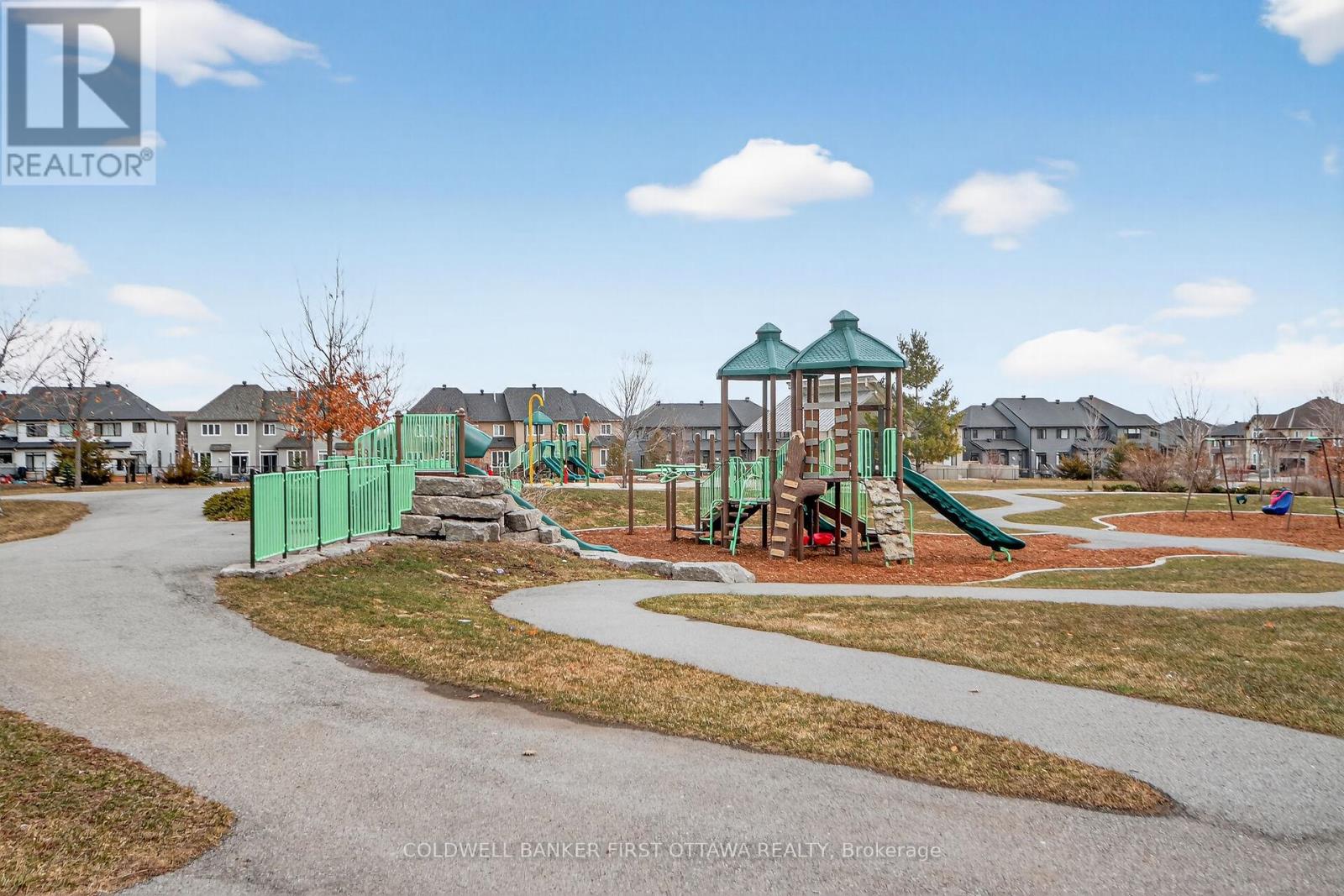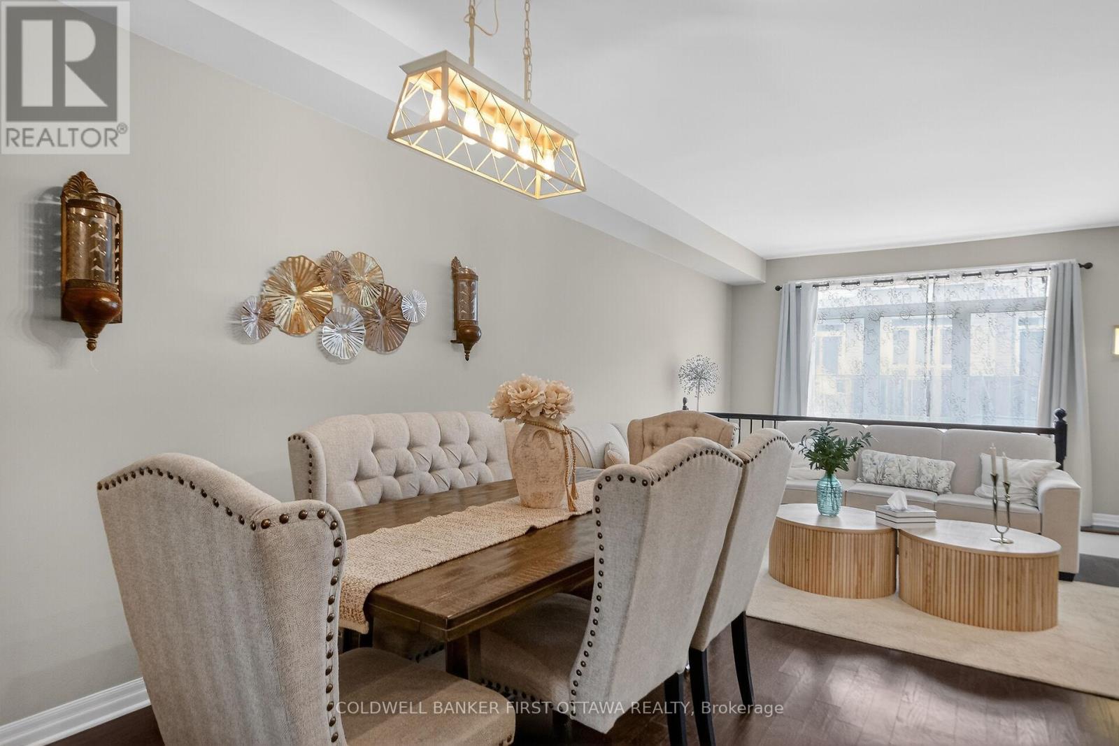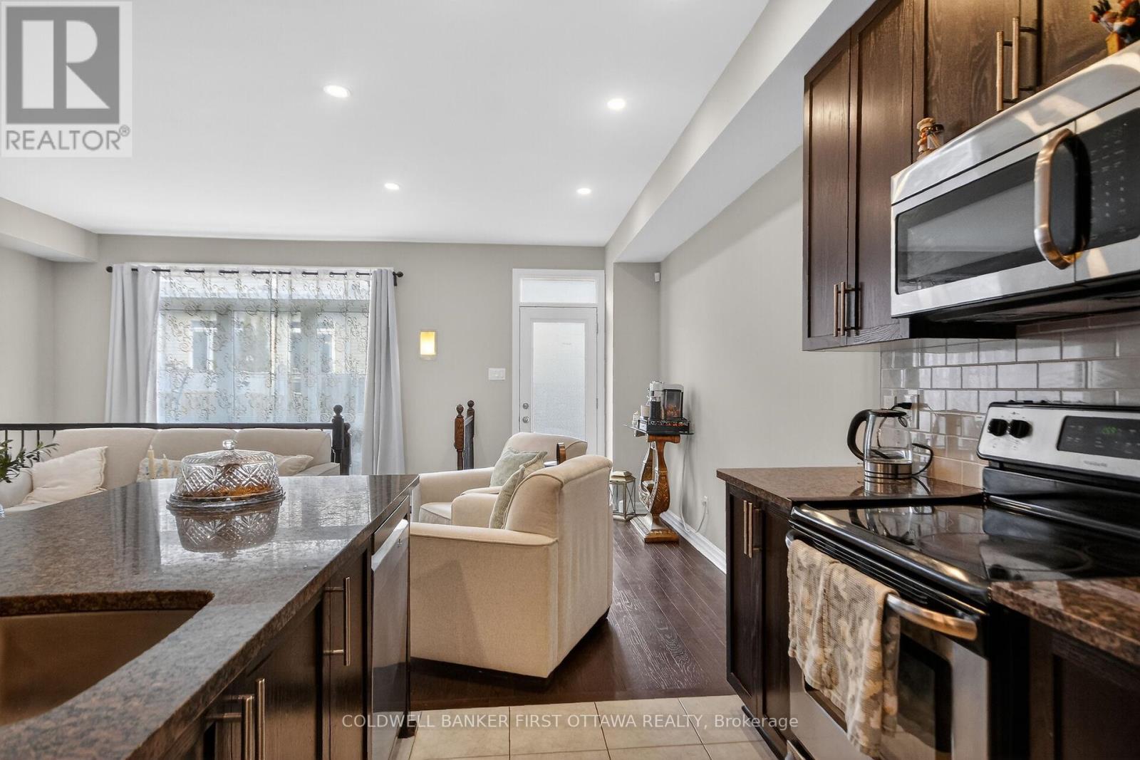 Welcome to this Stunning, Sun-Filled Executive Townhome in the highly sought-after Findlay Creek community. This beautifully designed Claridge Infinity model offers approximately 2,160 sq. ft. of elegant living space, featuring a bright open-concept layout perfect for modern living. The main floor boasts 9-foot ceilings, rich hardwood flooring, and a spacious living area ideal for both relaxing and entertaining. Recently refreshed with a fresh interior paint throughout. The well-appointed kitchen is a true chef's delight, complete with granite countertops, stainless steel appliances, a stylish backsplash, premium cabinetry, and a convenient walk-in pantry. Enjoy casual meals in the breakfast area or host gatherings in the formal dining space. Upstairs, you'll find three generously sized bedrooms and two full bathrooms. The spacious primary suite offers a private ensuite and ample comfort, while the additional bedrooms provide flexibility for family, guests, or a home office. The finished basement adds even more living space with a large family room featuring a cozy gas fireplace-perfect for movie nights or relaxing evenings. Step outside to a fully fenced, low-maintenance backyard with no grass to mow, ideal for easy outdoor enjoyment. Ideally located adjacent to a park, this home is perfect for families with children and offers easy access to outdoor recreation. Recent updates include: Dishwasher (2025), Refrigerator (2022), Upper floor carpet (2026), Basement laminate flooring (2022), Interlock backyard (2021). This home is truly Move-In Ready!!!! (id:64974)