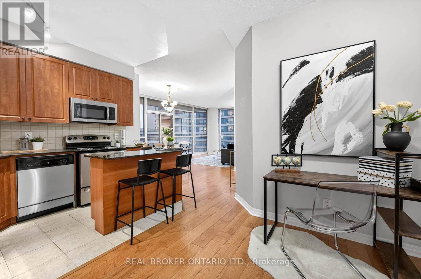Well-maintained, move-in ready corner unit in the heart of Mississauga. 961 sq ft + private balcony with split-bedroom design, 9-ft ceilings and southeast exposure that fills the space with natural light. Open concept living and dining with a kitchen that includes granite countertops, stainless steel appliances, and a centre island that adds both prep space and a spot to gather. The primary bedroom offers his and hers closets and a 3-piece ensuite, while the den provides a practical work-from-home setup. Extensive building amenities include; gym, pool, hot tub, sauna, steam room, party room, media room, kids play area, guest suites, BBQ area, visitor parking, and bike storage. Super walkable location just steps to Square One, Celebration Square, restaurants, and everyday essentials. Easy access to MiWay, GO Transit, and major highways makes commuting simple. A smart move for buyers who value convenience, lifestyle and location. (id:64974)