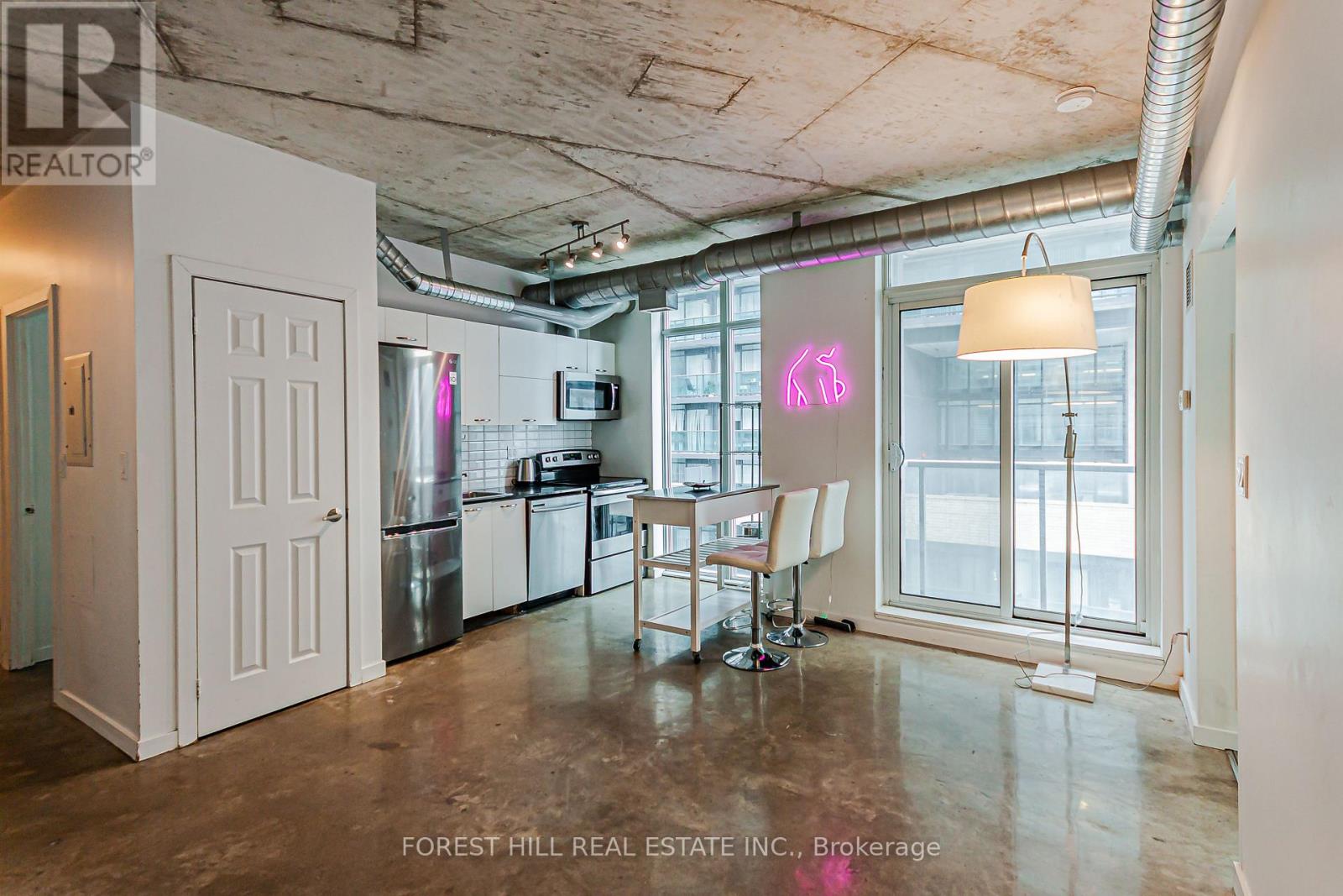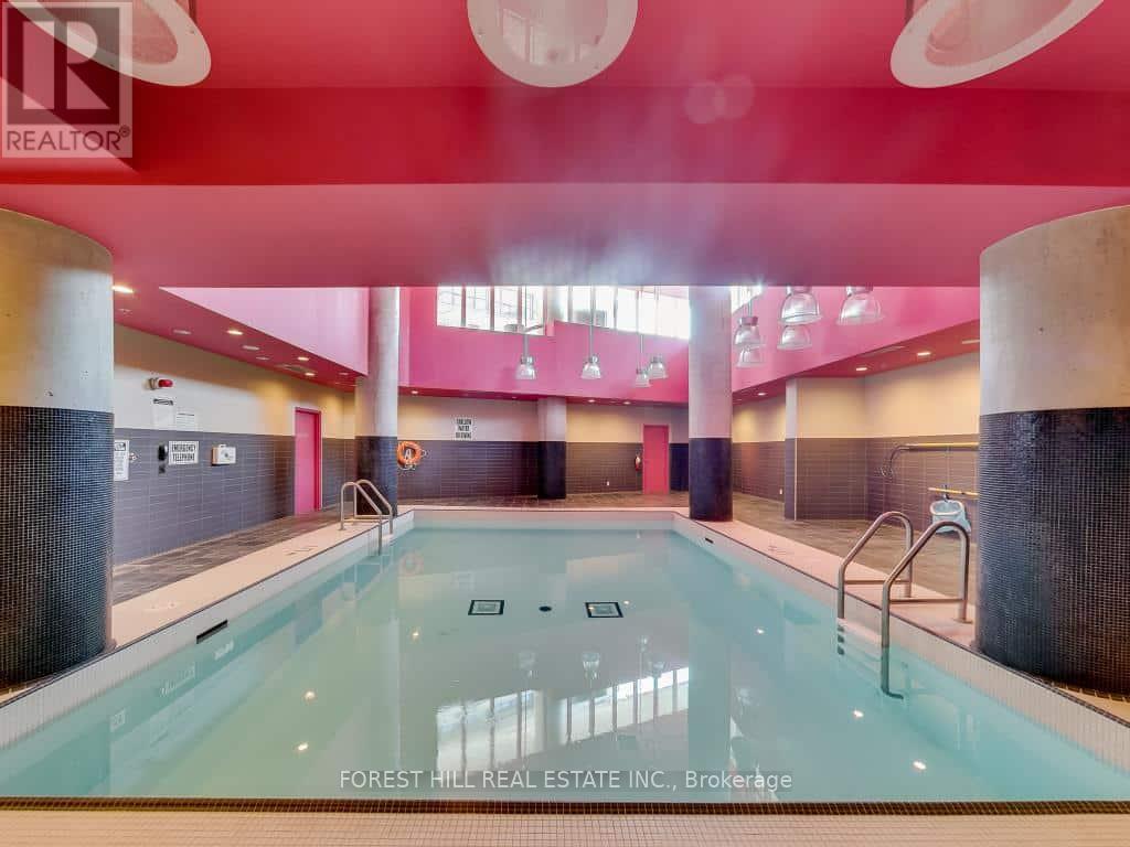 Bright and airy soft loft with polished concrete floors, exposed ceilings, and expansive floor-to-ceiling windows creating a striking industrial aesthetic. Open-concept living space flows seamlessly to a private balcony with lake views. Quiet suite with a desirable split two-bedroom layout, both bedrooms offering windows, closets, and abundant natural light. Updated with stainless steel appliances.Offered partly furnished for added convenience. Live in the heart of vibrant Queen West and enjoy excellent amenities, including a gym and pool. Parking and Locker included. (id:64974)