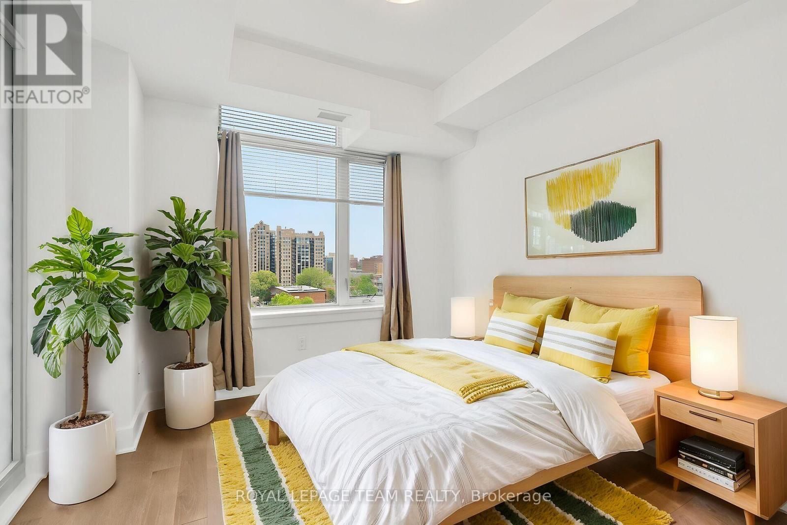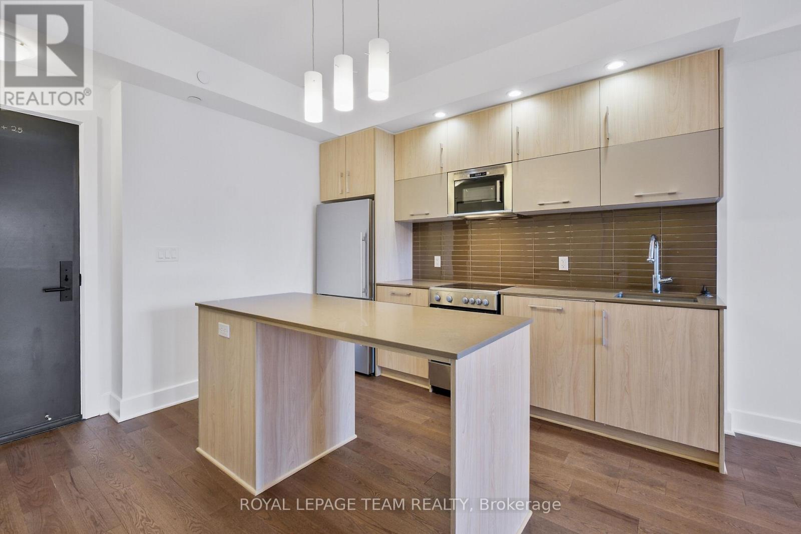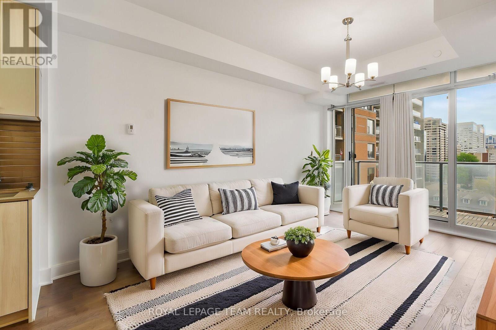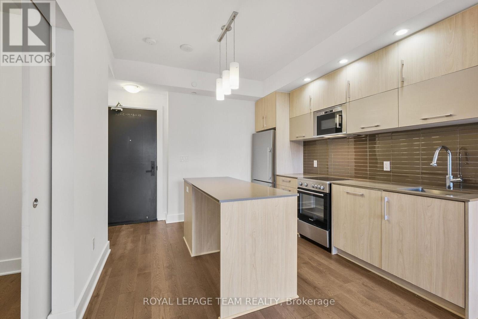 Welcome to this freshly painted, bright & modern, 9th floor, 686 sq ft condo (according to builder floorplans) featuring 1 Bedroom, 1 full Bath, and a versatile flex room. This open-concept layout features a large patio window that fills the space with abundant natural light, complemented by elegant hardwood flooring.The sleek designer Kitchen is equipped with stainless steel appliances, quartz countertops, ample cabinet space and an island with seating; perfect for casual dining or meal prep. A spacious east-facing balcony offers expansive views, ideal for both relaxing and entertaining. The Primary Bedroom is well-proportioned & bright, and features a built-in closet. In the spacious Den/Flex Rm, a sliding pocket door transforms the space into a home office, guestroom or convenient second Bedroom able to accommodate a queen size bed, complete with a closet/built-in storage. Additional highlights include convenient in-unit laundry, personal storage locker and access to top-tier building amenities: indoor pool, outdoor terrace and BBQ, state-of-the-art gym, sauna, party room, meeting spaces and guest suites. Monthly condo fees of $424.34 cover water/sewer, gas, reserve fund contributions, building insurance, management fees. Hydro averages approximately $80/month. Living here has you steps from the O-Train Lyon station, Parliament Hill and so much more! (id:64974)