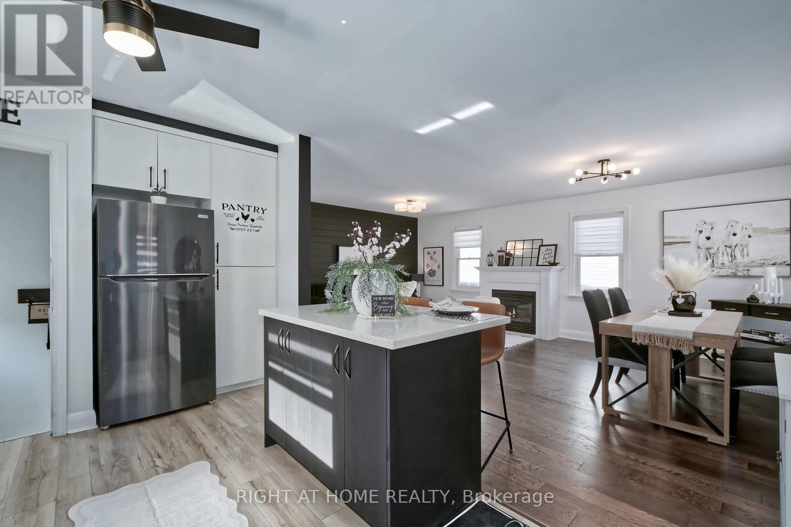 Stunning bungalow offers modern comfort with thoughtful updates throughout. The open-concept main floor is bright and welcoming, featuring updated lighting, ceiling fans, durable flooring, and contemporary finishes that create a stylish yet functional living space. The kitchen is a standout with stunning quartz countertops, black stainless-steel appliances, modern window coverings, and elegant light fixtures that enhance the space. The dining area is ideal for entertaining, highlighted by contemporary light fixtures and an eye-catching shiplap accent wall that adds personality and visual interest. The main bathroom features updated flooring for a clean, modern look and a primary bedroom that offers two closets. The lower level is finished providing versatile living spaces perfect for an office, gym, den, guest room, and rec room. Laundry has spray foam insulation and soundproofing beneath the primary bedroom and along the north back room. A water hookup in the south back room allows for a wet bar or potential second kitchen; wardrobes in this room are included. The entire home was freshly painted top to bottom within the last three years. Outdoor living is equally impressive with a 13' x 20' back deck, a 12' x 12' stone patio, gazebo, perfect for relaxing or entertaining. The fully fenced backyard is well maintained and includes two sheds (one recently purchased). A 10' x 12' pergola included. Parking is available for up to three vehicles. Nearby convenience of shopping, parks, schools, hwys make this location ideal. Pleasure to show!! (id:64974)