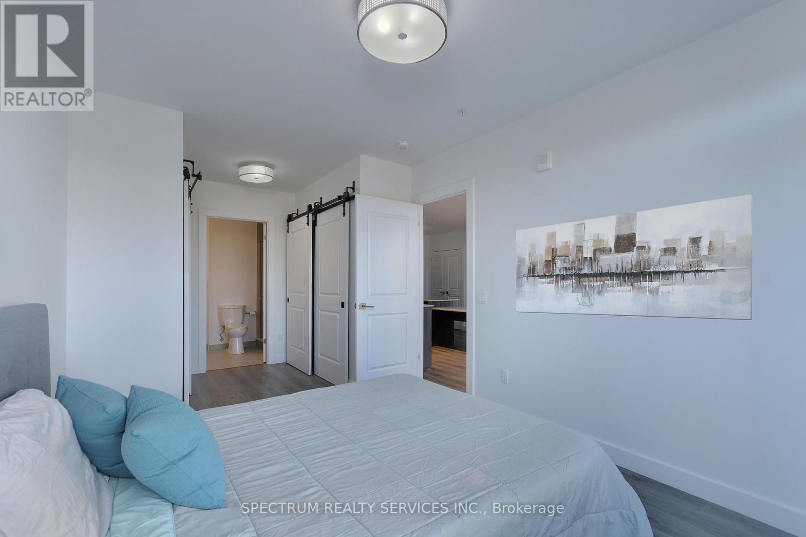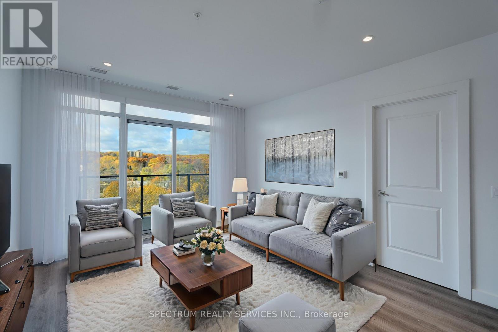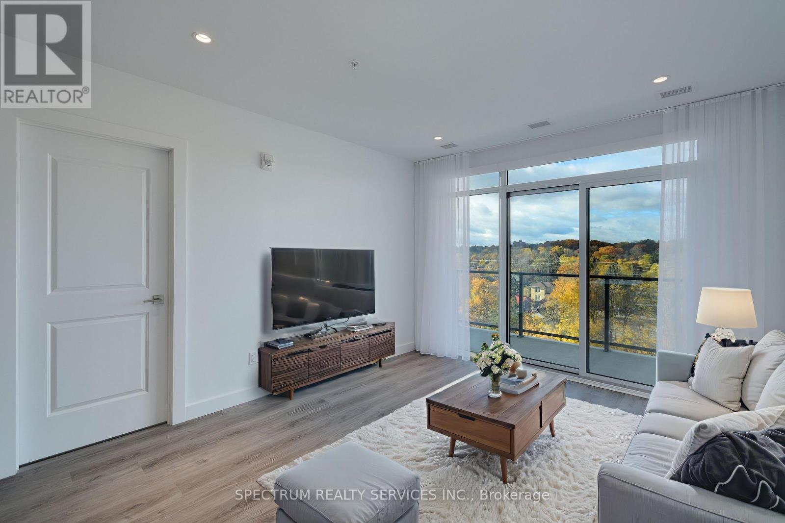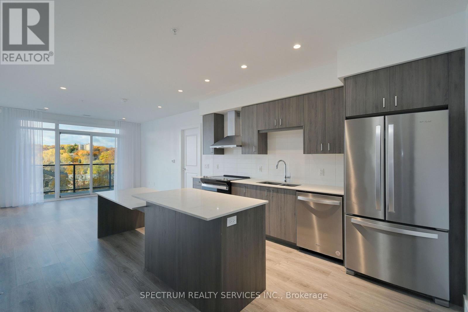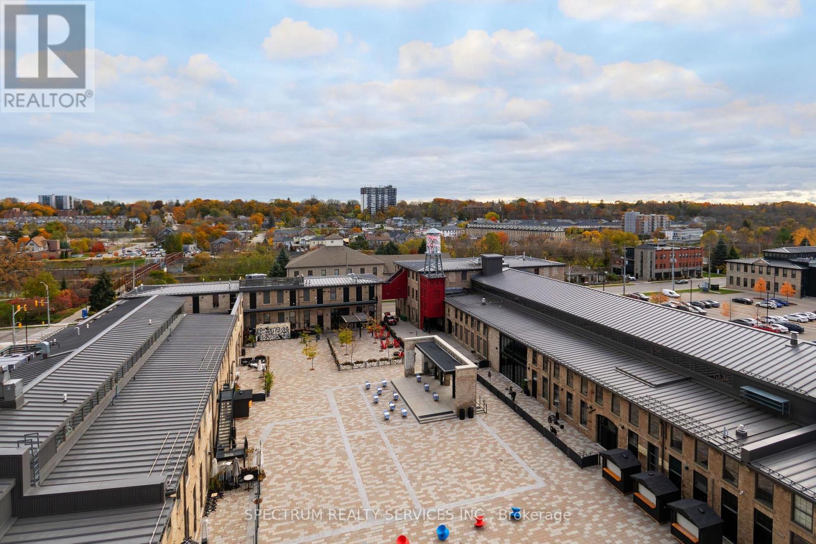 WHERE MODERN COMFORT MEETS HISTORIC CHARM ~ Discover style, comfort, and urban convenience in this beautifully appointed 2-bedroom, 2-bath condo, ideally located in the vibrant second tower beside the Grand River. Designed for the young and the young at heart, you're just steps from Cambridge's premier dining, entertainment, and cultural destinations. Floor-to-ceiling windows flood the suite with natural light while showcasing breathtaking sunset views. Step out onto your private 200 sq. ft. balcony - accessible from both the living room and primary bedroom - creating the perfect outdoor retreat for morning coffee or evening unwinding. The spacious primary suite offers generous closet space and a spa-inspired ensuite complete with dual sinks and a walk-in glass shower. The modern kitchen features upgraded stainless steel appliances, in-suite washer and dryer, and a large quartz island ideal for cooking, gathering, and casual dining. The second bedroom is bright and versatile with ample storage, while the main bath provides a relaxing escape with a deep soaker tub. Residents enjoy exceptional amenities including a fully equipped fitness centre, yoga studio, games room, library, BBQ area, and a stunning rooftop terrace - perfect for entertaining and summer evenings under the stars. Some suite photos have been virtually staged for illustrative purposes only. (id:64974)