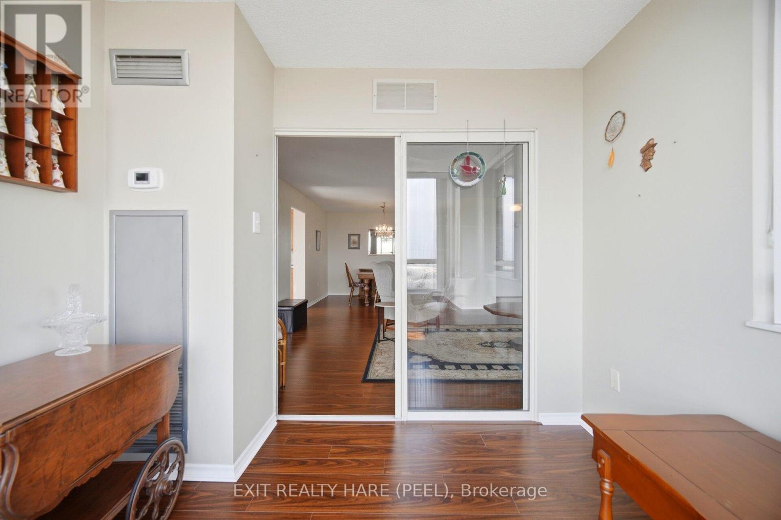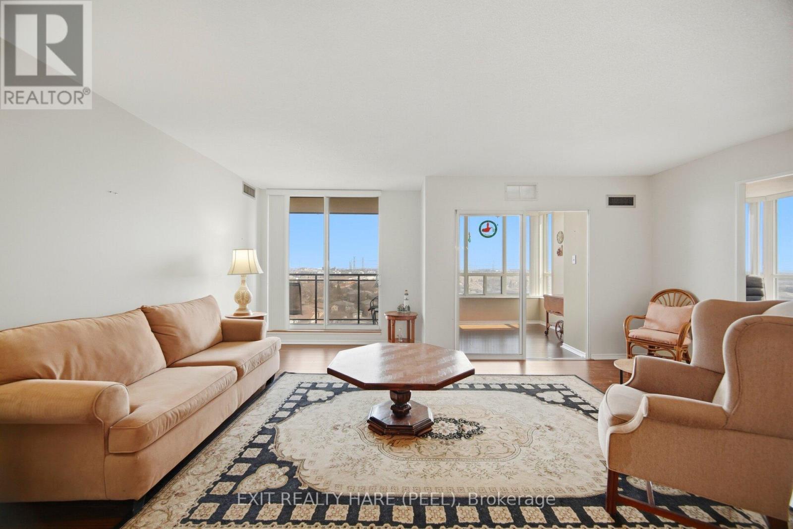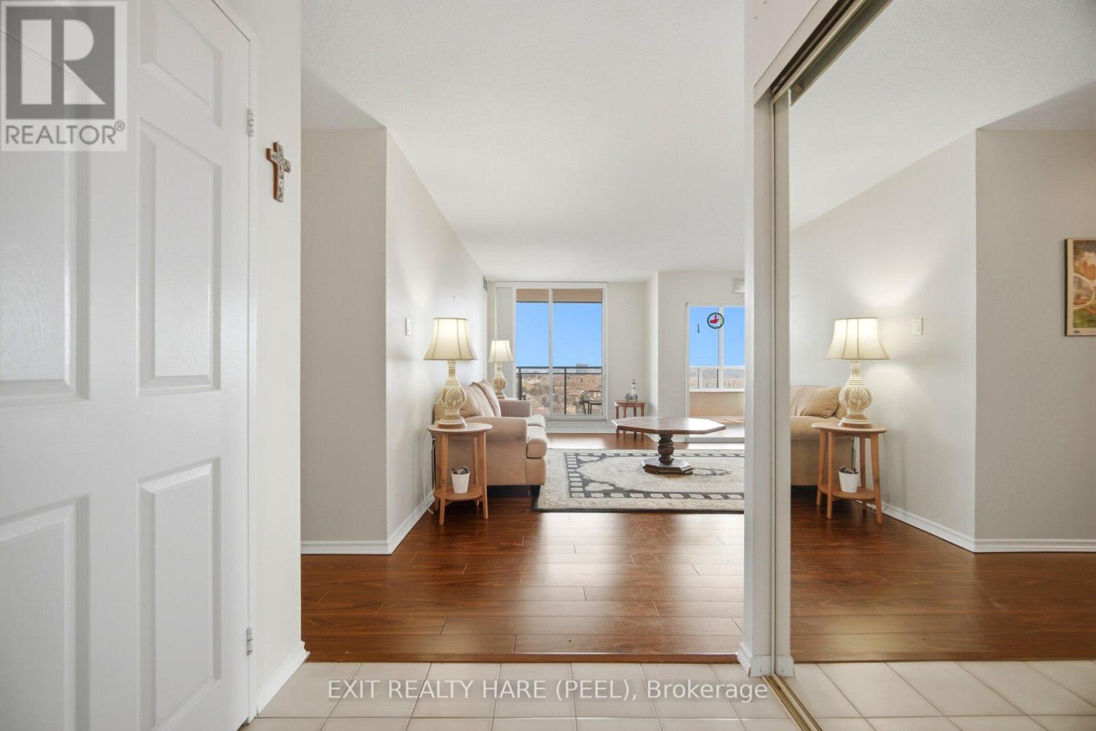 Beautiful "home in the sky" offering stunning views and an expansive layout! This bright and spacious condo features 2 bedrooms, 2 full bathrooms, plus a versatile den and a sun-filled solarium-perfect as an additional living space, reading room, or retreat. Oversized ensuite laundry room, 2 parking spots (Tandem) and locker. Enjoy the large living area with a defined dining space, ideal for entertaining. The eat-in kitchen features newer wood cabinetry and s/s appliances. Updated flooring throughout adds a fresh, modern feel. The primary suite includes updated bathroom cabinetry and an accessible shower, W/I closet. Step out onto your private balcony and take in the view. A true gem with incredible amenities including an outdoor pool, sauna, tennis court, squash courts, shuffle board, library, billiards rm, outdoor BBQ area, putting green, party rm and a fitness room. Close to Shoppers World, Schools, Brampton Transit, Easy Access To 401, 407 and 403 Highways, and Steps To The Coming-Soon Hurontario LRT!! Shows 10+. (id:64974)