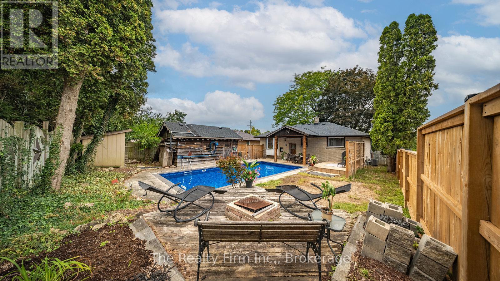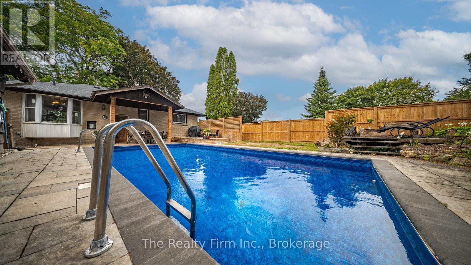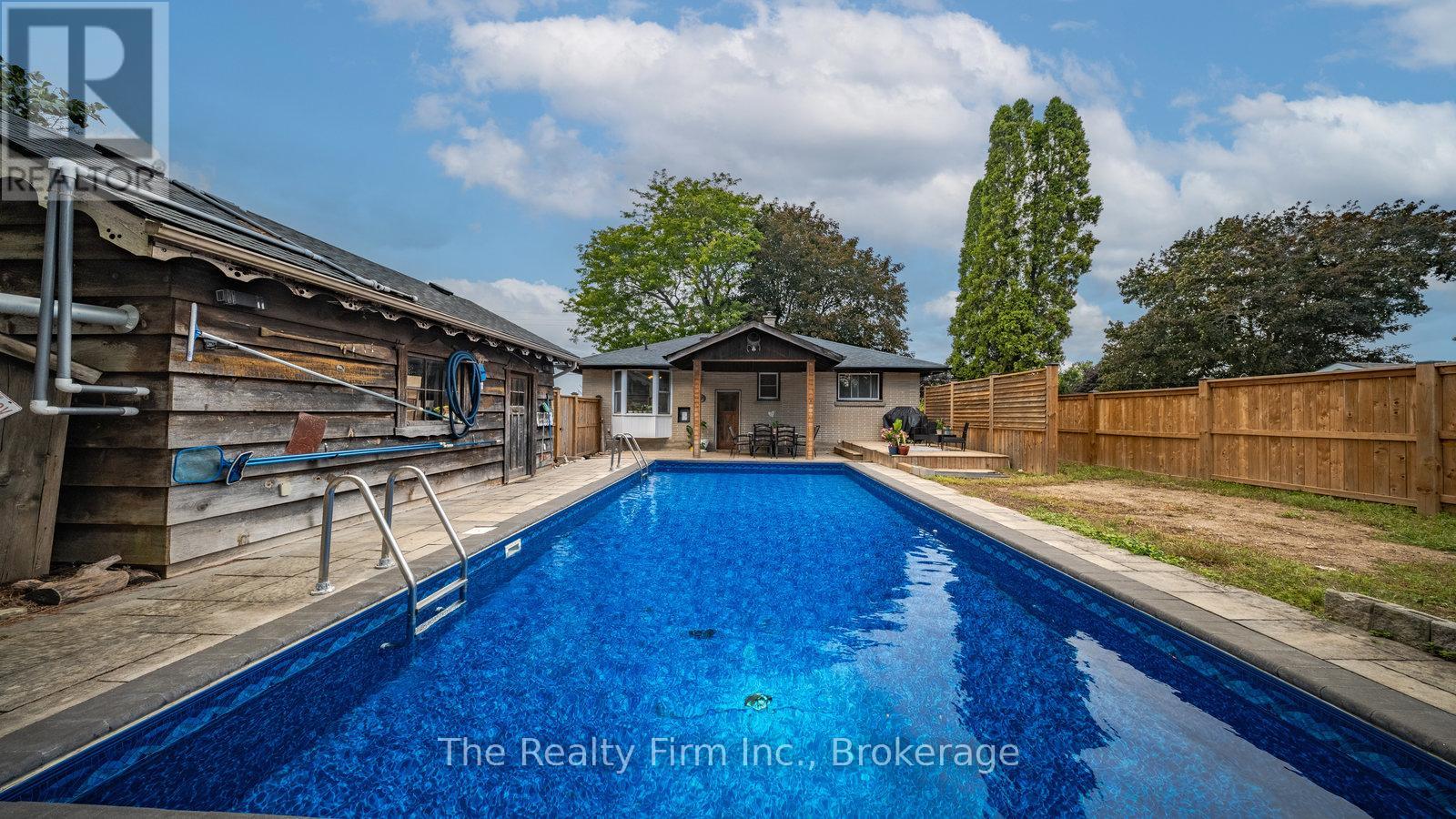 Welcome to a home that feels like a retreat in every season. Thoughtfully maintained and full of warmth, this 4-bedroom (one currently used as a dressing room), 2-bath raised bungalow offers the perfect blend of comfort, character, and modern updates. Inside, gleaming hardwood floors guide you through a welcoming layout that flows easily from the bright living room to the functional kitchen - ideal for everyday living and entertaining alike. The fully finished lower level expands your space with a cozy rec room, a charming saloon-inspired bar, an additional bedroom and bath, plus flexible space for a home office, gym, or playroom. Mechanical updates throughout provide peace of mind, while the home's thoughtful design invites connection and comfort year-round. Outdoors, enjoy a private yard with a covered porch overlooking a sparkling inground pool, detached garage, and plenty of room to gather and host summer get-togethers or quiet evenings by the fire pit. Perfectly positioned in a family-friendly neighbourhood just steps from Eastdale Public School, beautiful parks, major shopping, and easy access to the 401 and 403, this is a place where community, convenience, and lifestyle come together effortlessly. Come and see it for yourself - you'll feel right at home. (id:64974)