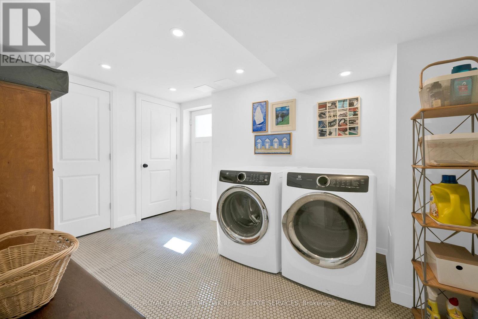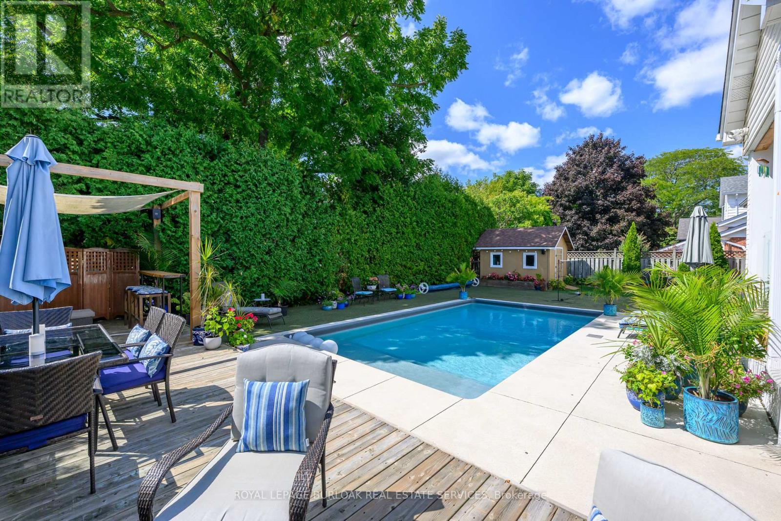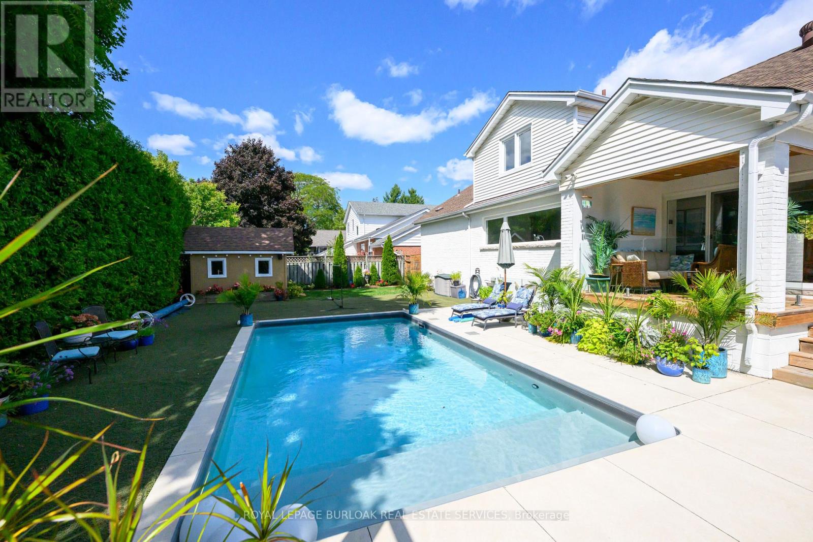 Enjoy Paradise at home w/family & friends in this entertainer's backyard featuring a gorgeous heated saltwater inground pool. This beautiful 5 bedrm (2 on main flr), 3 full bathrm home w/finished basement on an 80ft wide lot, has 3500sqft of exceptional finished living space & has been renovated top to bottom in '23. The main level includes a lrg kitchen w/endless cupboard space, 10ft island w/breakfast bar, quartz CTs, SS appl., & lrg picture window overlooking the yard & pool, spacious living rm w/bay window & gas FP, dining area w/sliding doors to the covered deck w/frameless glass railing leading to the private & beautiful yard w/ a heated 14x26ft inground saltwater pool built in '21, lots of decking & seating space, mature trees, & gas bbq hookup. The main floor is completed w/2 bedrms (can also be a primary bedrm, office or den if prefer), & a 4pce bathrm w/glass panel shower. Tthe upper level includes a very lrg primary bedrm w/dble closets & private 420sqft rooftop sundeck, 2 other spacious bedrms, laundry, & a 4pce bathrm w/tub & shower. The lower level includes a lrg rec rm, spacious media rm/library, 3pce bath w/glass enclosed shower, 2nd laundry rm, workshop, storage rm, & a separate entrance. This home also has qlty wideplank hardwood floors on all 3 levels, qlty light fixtures, tonnes of pot lights, CVAC, fresh paint T/O in '24, interlocking stone dble driveway w/parking for 6, plus a dble garage, lrg front porch & sitting area, & low maintenance gardens. Located in prestigious South Aldershot on a quiet, tree-lined street, this family-friendly neighbourhood is beautiful, & close to amazing amenities including the lake, LaSalle Park & Marina, other parks, qlty schools, highways, the GO, RBG, golf, rec centre, hospital, shops, dining, & more. The basement also has potential for rental income or an inlaw suite w/the separate entrance, separate laundry, full bathrm, & lots of living space. Don't hesitate & miss out! Welcome Home! (id:64974)