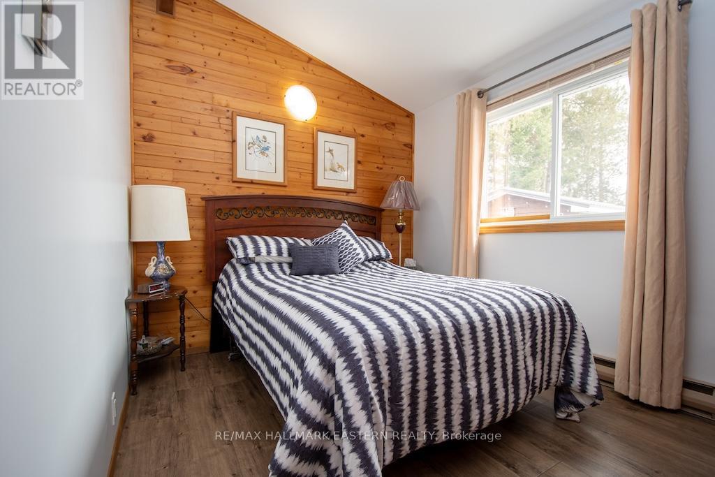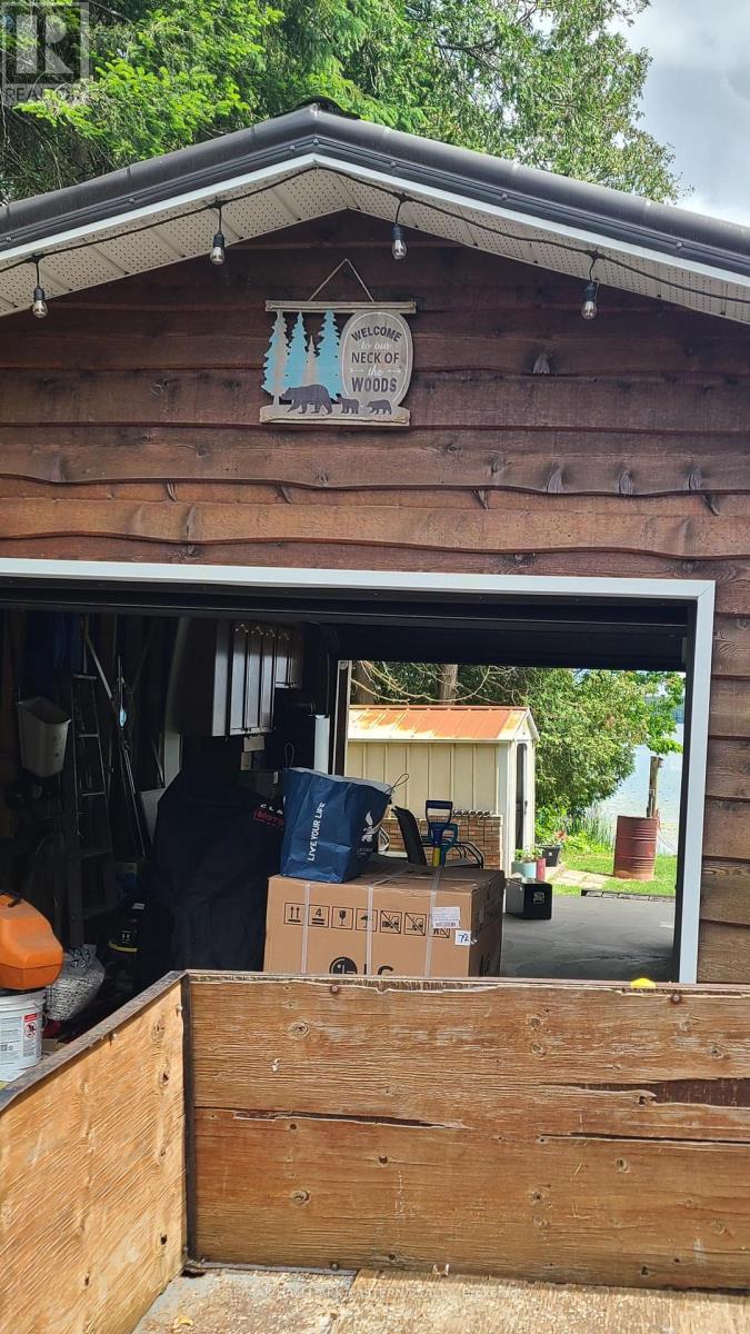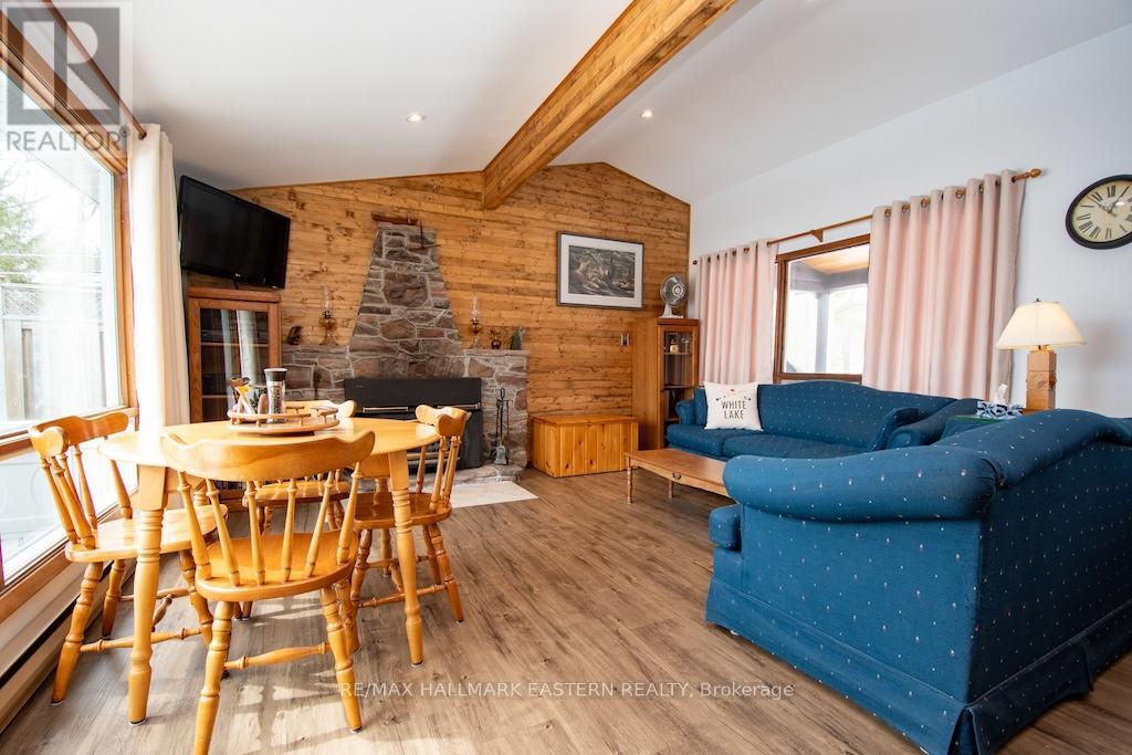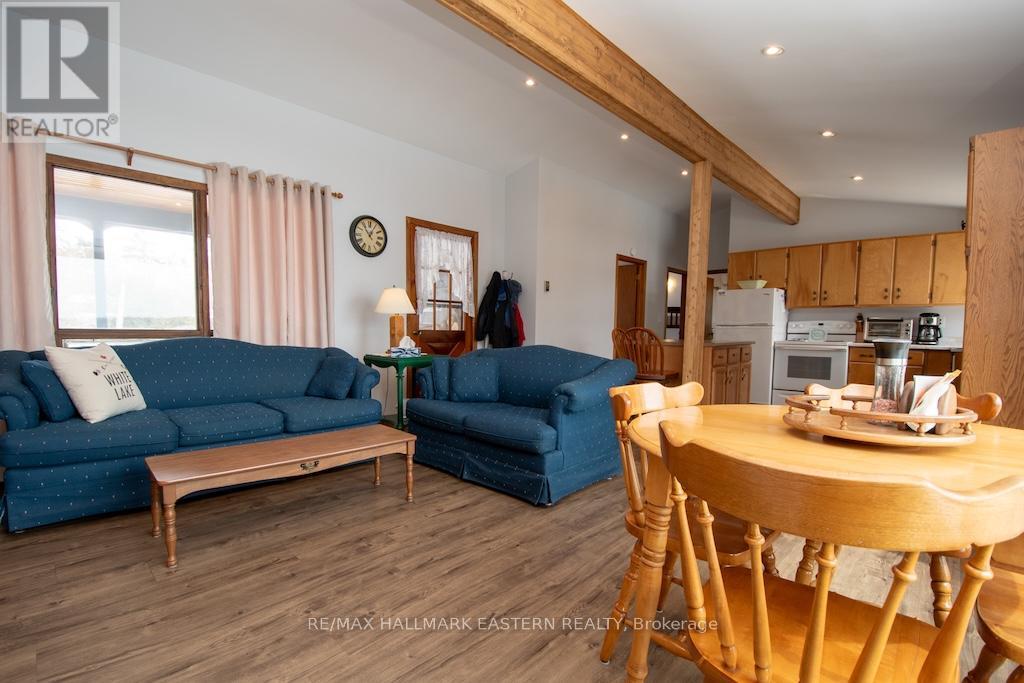 Quaint well-kept year-round home or cottage on beautiful White Lake sitting on a private level property with panoramic lake views offering 3 bedrooms. This home is turn-key ready and features recent upgrades such as new flooring throughout and a steel roof. Front covered deck and rear patio to enjoy lakeside living. Open concept kitchen, dining area and living room which features a beautiful stone fireplace. Extra large window in the living room for stunning lake views year-round. Matching appliances with eat-in kitchen island. Includes modernized bathroom with updated walk-in shower. Large detached dual-door garage/boathouse for parking or storage of water toys. The garage offers additional covered patio space to enjoy the serene surroundings. (id:64974)