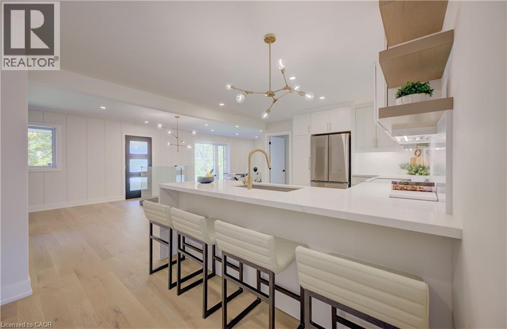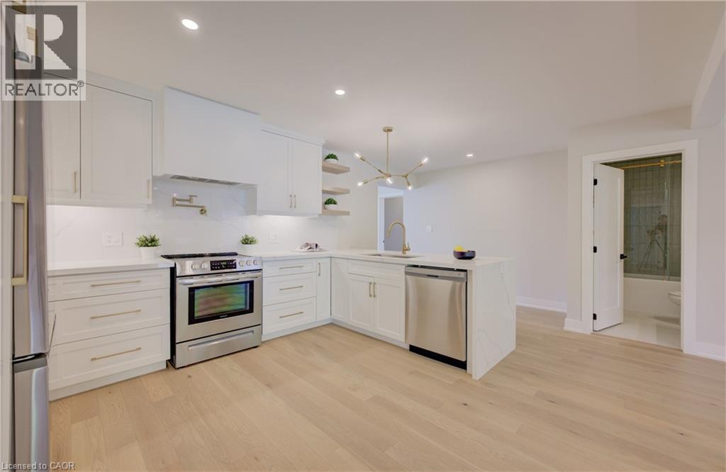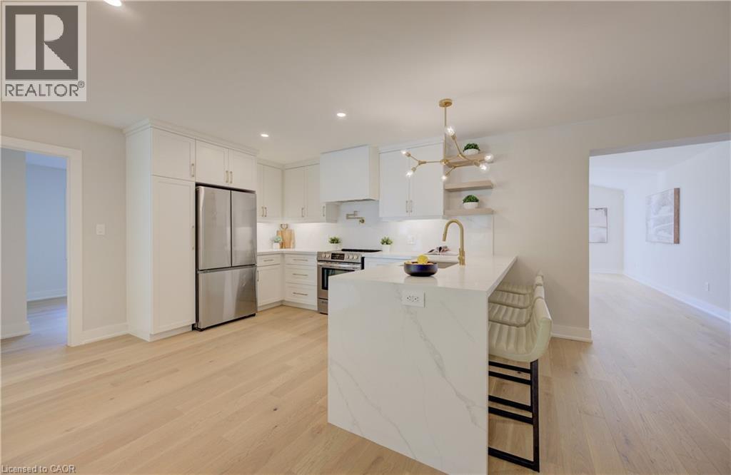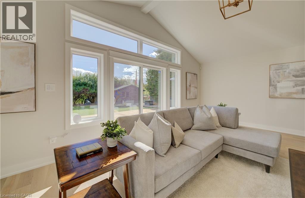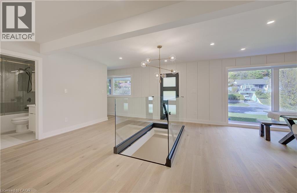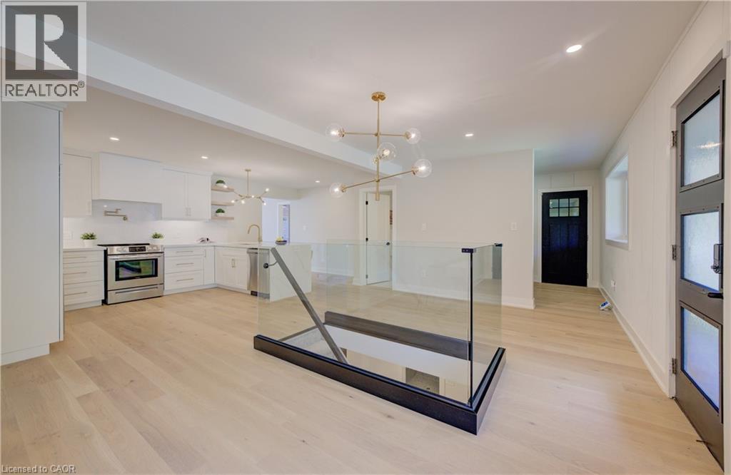 Welcome to 919 Union Street, a stunning, fully renovated luxury bungalow in the heart of Kitchener. Set on a generous 60x135 ft lot, this 4-bedroom, 3-bathroom home offers over 2,140 sq ft of beautifully finished main floor living space, thoughtfully designed for comfort, elegance, and function. Inside, light oak flooring sets a warm, contemporary tone throughout. The custom Barzotti kitchen is a showpiece, featuring quartz waterfall countertops, a full slab backsplash, designer brass fixtures, and timeless cabinetry. The open-concept layout flows seamlessly into the dining and living areas, creating a welcoming and functional space for daily life or entertaining. At the rear of the home, a breathtaking living room steals the spotlight with its 12-foot vaulted ceiling and floor-to-ceiling windows, perfectly positioned to capture serene morning sunrises and private backyard views. A modern glass staircase leads to the finished lower level, where a spacious rec room, second laundry room, and generous storage areas offer exceptional versatility for everyday living. The elevated design continues below grade, with the same attention to detail and quality finishes found throughout the home. The newly added additional full width basement is fully framed, insulated, electrical and pot lights completed to add 2 additional bedrooms and a large living room space. Large format egress windows and custom window wells allow for extra natural light. Living room and Primary bedroom walkouts to a brand-new deck and a fully enclosed backyard oasis with no rear neighbours, offering privacy and a peaceful retreat. Located steps from scenic walking trails and just minutes from major highway access, 919 Union Street is not just a home, it’s a lifestyle. Close attention to every detail was the theme for this renovation, this is essentially a new home in the heart of the city (id:64974)