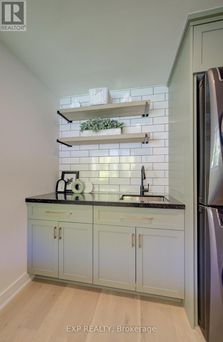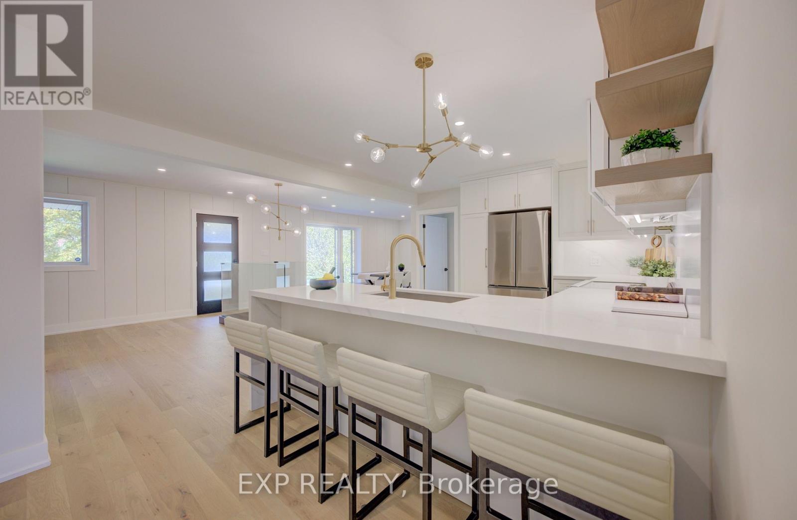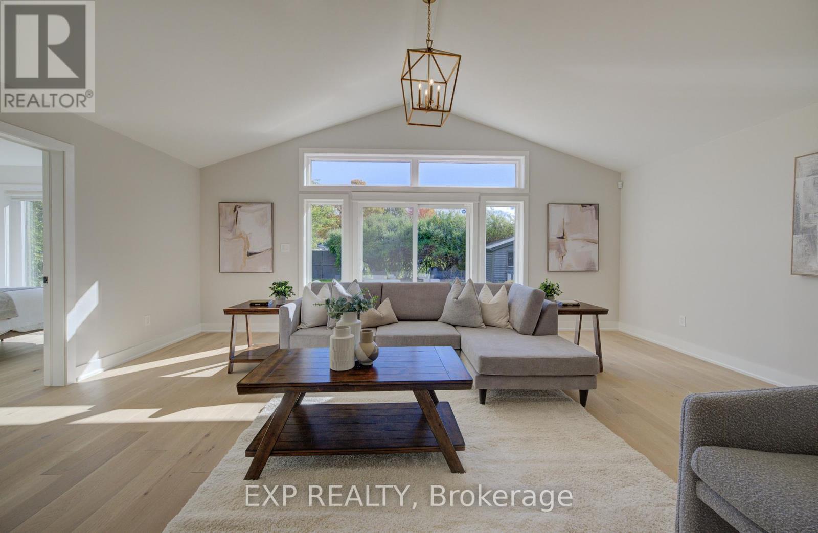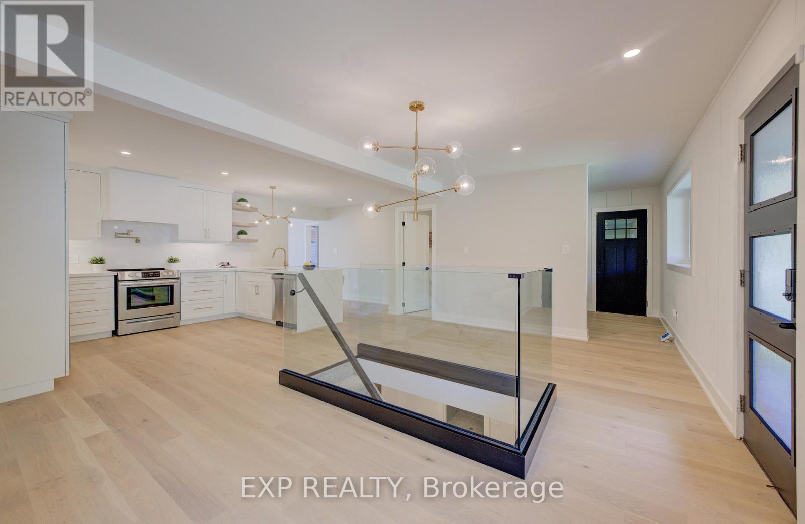Welcome to 919 Union Street, a stunning, fully renovated luxury bungalow in the heart of Kitchener. Set on a generous 60x135 ft lot, this 4-bedroom, 3-bathroom home offers over 2,140 sq ft of beautifully finished living space, thoughtfully designed for comfort, elegance, and function.Inside, light oak flooring sets a warm, contemporary tone throughout. The custom Barzotti kitchen is a showpiece, featuring quartz waterfall countertops, a full slab backsplash, designer brass fixtures, and timeless cabinetry. The open-concept layout flows seamlessly into the dining and living areas, creating a welcoming and functional space for daily life or entertaining.At the rear of the home, a breathtaking living room steals the spotlight with its 12-foot vaulted ceiling and floor-to-ceiling windows, perfectly positioned to capture serene morning sunrises and private backyard views.A modern glass staircase leads to the finished lower level, where a spacious rec room, second laundry room, and generous storage areas offer exceptional versatility for everyday living. The elevated design continues below grade, with the same attention to detail and quality finishes found throughout the home.Step outside to find a brand-new deck and a fully enclosed backyard oasis with no rear neighbours, offering privacy and a peaceful retreat. Located steps from scenic walking trails and just minutes from major highway access, 919 Union Street is not just a home, it's a lifestyle. Renovated top to bottom and truly move-in ready, this is Kitchener real estate at its finest. (id:64974)