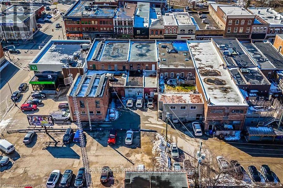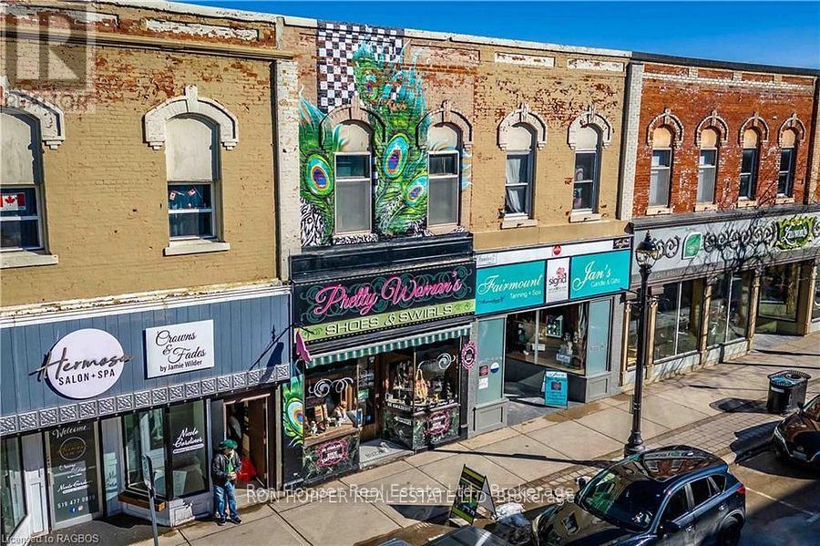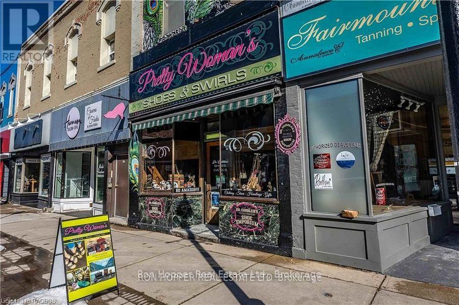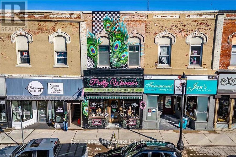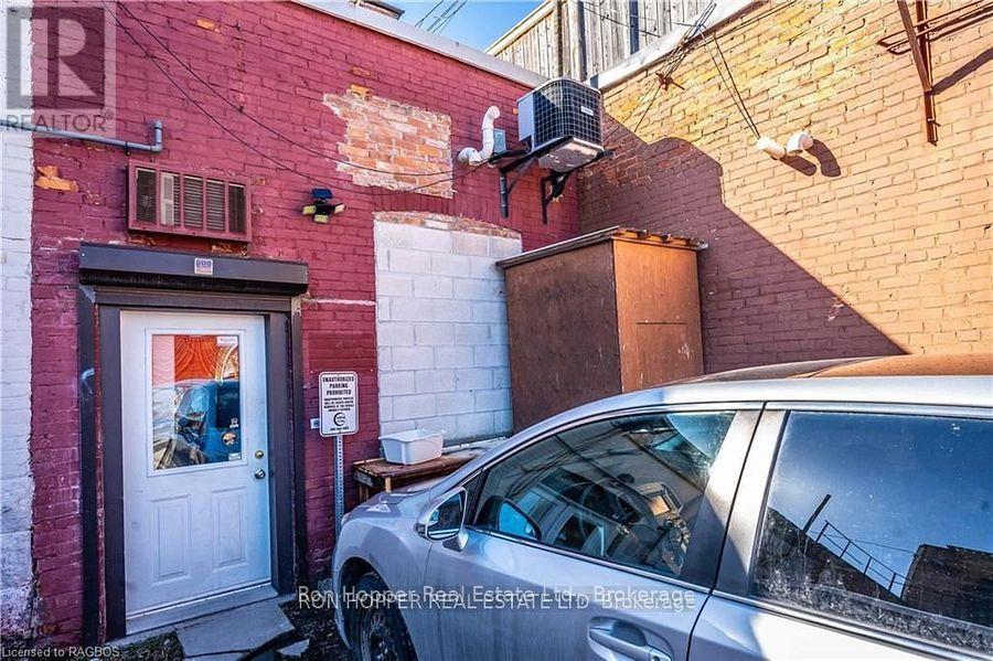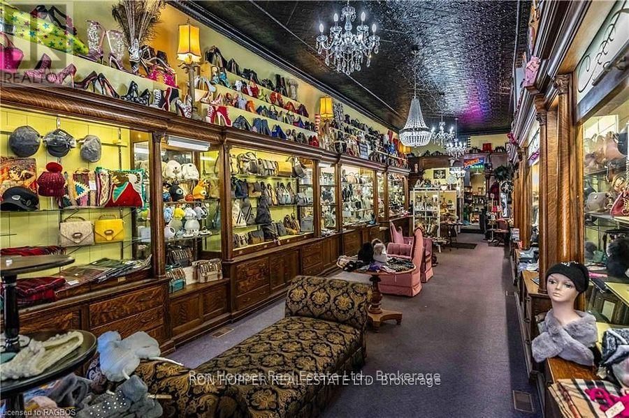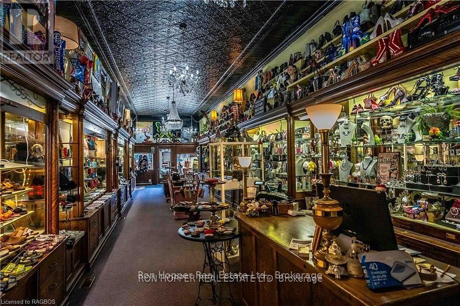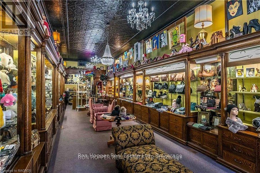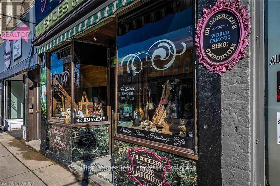 Building for sale. Notable commercial store front located in the heart of downtown Owen Sound. The quarter cut oak built-in cabinetry, tin ceilings, built-in safe and the hardwood floors exude elegance and are the perfect back drop to any retail store. There is private storage space at the rear with a secured entrance from the four private parking spaces. The full dry basement has a two piece bath and plenty of dry storage space with built-in shelving. Parking at the rear allows easy access to your storefront. The second level has potential for two residential units, just needing some tlc to add some extra income. Front Roof 2004. Rear Roof 2014, Gas Furnace & Central Air 2023. (id:64974)
