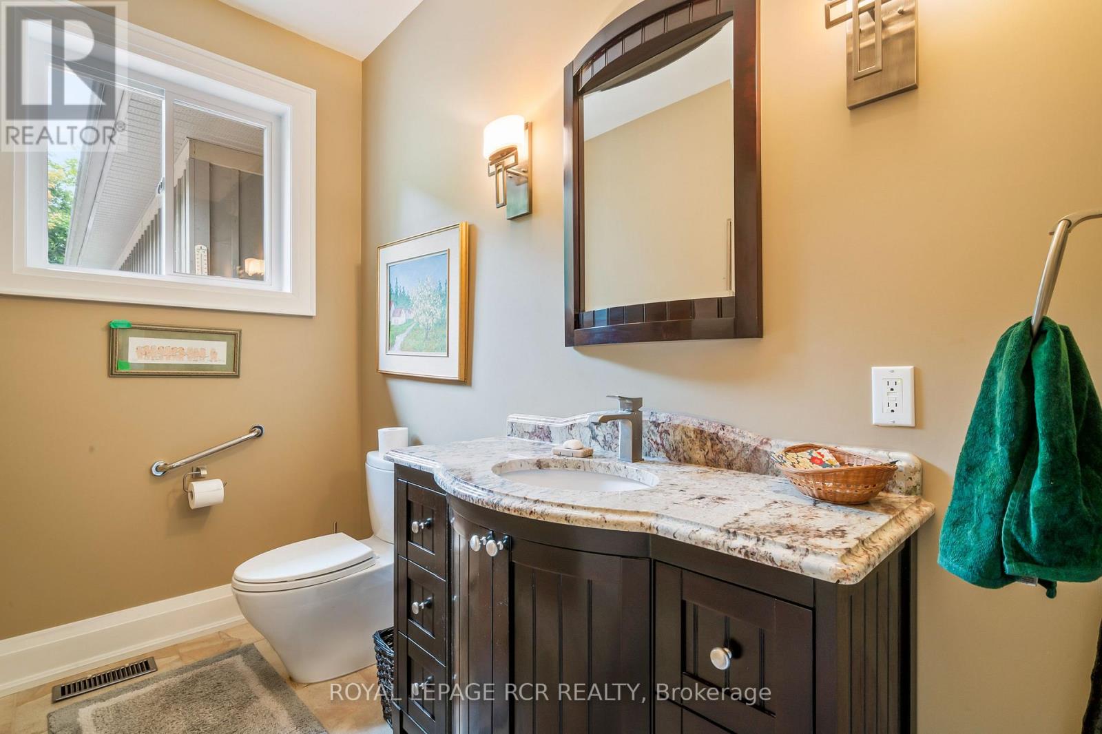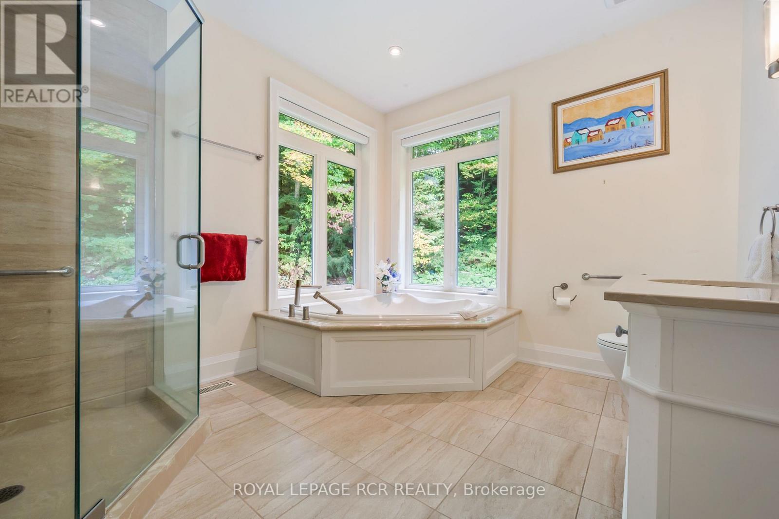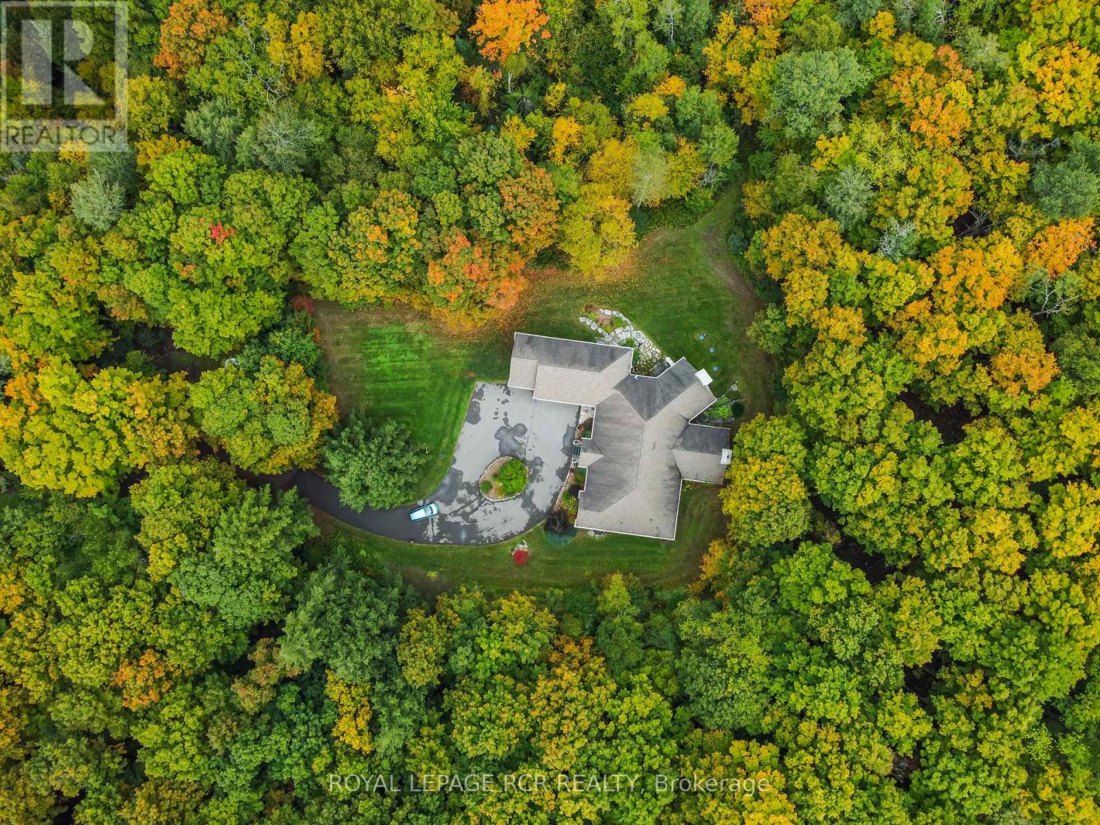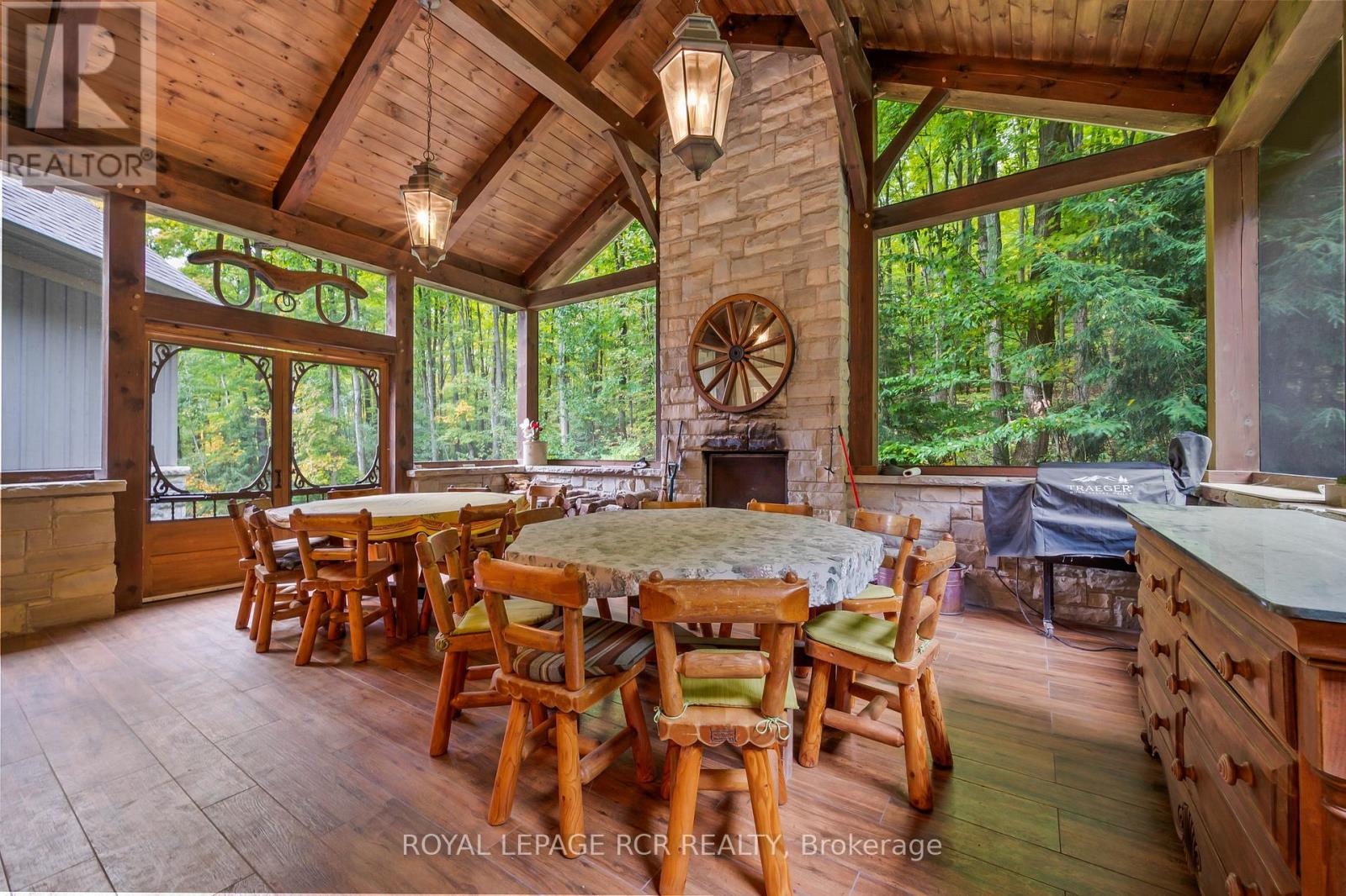 Set on 44.49 acres of rolling land with trails, a spring-fed pond, and the Eramosa Creek running through, this custom-built residence is a rare retreat where quality and comfort meet the beauty of nature. Thoughtfully designed with over 4,500 square feet of total living space, it offers 3 bedrooms, 3 bathrooms, and an oversized 3-car garage. Inside, every detail speaks to craftsmanship: hardwood and ceramic flooring, a chef's kitchen with granite counters, stainless steel appliances, custom cabinetry, and a generous centre island. The soaring great room features cathedral ceilings and a striking gas fireplace, where walls of windows bring the outdoors in and frame panoramic views. A highlight of the home is the expansive screened-in sunroom, complete with its own fireplace, a perfect spot to enjoy summer evenings or crisp autumn mornings surrounded by nature. The primary suite is designed as a private retreat, offering a walk-in closet and a luxurious 4-piece ensuite with a soaker tub tucked beneath corner windows, where you can unwind while gazing out at the trees and sky. The fully finished lower level provides a wealth of additional living space, warmed with in-floor heating and brightened by above-grade windows. A walkout extends the living space outdoors, offering easy access to the acreage beyond. Geothermal heating, natural gas, and efficient in-floor systems add to the home's comfort and sustainability, while a Generac backup generator provides peace of mind during any power interruption. With previous GRCA approval for a future workshop, the possibilities here are as impressive as the setting itself. (id:64974)