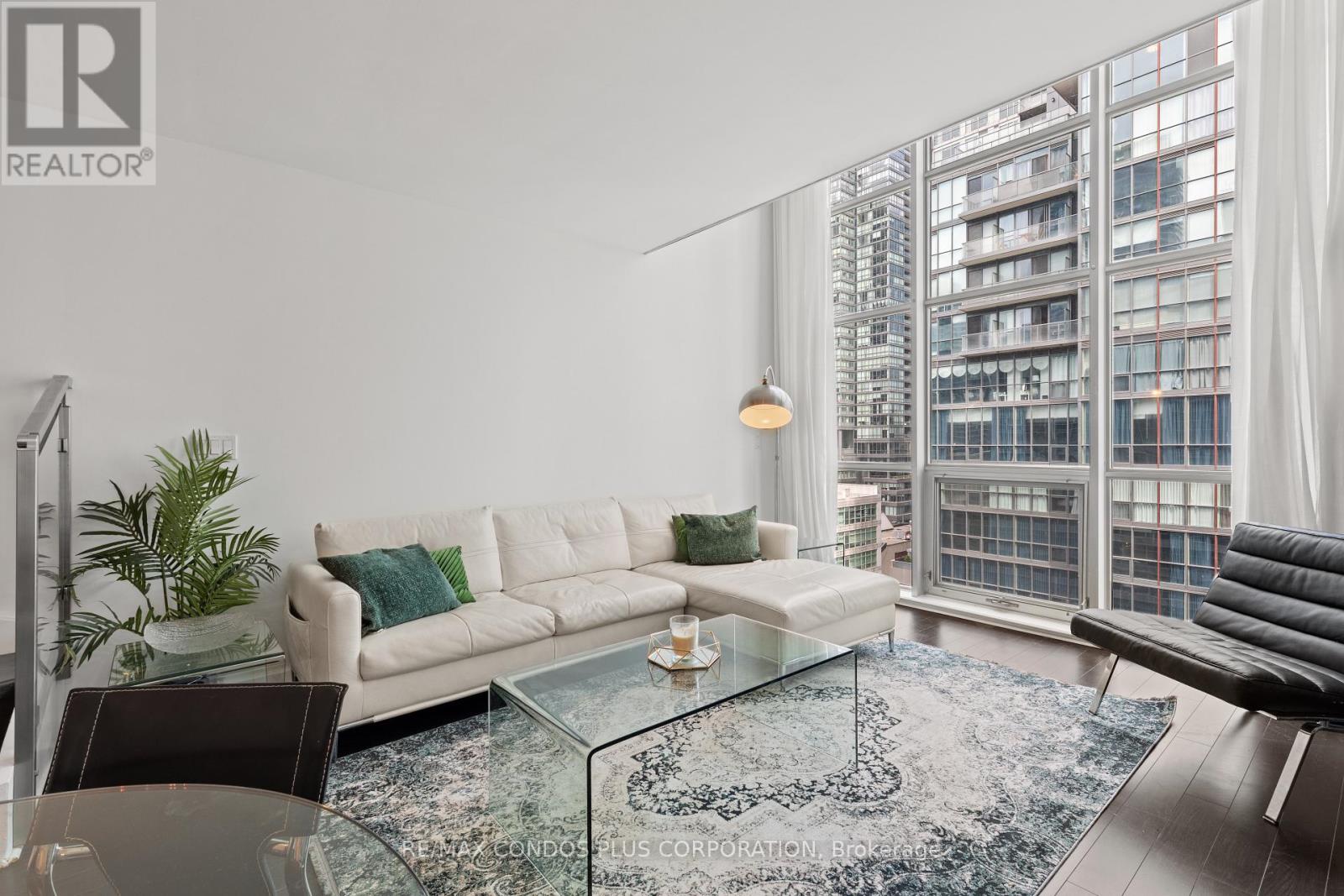 Beautiful, modern, 2-storey loft-style unit in the sought-after Soho Metropolitan complex! This well maintained, large, 1-bedroom+Den is full of natural light with expansive double-storey windows and open-concept layout! This space is generously proportioned for easy living, not a typical shoe-box! Upgrades include glass stair railing, smooth ceilings (no ugly popcorn!), updated powder room, engineered hardwood flooring and fresh paint throughout! Fantastic location in the heart of King West, walk to everything! Steps to transit, shopping, dining, theatre, Entertainment District, Rogers Centre, and more! Amenities include 24-Hr Concierge, Gym, Indoor Pool, and Rooftop Terrace with BBQ! (id:64974)