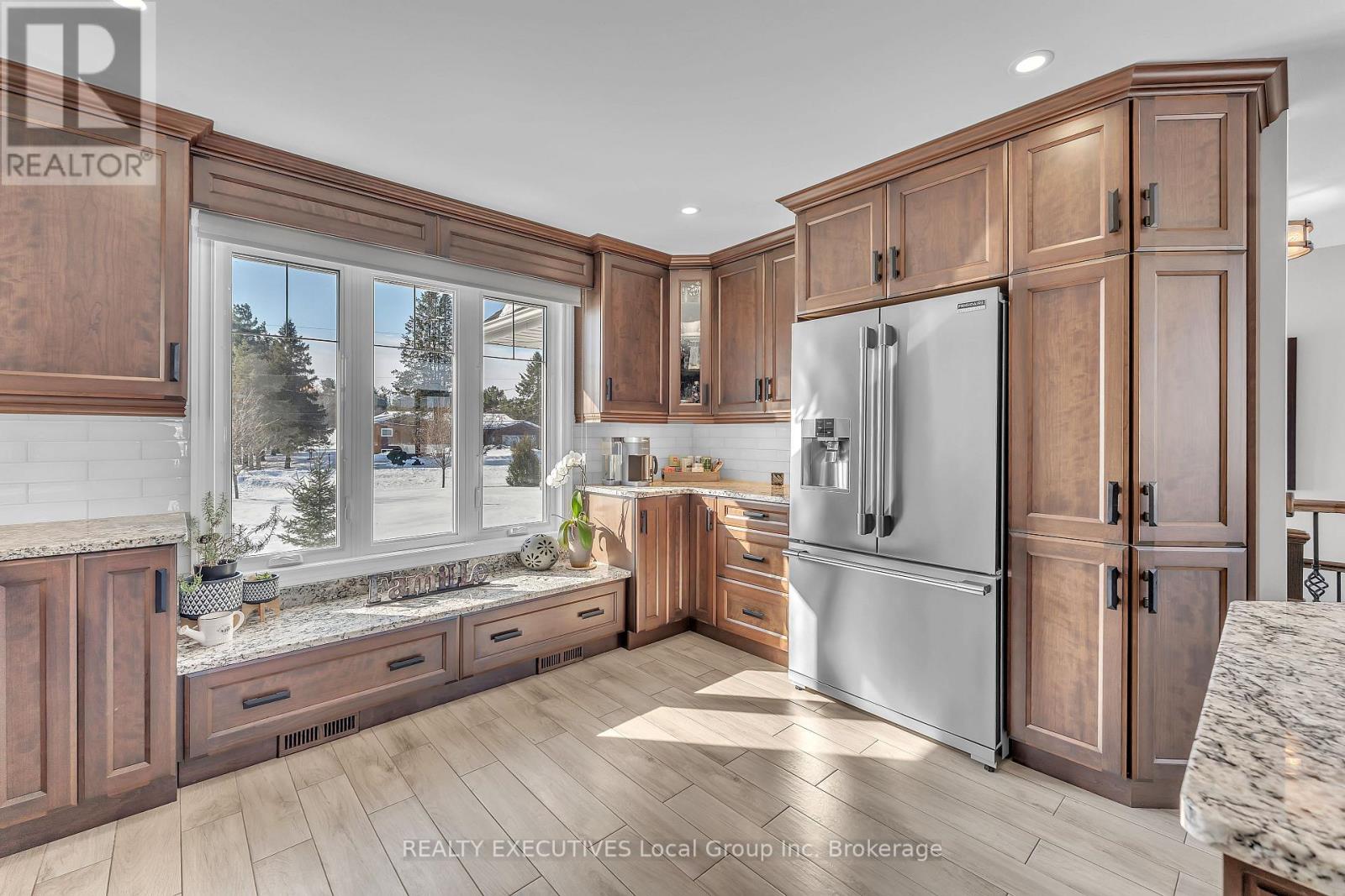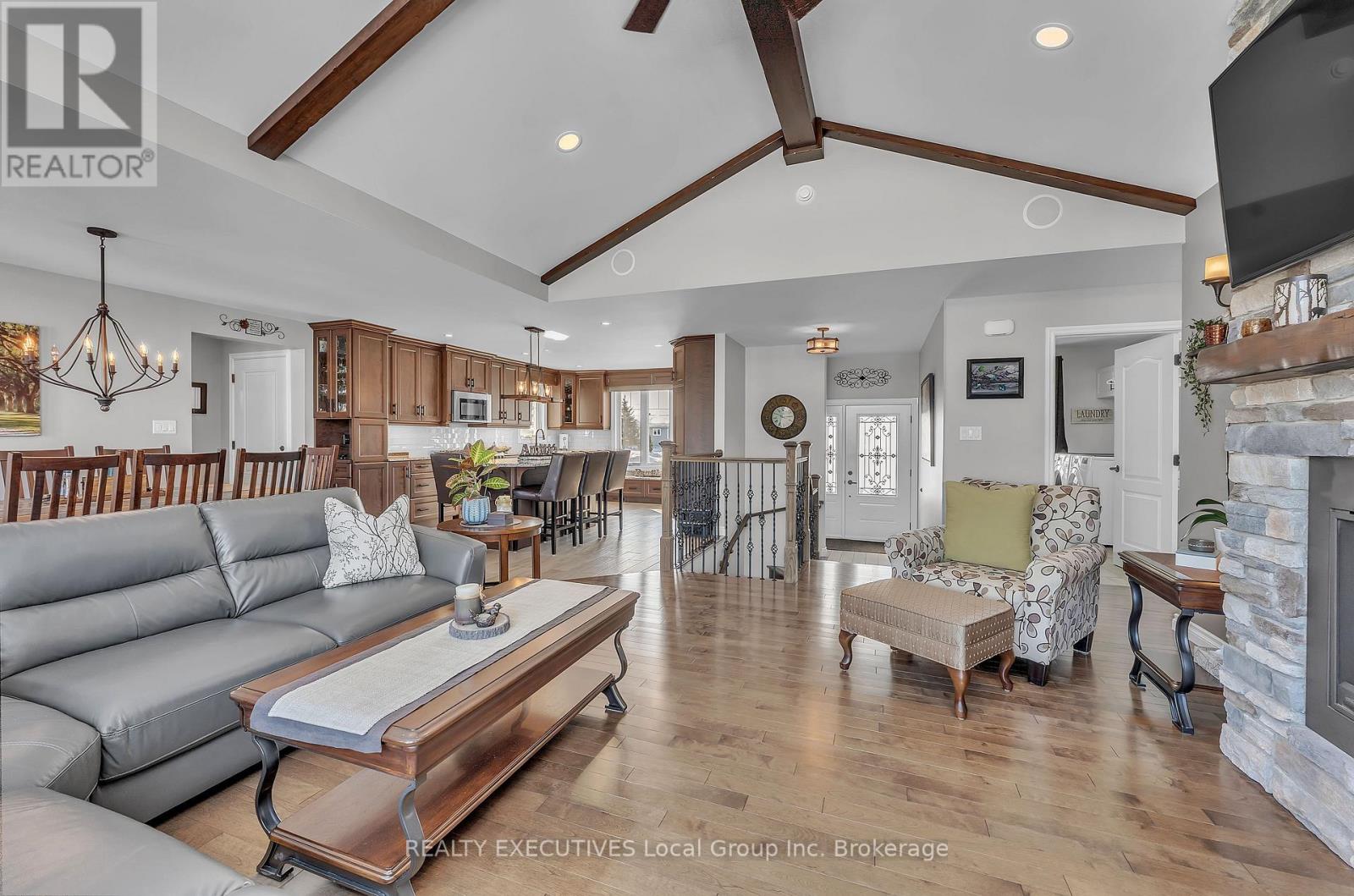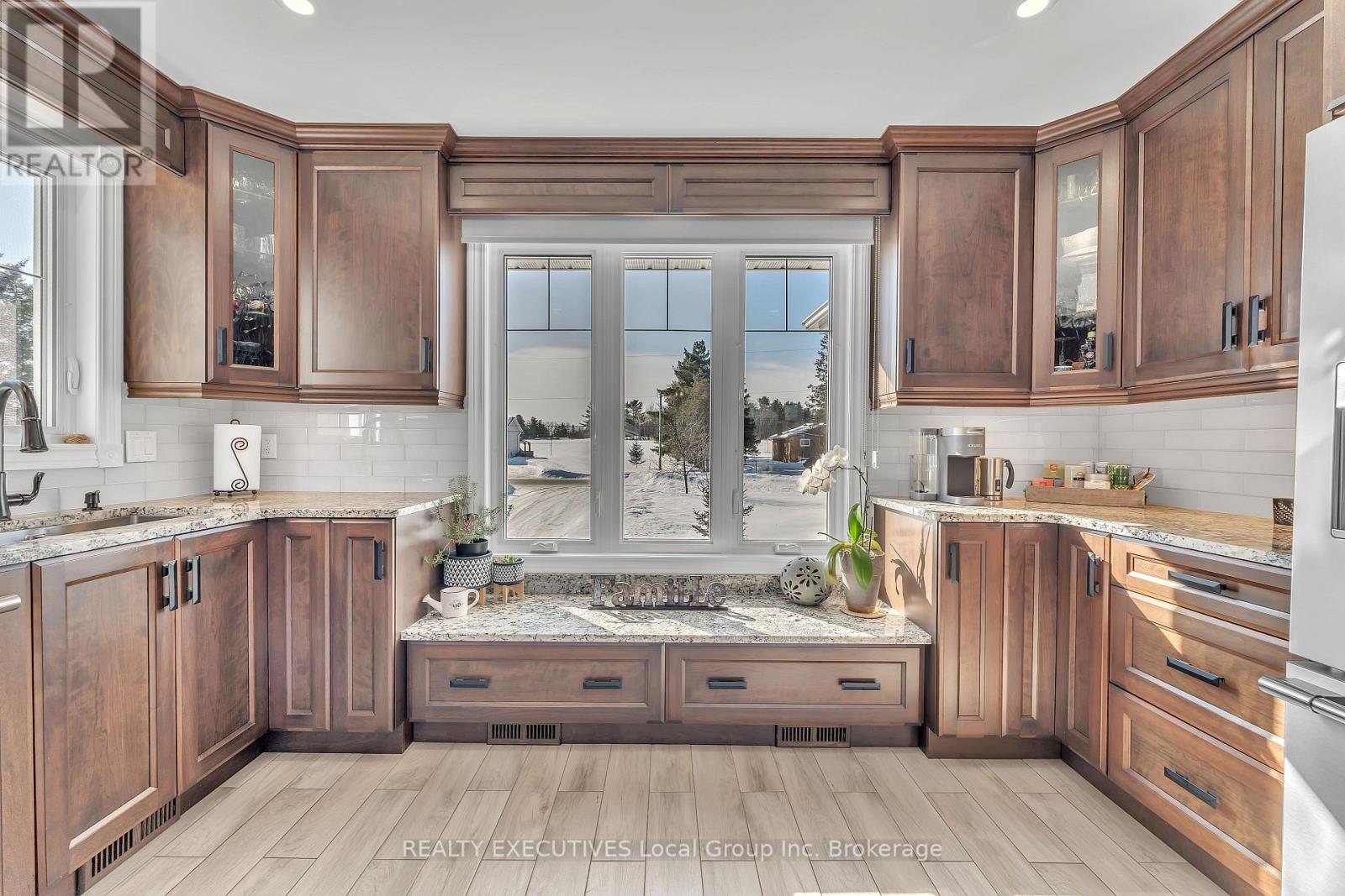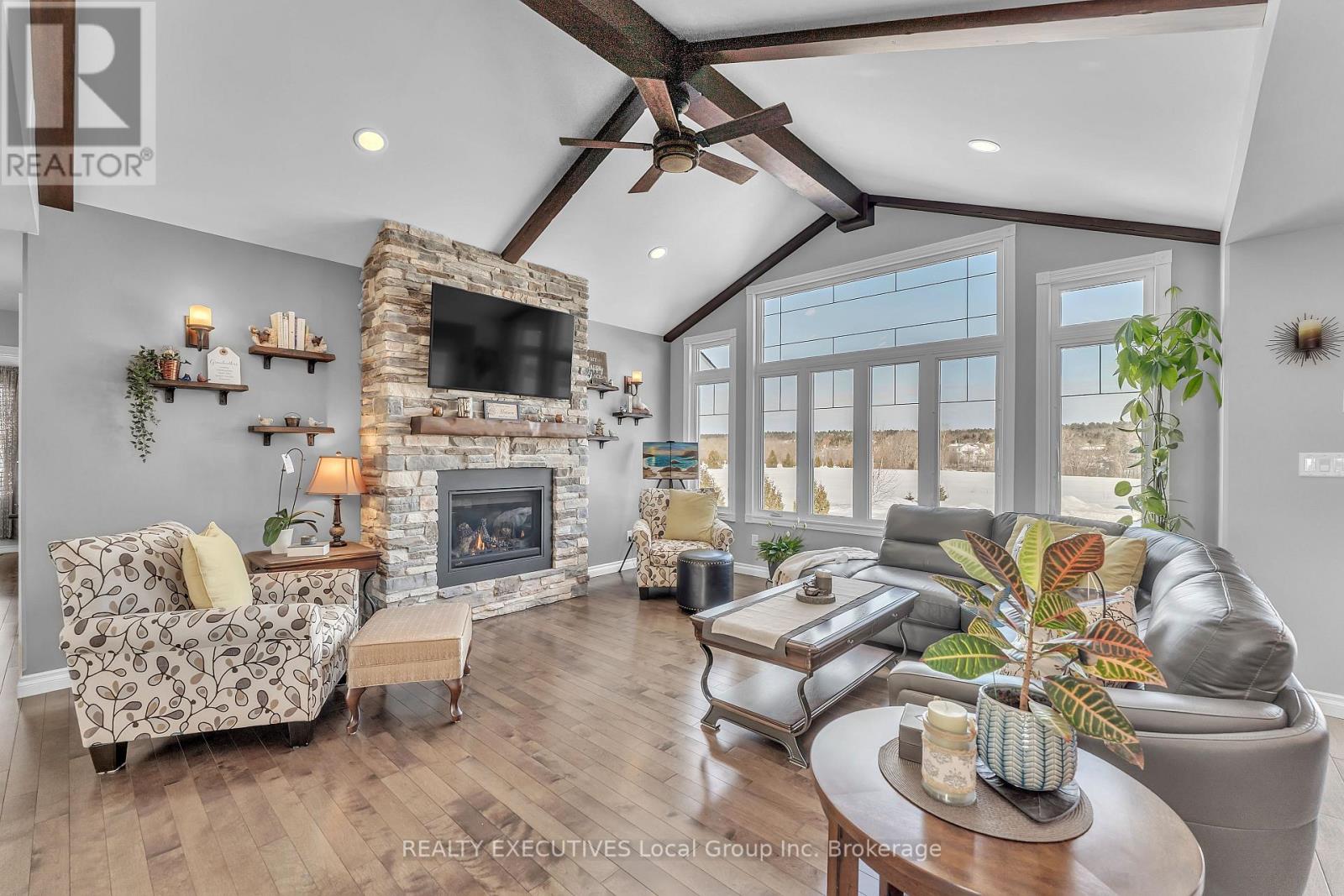 Situated on 1.79 acres along the banks of the Veuve River, 933 Betty Road offers the perfect blend of executive country living with municipal water and natural gas services. Built in 2016, this impressive home showcases quality finishes and thoughtful design throughout. Upon entering the main floor, you are welcomed by heated ceramic tile flooring that leads into the living room featuring vaulted ceilings, hardwood floors, a floor-to-ceiling stone accented gas fireplace + expansive windows that flood the space with natural light while offering beautiful views of the property. The chef-inspired kitchen boasts a full stainless steel appliance package, floor-to-ceiling maple cabinetry providing abundant storage, and gleaming granite countertops that offer ample prep space. The open-concept layout flows seamlessly into the dining area and provides easy access to the outdoor entertaining space. Down the hall, the primary bedroom features a walk-in closet and convenient access to the 4-piece main bathroom, that is complete with heated floors, quartz countertop, and a relaxing soaker tub for a spa-like experience at home. A second bedroom and main floor laundry complete the main level. The fully finished basement offers another bedroom, a 3-piece bathroom with heated floors, a cedar-lined storage closet, under-stair walk-in storage, utility room, and a large open-concept rec/games room-perfect for entertaining family and friends. The attached 22' x 26' garage is fully insulated and heated with natural gas and offers convenient access from both levels of the home. Outside, you will find a 40' x 30' detached insulated and heated garage/shop, ideal for hobbies, storage, or additional workspace. The beautifully maintained grounds feature an interlock patio, landscaped garden beds & retaining walls, and an in-ground sprinkler system. (id:64974)