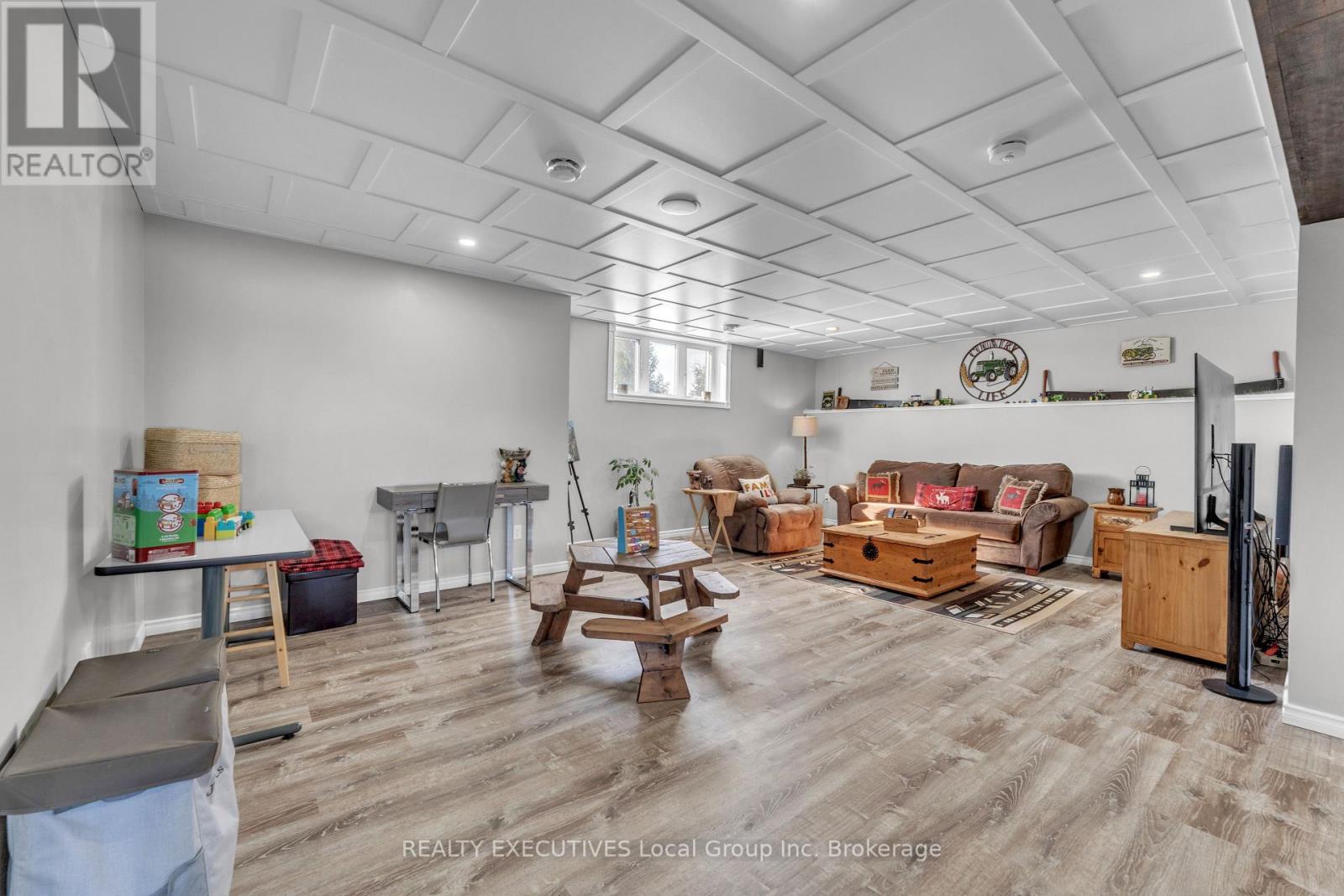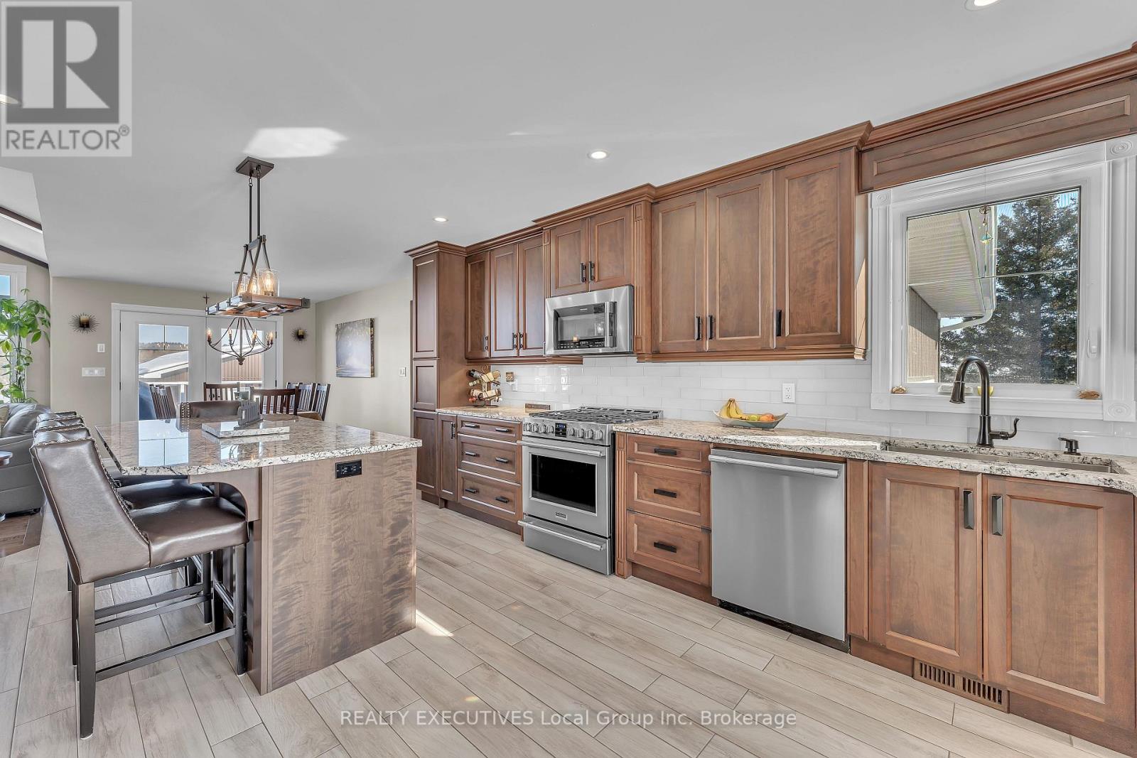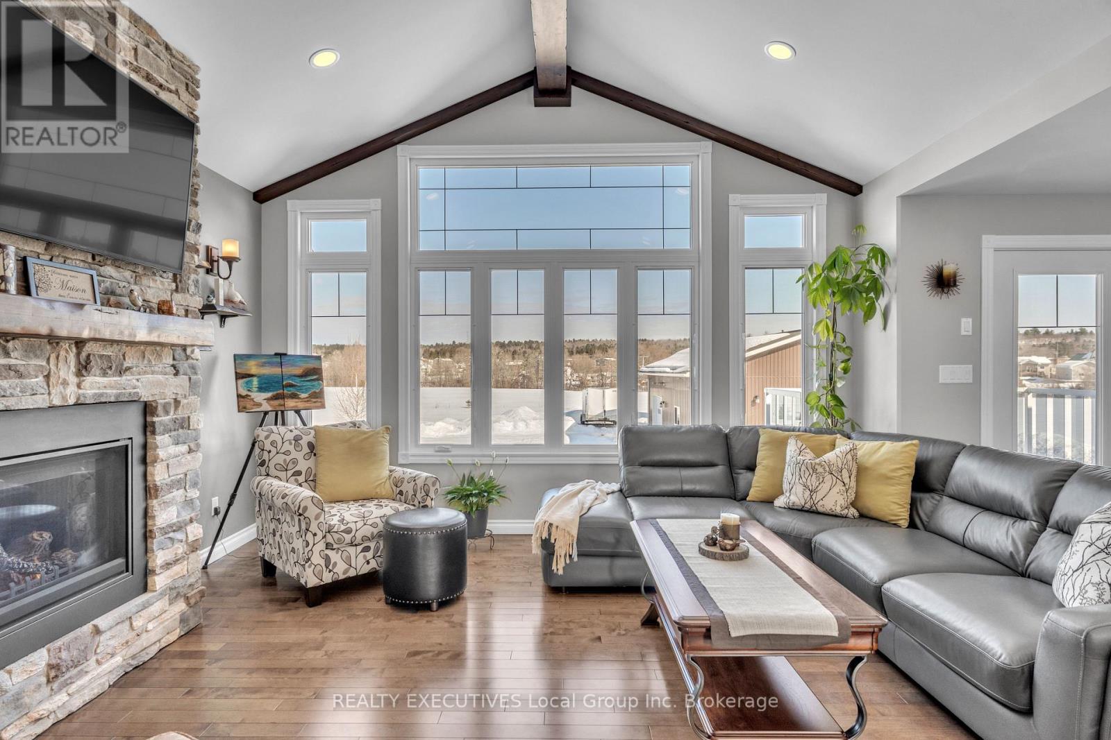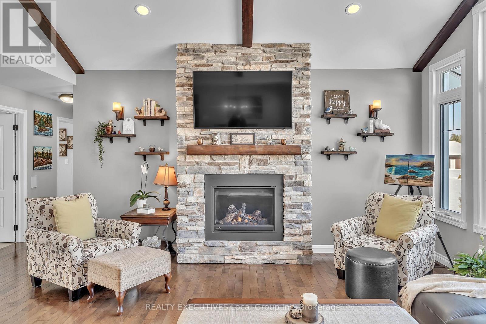Situated on 1.79 acres along the banks of the Veuve River, 933 Betty Road offers the perfect blend of executive country living with municipal water and natural gas services. Built in 2016, this impressive home showcases quality finishes and thoughtful design throughout. Upon entering the main floor, you are welcomed by heated ceramic tile flooring that leads into the living room featuring vaulted ceilings, hardwood floors, a floor-to-ceiling stone accented gas fireplace + expansive windows that flood the space with natural light while offering beautiful views of the property. The chef-inspired kitchen boasts a full stainless steel appliance package, floor-to-ceiling maple cabinetry providing abundant storage, and gleaming granite countertops that offer ample prep space. The open-concept layout flows seamlessly into the dining area and provides easy access to the outdoor entertaining space. Down the hall, the primary bedroom features a walk-in closet and convenient access to the 4-piece main bathroom, that is complete with heated floors, quartz countertop, and a relaxing soaker tub for a spa-like experience at home. A second bedroom and main floor laundry complete the main level. The fully finished basement offers another bedroom, a 3-piece bathroom with heated floors, a cedar-lined storage closet, under-stair walk-in storage, utility room, and a large open-concept rec/games room-perfect for entertaining family and friends. The attached 22' x 26' garage is fully insulated and heated with natural gas and offers convenient access from both levels of the home. Outside, you will find a 40' x 30' detached insulated and heated garage/shop, ideal for hobbies, storage, or additional workspace. The beautifully maintained grounds feature an interlock patio, landscaped garden beds & retaining walls, and an in-ground sprinkler system. (id:64974)
