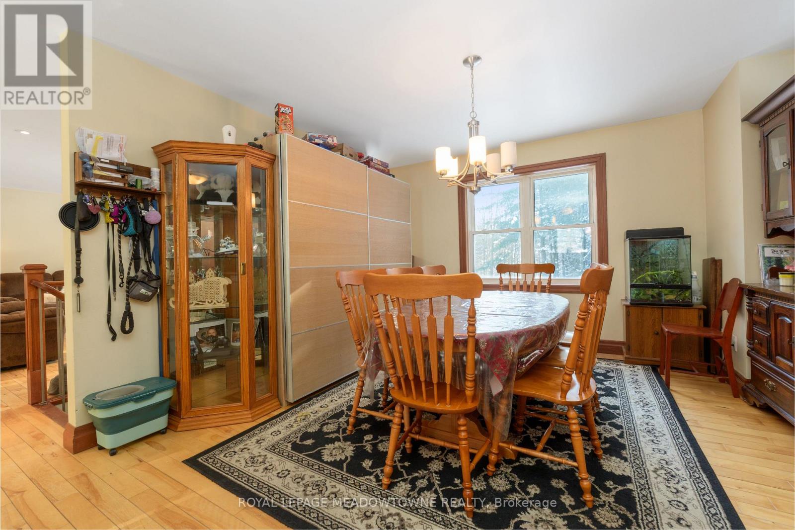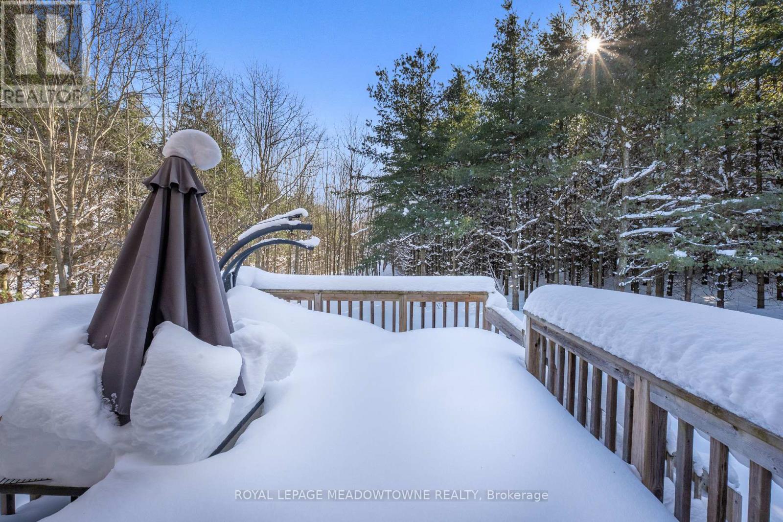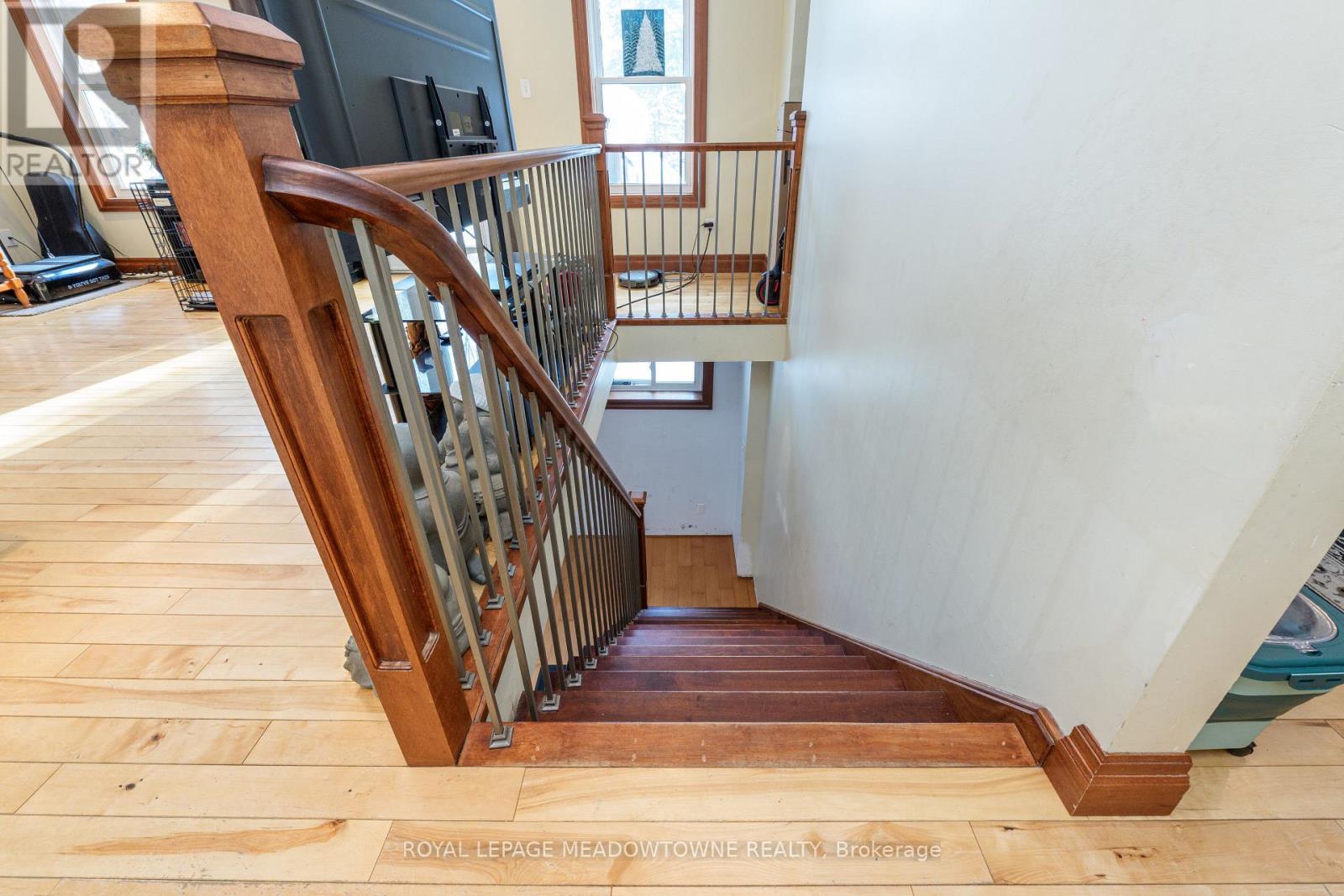 Experience the perfect blend of country tranquility and modern comfort on this private 1+ acre lot surrounded by mature trees. This beautifully maintained 3+1 bedroom, 2-bathroom raised bungalow, built in 2013 and topped with a durable metal roof, offers serene rural living while remaining close to town amenities. The welcoming foyer opens into a bright, open-concept living area with hardwood floors, pot lights, and a walk-out to the deck, seamlessly connecting to the dining space and kitchen with ample cabinetry and counter space. The main level features a spacious primary suite with a double closet and private 3-piece ensuite, plus two generously sized bedrooms with large closets. The finished lower level expands the living space with a massive recreation room, laminate flooring, two above-grade windows, a walk-out to the backyard, and a fourth bedroom, laundry, and storage areas, with a rough-in for an additional bathroom. Enjoy the lush, private backyard for relaxation or entertaining, while modern updates, including a propane forced-air furnace (2024), ensure comfort year-round. Conveniently located just a short drive to GO stations in Acton and Georgetown, this home offers the ideal balance of peaceful country living and everyday convenience. (id:64974)