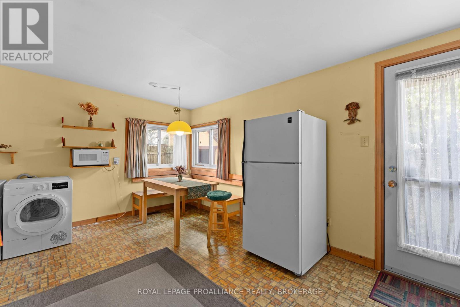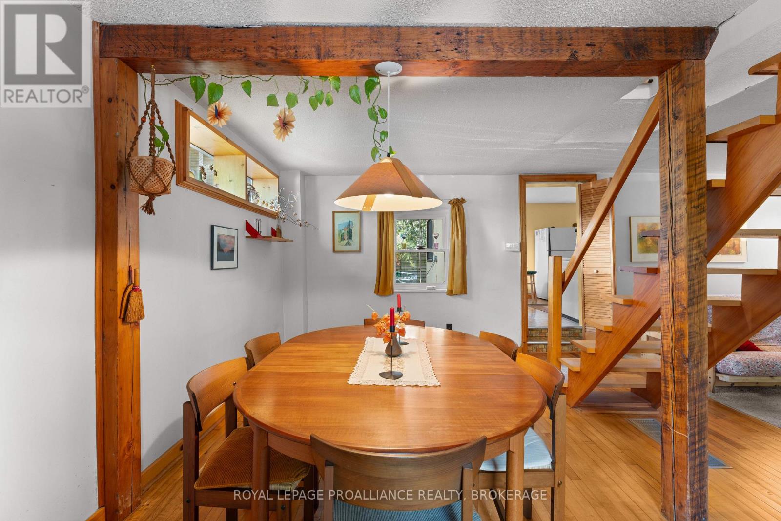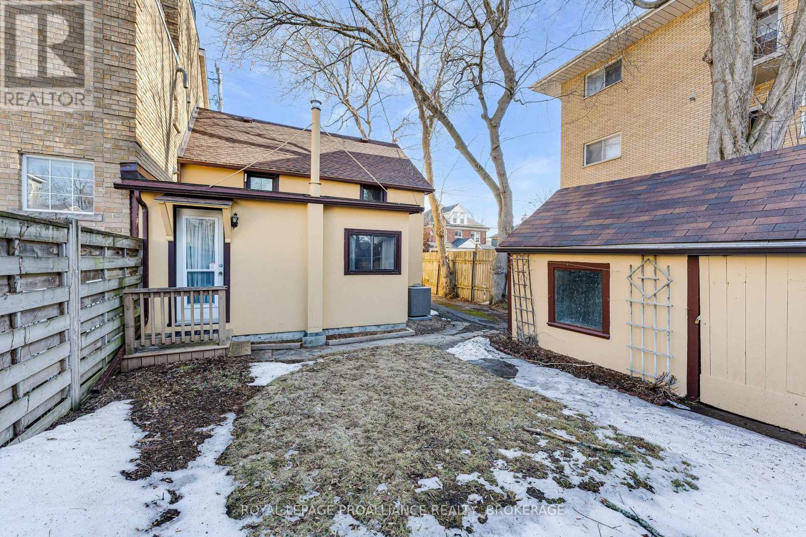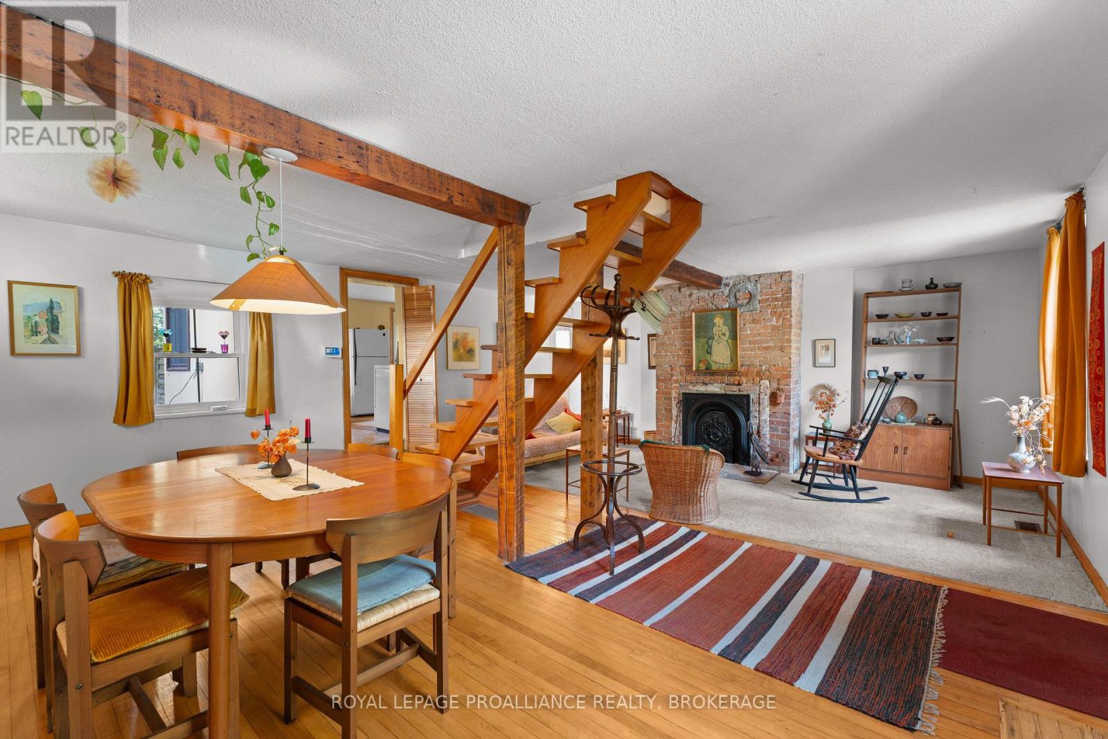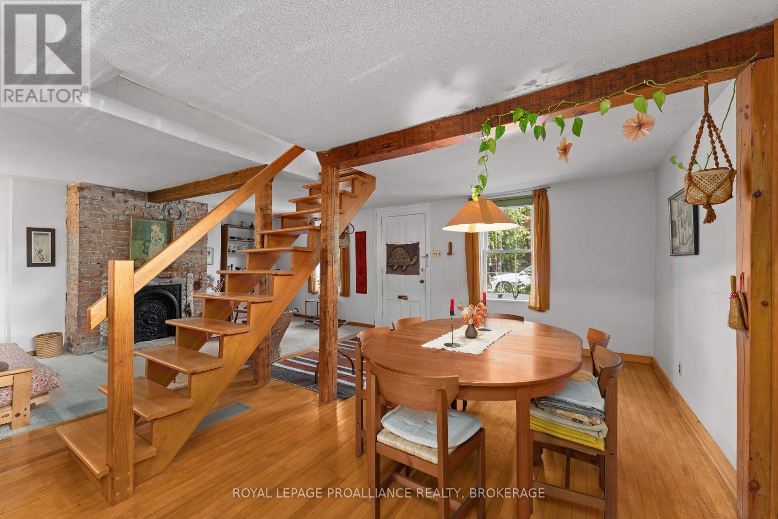A truly special find in Kingston's historic Sydenham Ward! This charming 1 1/2 storey 'urban cottage' is loaded with character. Exposed wood beams, a floating staircase, hardwood floors, new vinyl windows and thoughtful architectural details throughout. Ideal for professionals, downsizers, or anyone seeking a home with personality and walk-ability. This home features 2 bedrooms, one full bathroom with claw foot tub and an inviting layout. The fenced courtyard offers a private outdoor retreat and the detached single-car garage provides rare convenience in this sought-after neighbourhood. Steps to Queens, downtown, hospitals, and the waterfront. this home perfectly blends historic charm with modern urban living. (id:64974)