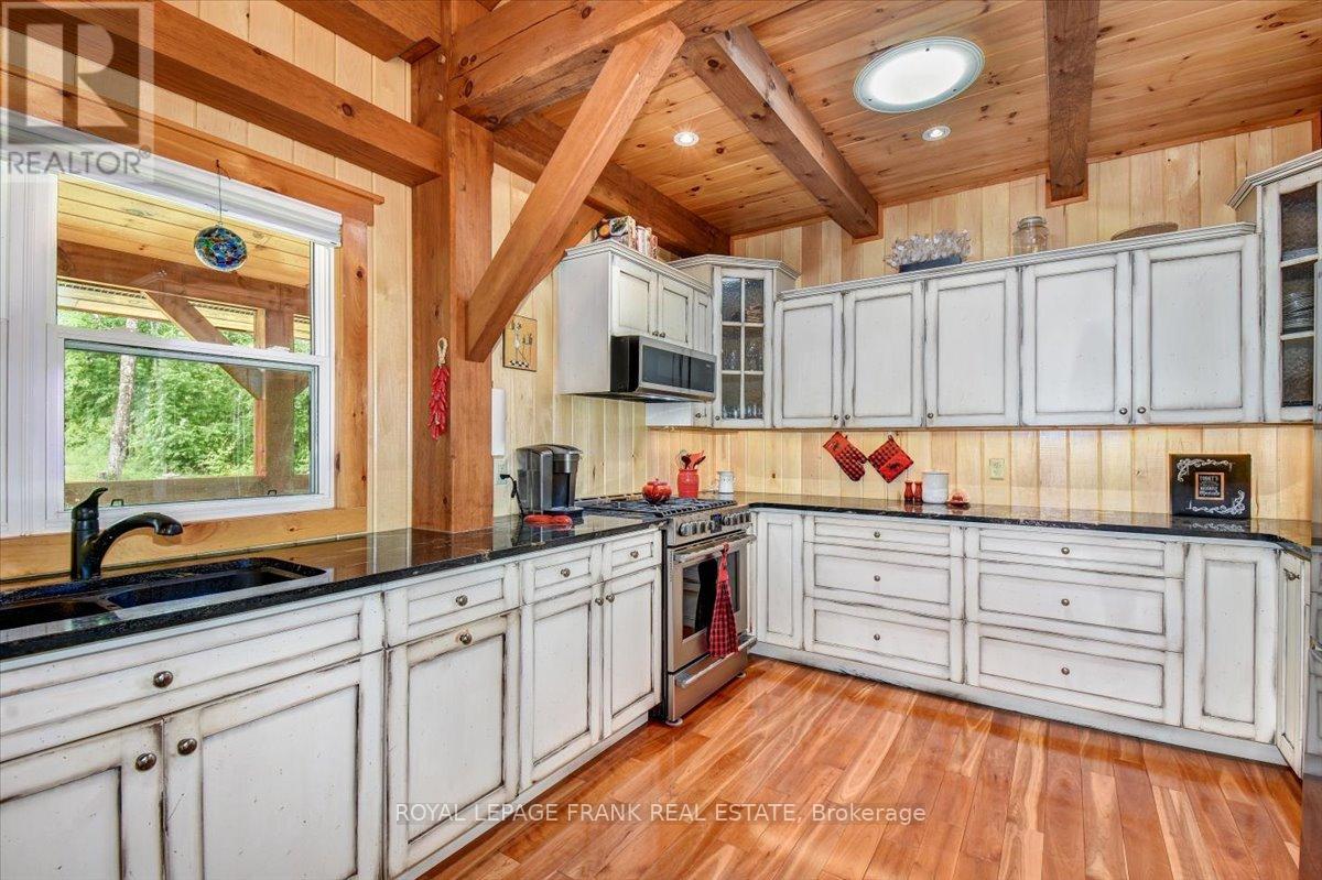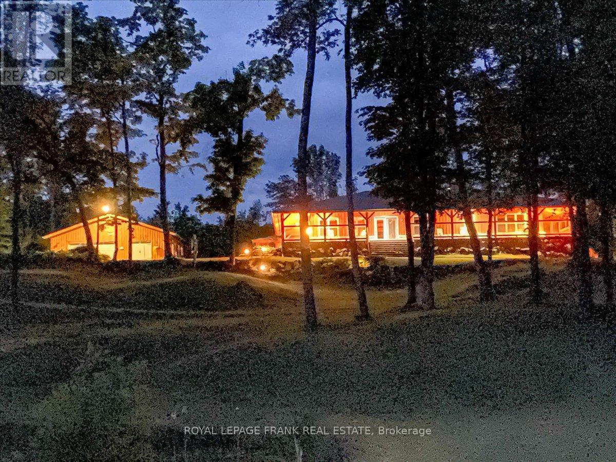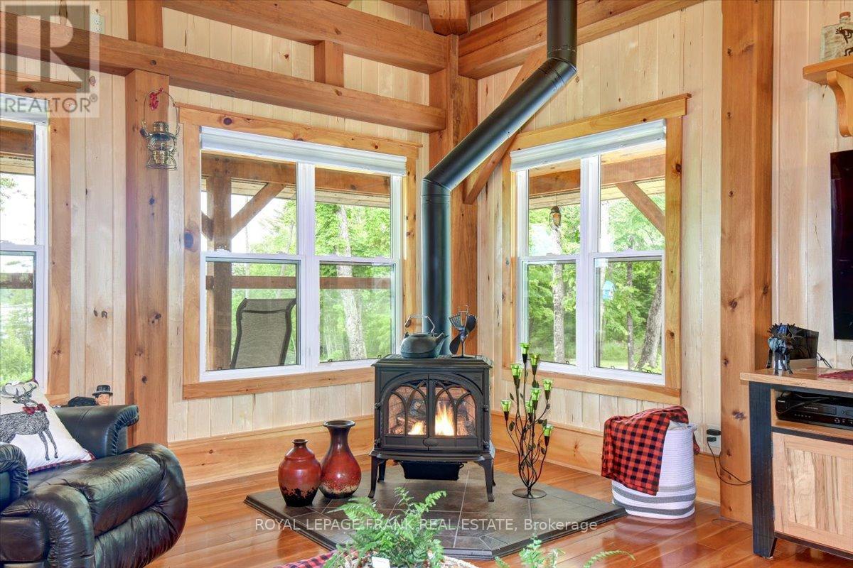 Steenburg Lake! The complete package and more! This Timber Frame home is sure to impress. Amost 1800 square feet of living, with a full wrap around porch, perched perfectly over looking beautiful Steenburg Lake, with clean waterfront, all sitting on 86 acres of land with trails throughout. The waterfront is across the paved cottage road with a large dock system and newer floating boat house, big enough for a 22ft pontoon boat. There is a 30x40 heated shop, with drop down screen door system and a large covered area for extra storage. Hangout in the screened gazebo or chill on the wrap around porch. Extra features include: auto generator, central air, high efficiency furnace, underground sprinklers, alarm system with cameras, stainless appliances, hardwood flooring, a small pond with fountain and so much more. Recent upgrades include furnace, central air, roof and eavestroughs. This is a legacy type property that will be hard to match. Come take a look and you won't want to leave!! (id:64974)