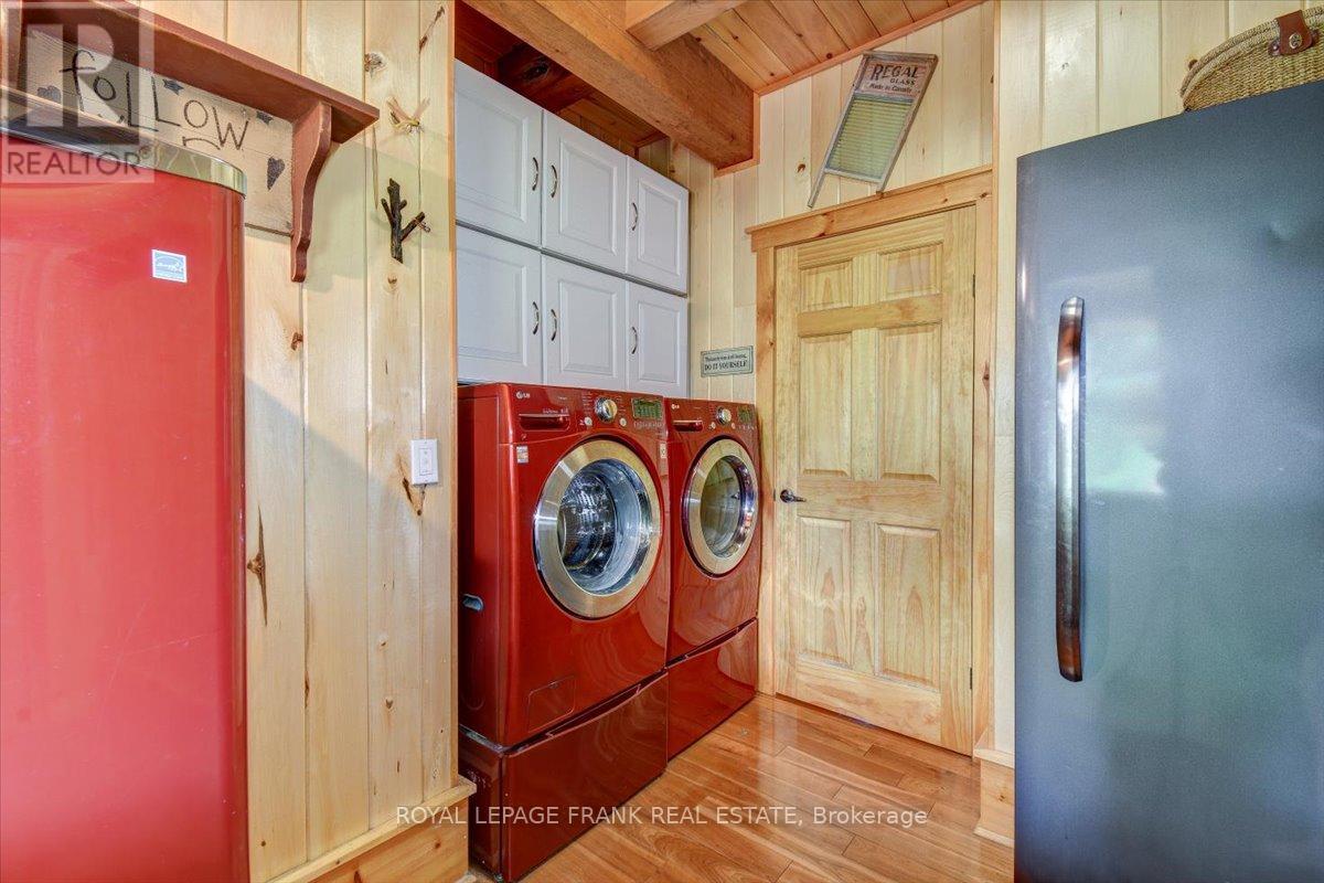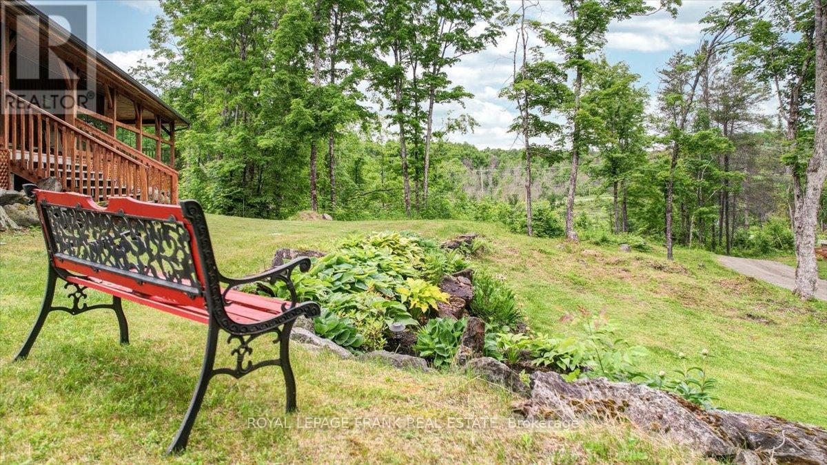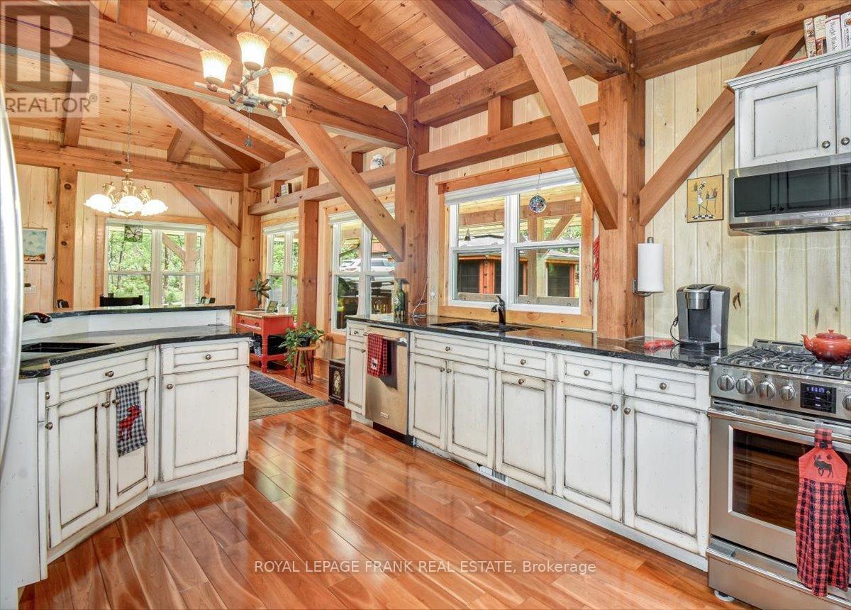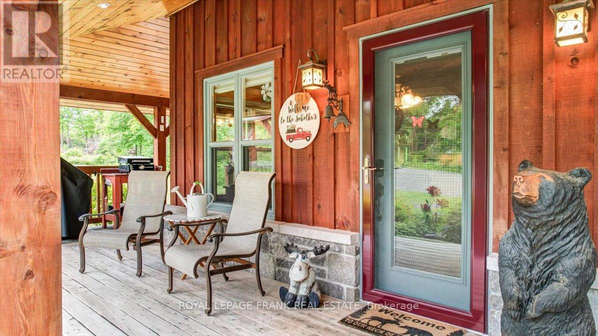 Steenburg Lake! The complete package and more! This Timber Frame home is sure to impress. Amost 1800 square feet of living, with a full wrap around porch, perched perfectly over looking beautiful Steenburg Lake, with clean waterfront, all sitting on 86 acres of land with trails throughout. The waterfront is across the paved cottage road with a large dock system and newer floating boat house, big enough for a 22ft pontoon boat. There is a 30x40 heated shop, with drop down screen door system and a large covered area for extra storage. Hangout in the screened gazebo or chill on the wrap around porch. Extra features include: auto generator, central air, high efficiency furnace, underground sprinklers, alarm system with cameras, stainless appliances, hardwood flooring, a small pond with fountain and so much more. Recent upgrades include furnace, central air, roof and eavestroughs. This is a legacy type property that will be hard to match. Come take a look and you won't want to leave!! (id:64974)