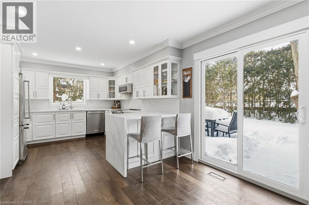 Welcome to 946 Nora Drive, tucked away on a quiet court in one of Burlington’s most sought-after Aldershot neighbourhoods. This beautifully updated two-storey home offers 3+1 bedrooms and 2.5 bathrooms, combining functional family living with stylish modern finishes. The main level features updated flooring, formal living and dining rooms, a bright and open layout, beautiful family room featuring a gas fireplace, and large windows that flood the home with natural light. The chef-inspired kitchen is a standout, showcasing quartz countertops with a dramatic waterfall edge, stainless steel appliances, and ample prep and storage space—perfect for everyday living and entertaining. Upstairs, generously sized bedrooms provide comfortable retreats, while the finished lower level adds flexibility with an additional bedroom and large storage room. Enjoy the convenience of a two-car garage and unwind in the spacious backyard, offering plenty of room for outdoor entertaining, play, or gardening. Located close to parks, schools, shopping, transit, major highways and 2 Go Stations, this home delivers the perfect blend of privacy, comfort, and convenience. A fantastic opportunity to own a move-in-ready home in a quiet, family-friendly enclave of Aldershot. (id:64974)