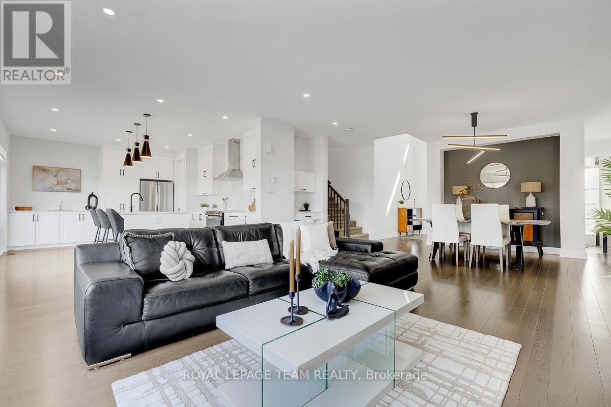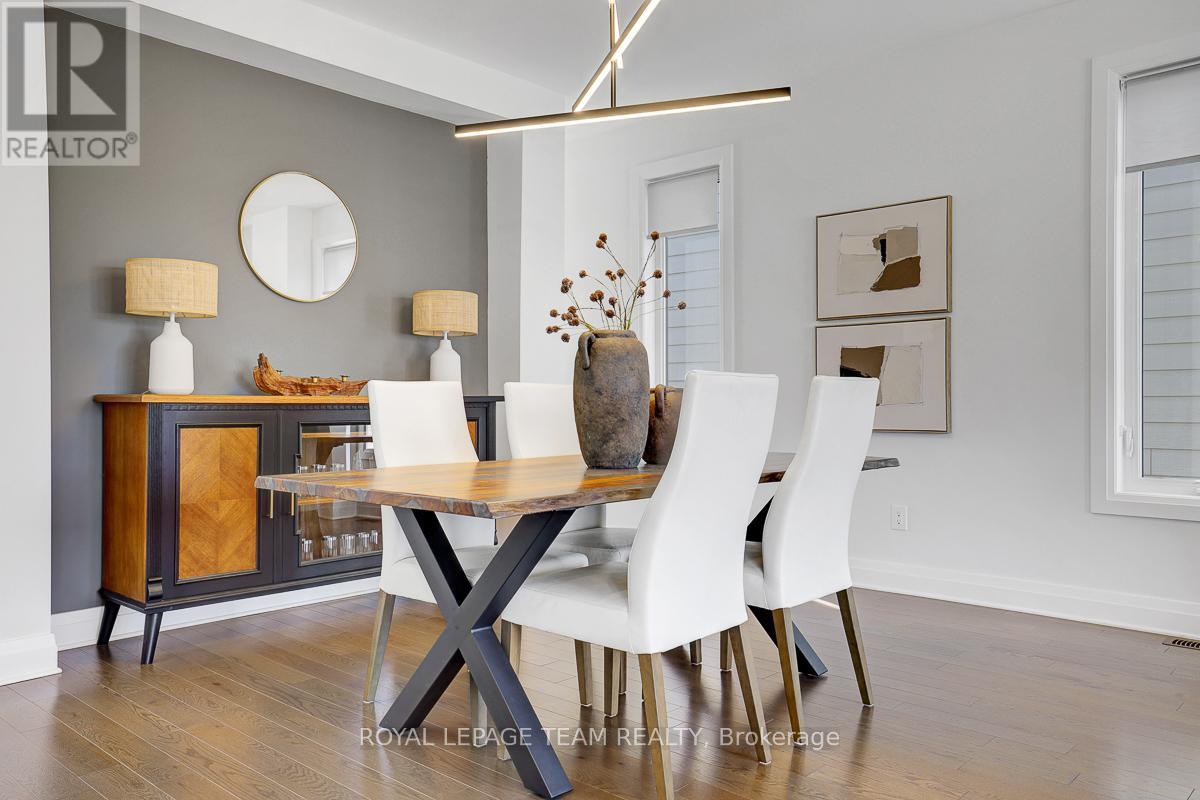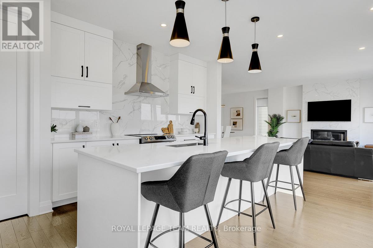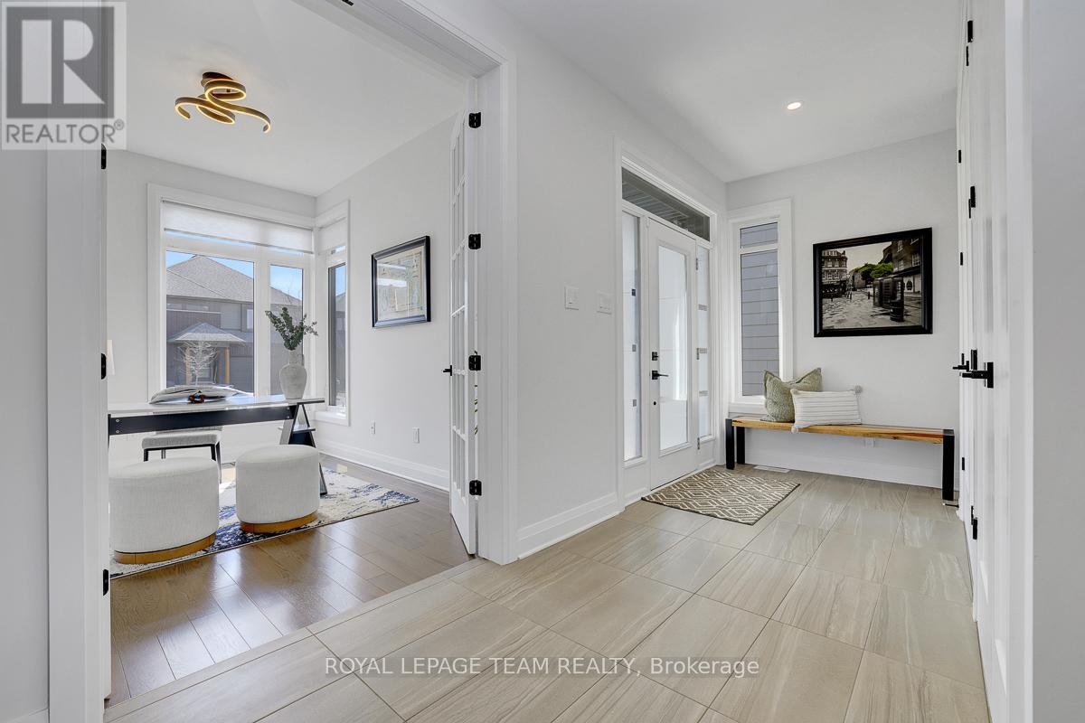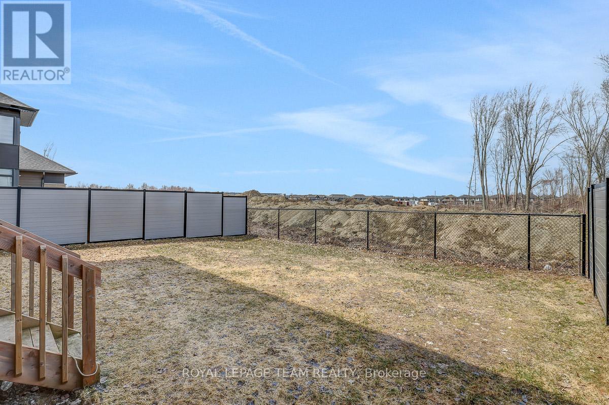 Welcome to this beautifully upgraded 2021 Richcraft built home, set on PREMIUM 44-ft lot with NO REAR NEIGHBOURS - a rare offering that delivers exceptional privacy and long-term value in this family-oriented pocket of Riverside South. Striking curb appeal is enhanced by modern exterior finishes including upgraded steel cedar siding, exterior pot lights, and an interlock walkway. Inside, the bright open-concept main level features soaring ceilings and expansive windows that flood the home with natural light. The spacious living and dining areas are defined by a sleek linear fireplace with a marble surround, creating a warm contemporary focal point. The gourmet kitchen offers an oversized island, quartz countertops, upgraded cabinetry, marble backsplash, and modern range hood. Versatile front room can function as a home office or ADDITIONAL BEDROOM. A powder room and mudroom with direct access to the garage complete this level. Upstairs, retreat to the spacious primary suite featuring a walk-in closet and a large SPA-INSPIRED ensuite featuring a freestanding tub, oversized glass shower with niche, double floating vanity with a quartz countertop. Two additional generously sized bedrooms each with walk-in closets - one with a private ensuite, and the other with its own separate bathroom across the hall. Second floor laundry room adds everyday convenience. The partially finished basement includes an EXTRA BEDROOM and offers flexibility for guests or future living space. With a separate garage entrance (or the option to add a dedicated side door entrance) and rough-in for an additional bathroom, this level presents outstanding potential for an IN-LAW SUITE OR INCOME OPPORTUNITY. Fully fenced backyard creates a peaceful and private outdoor setting. Located close to schools, parks, transit, LRT, the river, and within walking distance to amenities, this home offers a rare combination of modern comfort, privacy, and value in one of Ottawa's fastest growing communities. (id:64974)