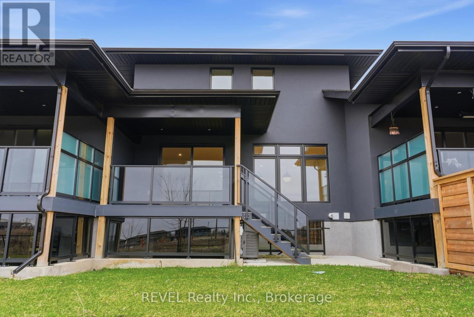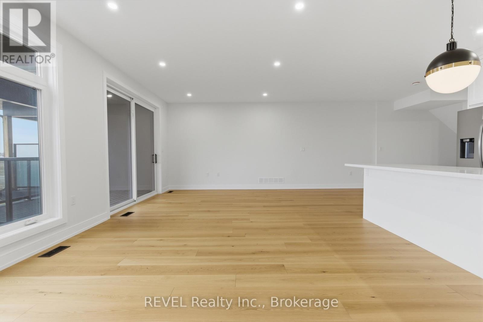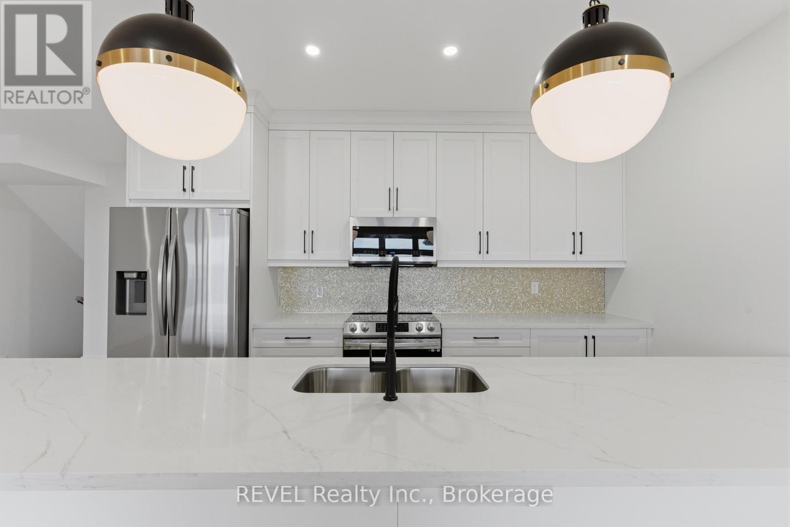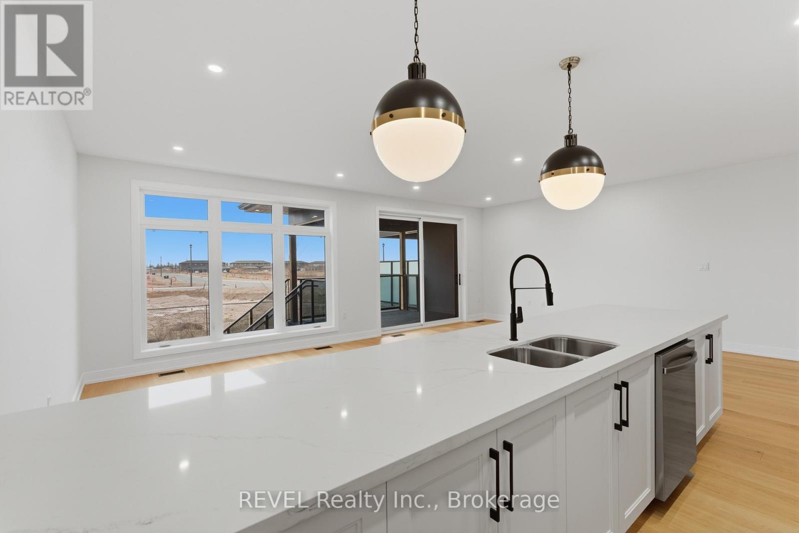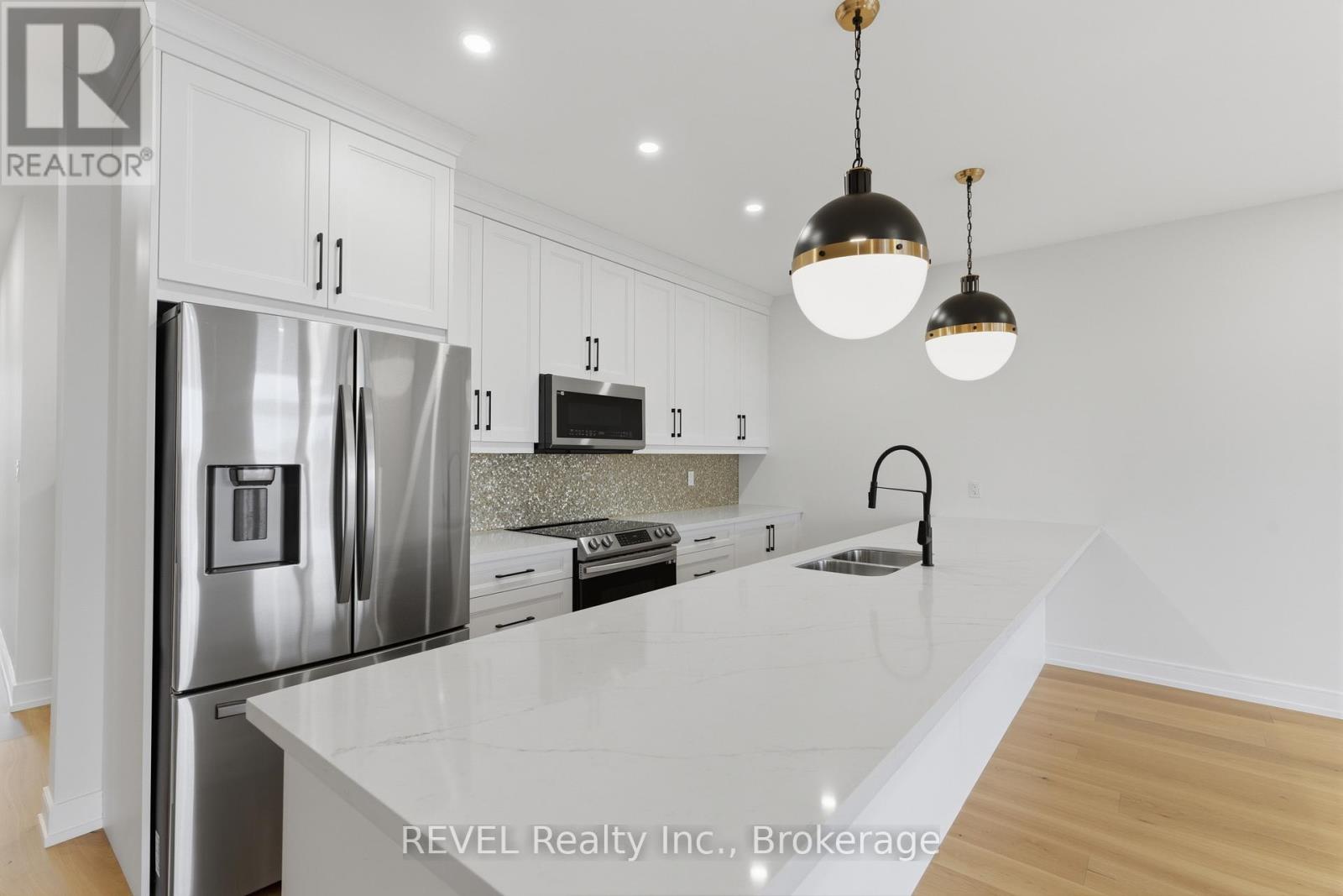 Beautifully finished freehold townhouse offering 3 bedrooms and 2.5 bathrooms in one of Fonthill's most sought-after communities. Designed for modern living with a functional layout, quality finishes, and convenient access to local amenities.The main floor features 9 ft ceilings and an open-concept layout with large windows providing excellent natural light. The kitchen is well-appointed with quartz countertops, a large island, floor-to-ceiling soft-close cabinetry, stainless steel double sink, and Riobel dual-spray faucet. The living and dining area includes LED pot lighting and direct access to a covered deck through sliding doors, creating an easy indoor-outdoor flow.A mudroom with garage access and a 2-piece powder room complete the main level.The second floor offers a spacious primary bedroom with walk-in closet and a 5-piece ensuite featuring a double vanity, freestanding soaker tub, and tiled shower. Two additional bedrooms share a 4-piece bathroom with double vanity and Mirolin tub/shower combination. Convenient second-floor laundry includes a sink and additional storage.The unfinished walkout basement provides excellent potential for additional living space, with natural light and access to a covered patio. Located close to parks, walking trails, schools, shopping, dining and 406, this home offers a strong combination of layout, finish, and location. (id:64974)