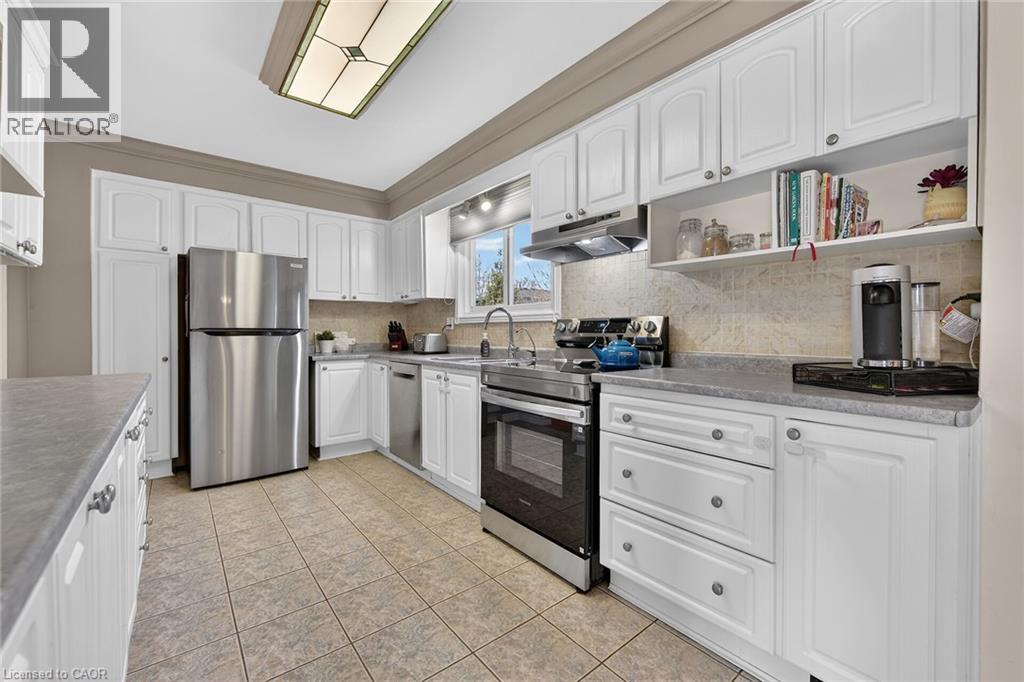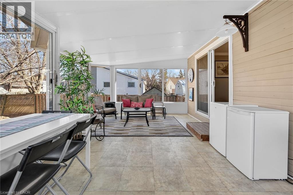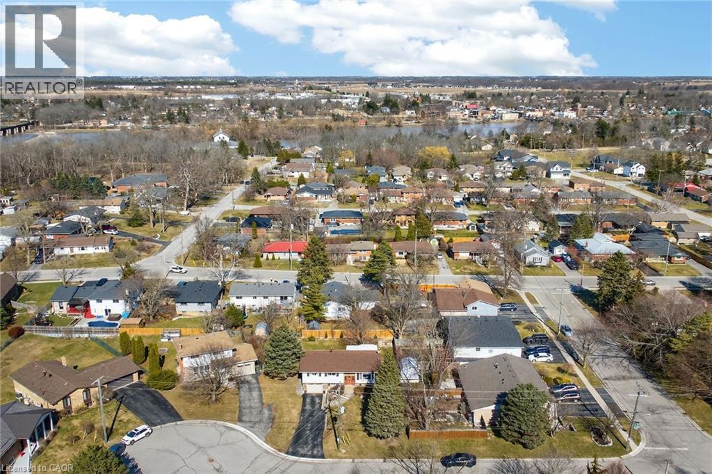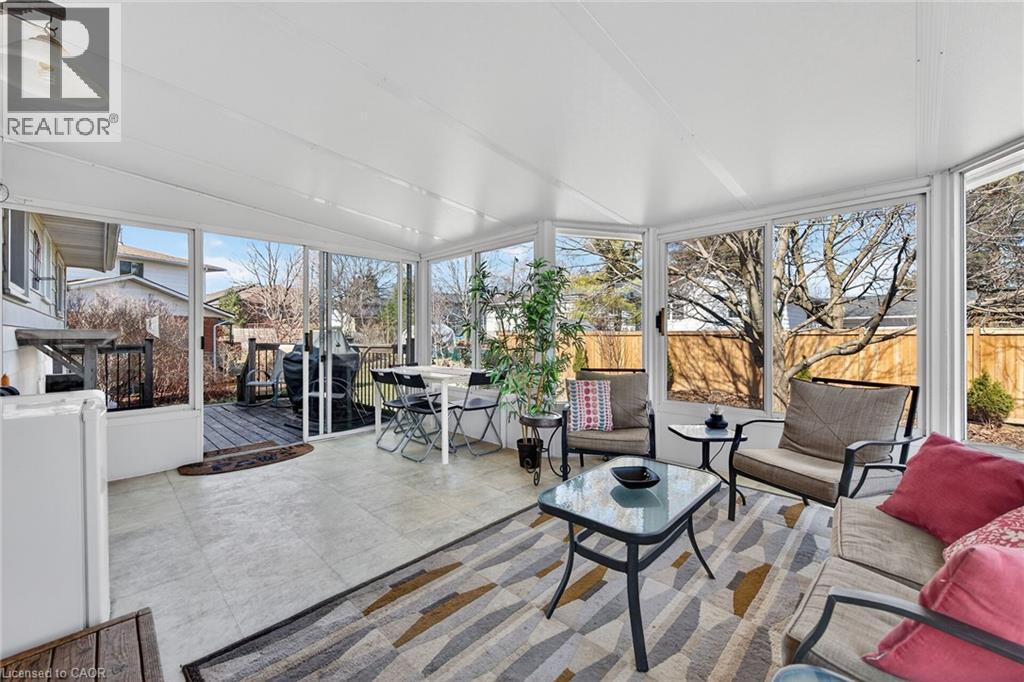 Nestled on an oversized pie-shaped lot this raised bungalow has a lot to offer. Front entry with wainscoting. Main floor offers a spacious living room complete with hardwood floors and a bay window. This, in turn, is open to the dining room, which has large sliding doors leading to the 3 season sunroom - perfect spot to start and end your day overlooking your backyard. Kitchen is loaded with white cabinetry and new appliances. Gorgeous main bathroom completely renovated. Rest of main floor provides 3 bedrooms. Lower level features a large family room with gas fireplace & large above grade window. A 4th bedroom, laundry/utility room, 2 piece bath and access to the garage completes this level. Parking is a breeze with parking for 4 on the asphalt paved driveway plus an additional spot in the attached garage with inside access. Located close to amenities, walking paths, the Grand River, schools & parks. Offering peace of mind with many updates including: Furnace & A/C (2021); House & Sunroom Roof (2022); Main Bath (2022); Chimney (2021); Hot Water Heater (2021); All Indoor Outlets & Switches (2020); Dishwasher (2020); Washer (2023); Dryer (2025); Gas Fireplace Inspected/Serviced w/ a 2 yr warranty (2025); Fridge & Stove (2026). (id:64974)