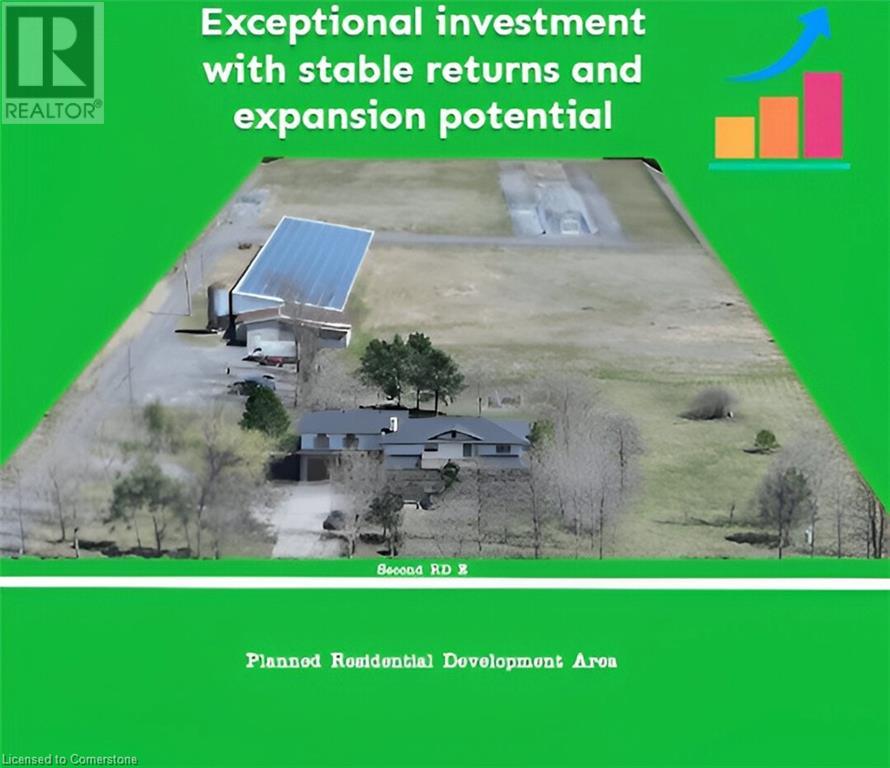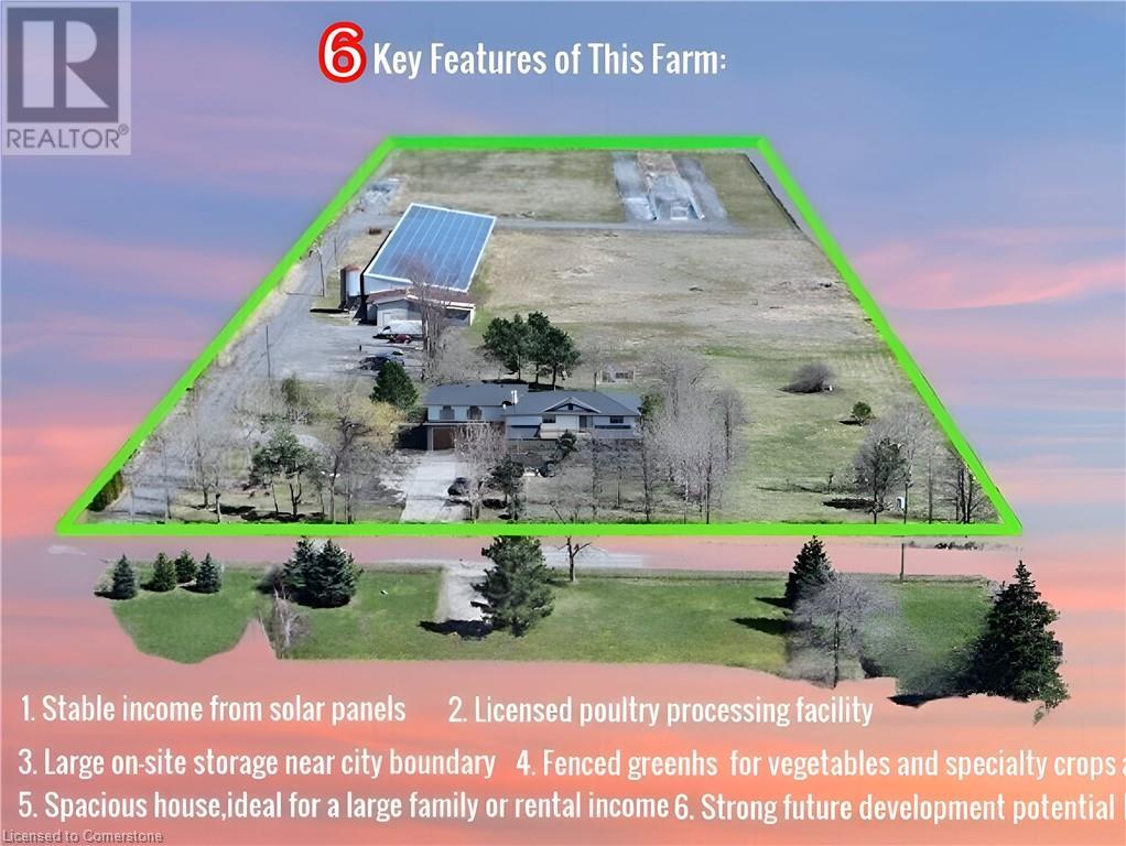 Rare opportunity to own a cash-flowing agri-commercial asset on the urban edge of Hamilton. This unique 7-acre property offers multiple established and scalable income streams, making it ideal for investors, agri-business operators, or multi-generational owners seeking both lifestyle and return. The property features a 150 kW FIT solar system with long-term contract providing strong, predictable income, a licensed chicken processing facility, greenhouse permits (existing and expandable), and approximately 7,000 sq ft of usable indoor storage, creating diversified revenue from day one. A spacious 4-bedroom home with two kitchens offers flexibility for owner-occupancy, staff housing, or multi-family living. New roof (2024), ample parking, and excellent access make operations efficient and convenient. Located at the edge of Hamilton’s urban expansion area, this property also provides significant long-term land value upside, combining today’s cash flow with tomorrow’s growth potential. A rare chance to secure a business, income property, and strategic land holding in one purchase. (id:64974)