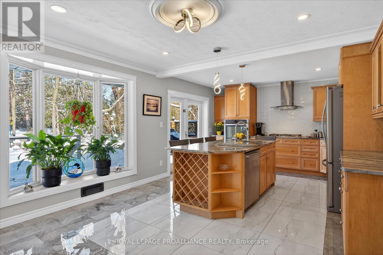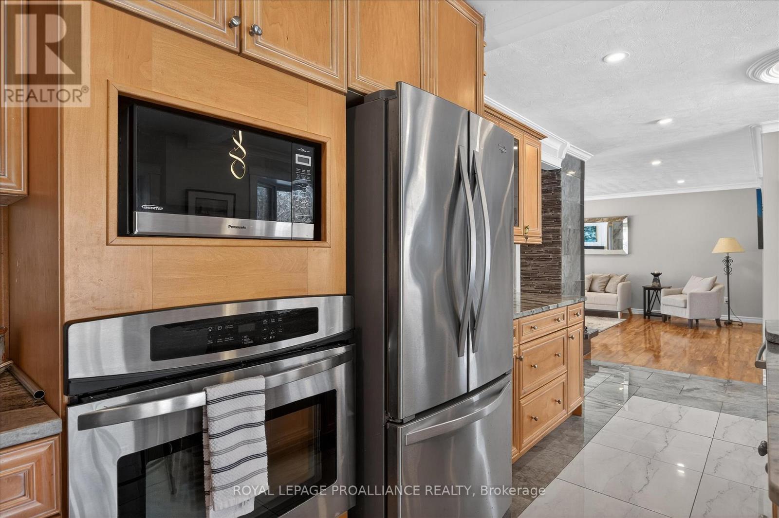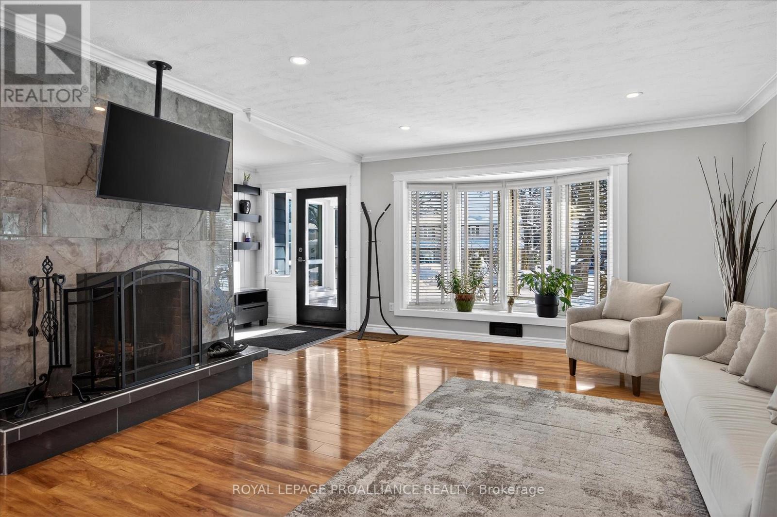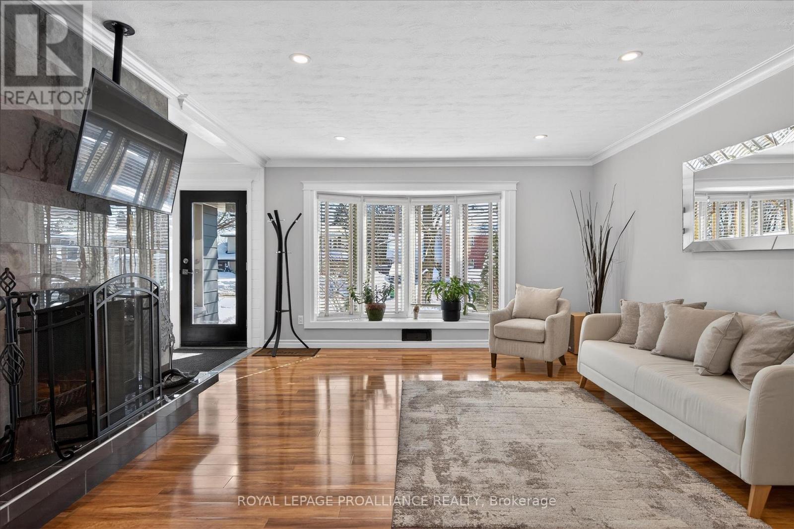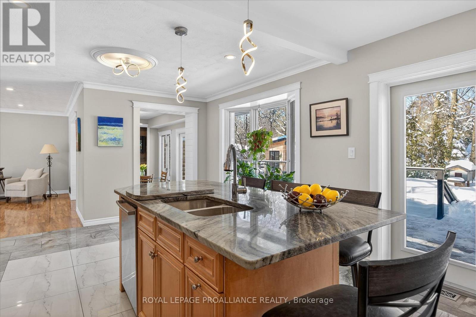 This updated executive bungalow is located in one of Peterborough's most sought-after neighbourhoods. Just a short walk from the Peterborough hospital, and steps from Weller Park. A spacious pool-sized backyard, with mature trees and privacy... plus the mini bar clubhouse for entertaining guests outdoors! Offering elegance in its character features, but with modern comfort, and outstanding versatility. 4 bedrooms, 3 bathrooms, and two full kitchens. The main level features a sun-filled, open-concept layout anchored by a chef-inspired kitchen with an expansive granite island, stainless steel appliances, and dual ovens, ideal for elevated entertaining. The kitchen flows into a sunken dining area highlighted by an electric fireplace, creating a warm and sophisticated atmosphere. The living space is enhanced by a classic wood-burning fireplace, while the spacious primary bedroom offers a full ensuite.Step outside to a generous deck overlooking a private backyard, perfect for summer gatherings, outdoor dining, or quiet relaxation.The fully finished lower level has a separate entrance, and offers exceptional flexibility with a second kitchen and bar area, a large recreation room, games or fitness space, an additional bedroom, and a dedicated media room with fireplace, projector hookup, and walk-out access to the garage-ideal for entertaining or multigenerational living.Ideally positioned close to excellent schools, shopping, and just a short walk to the PRHC hospital, this distinguished west-end home delivers luxury, comfort, and location in one impressive offering. (id:64974)