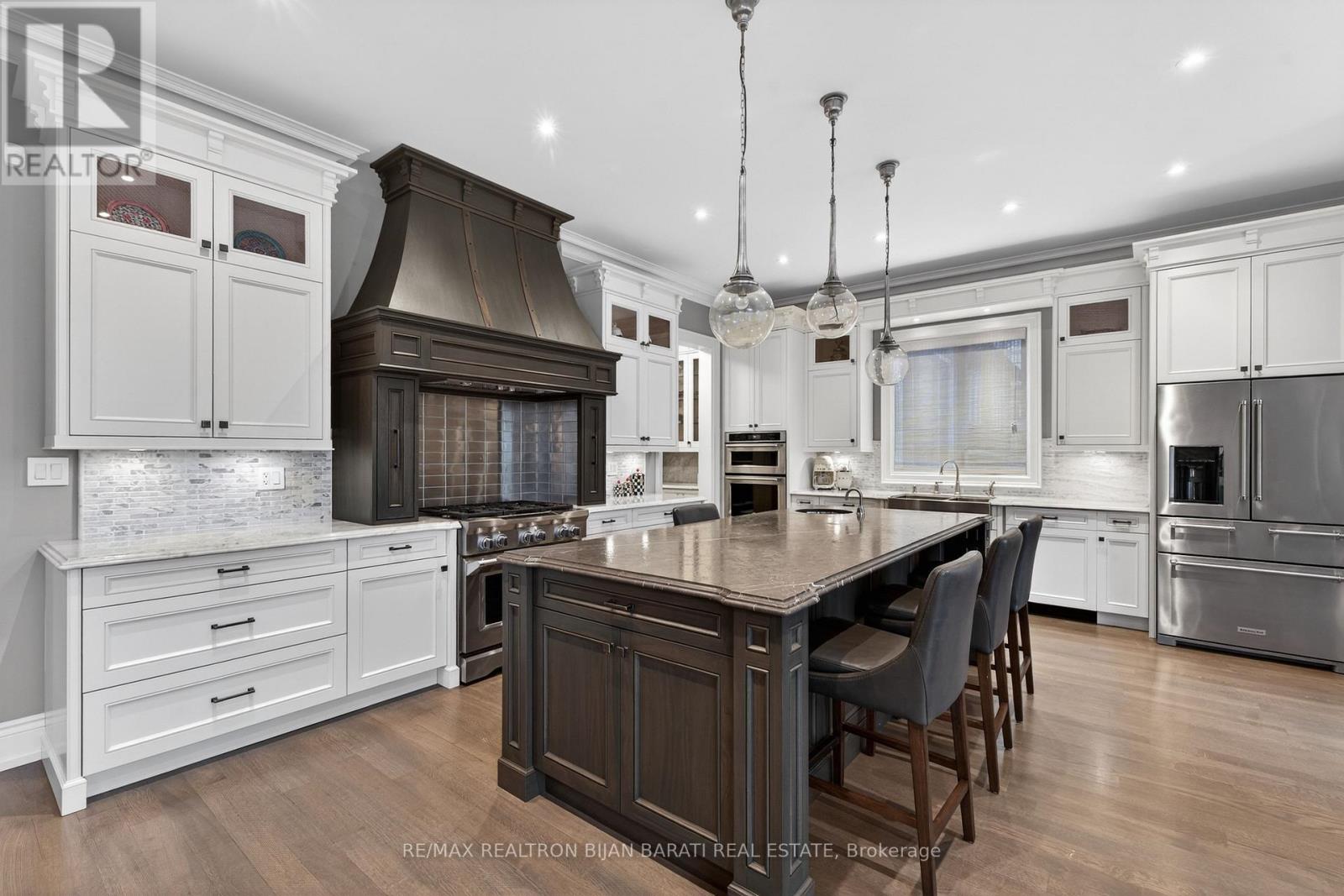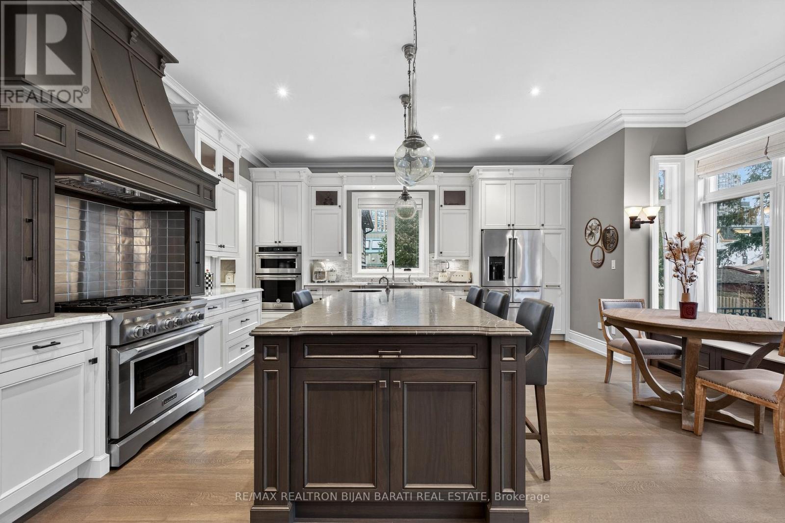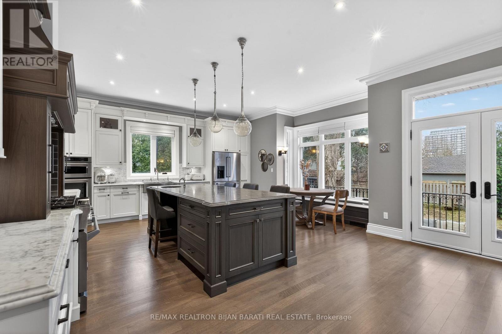 This Newer Custom Built Home, Meticulously Crafted And Sophisticated Designed On A Sun-Filled Southern Prime Lot: 50' X 117' !! It Offers Approximately 5,400 Sq.Ft Of Luxurious Living Space! 4+2 Bedrooms And 7 Washroom! E-L-E-V-A-T-O-R For 3 Levels! Impressive Architectural Design With Warm Accents And A Functional Layout! Soaring Ceiling Height ((1St Flr: 10', Office: 13.5', 2Nd Flr: 10' (Including Cof Cling), Rec Rm: 10.5'))! Hardwood Flooring And Led Lighting Thru-Out Main & 2Nd Flr! Beautiful Mix Of Limestone And Brick In Facade, And Full Brick For Other Three Exterior Sides!! Heated Floor in Lower Level And Snow Melting System for Driveway! High-End Millwork! Paneled Walls, Crown Molding, Coffered Ceilings, Led Potlights & More! The Main Floor's Flawless Layout Seamlessly Combines Functionality & Desirability, Featuring Spacious Living & Dining Areas With A Gas Fireplace, A Stylish Office/Library Featuring High Ceiling And Integrated Bookcases And Paneled Walls, Perfect For Work From Home! Walkthrough Pantry Leads To A Chef-Inspired Kitchen And Breakfast Area With State-Of-The-Art Appliances, Quality Cabinets, And A Built-In Bench! Spacious Family Room With Gas Fireplace, Rich Wall Unit, Walk-Out To Large Deck, Patio And Lovely Backyard. The Second Floor Offers A Breathtaking Master Bedroom, Boudoir W/I Closet And A Sumptuous Heated Floor Ensuite, Plus Three Additional Bedrooms Include Their Own Bathrooms, And A Large Laundry. The Lower Level Boasts An Incredible Recreation Room With A Wet Bar & Walk-Out To A Patio, Plus An Inviting Wine Cellar With Climate Control, A Guest/Nanny Room, Gym, And A Fully Equipped Home Theatre. Very Convenient Location: Minutes From Subway Station, And All Other Amenities! No Sidewalk in Front! This Home Is An Absolute Must See! (id:64974)