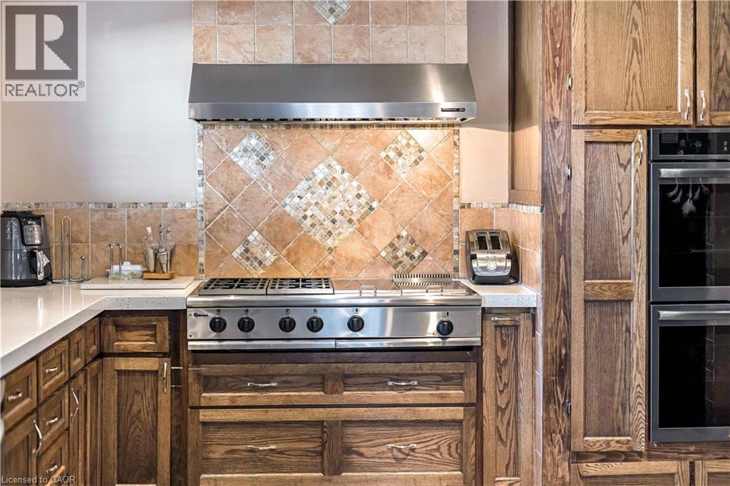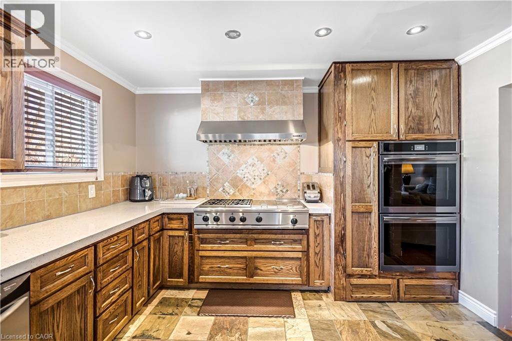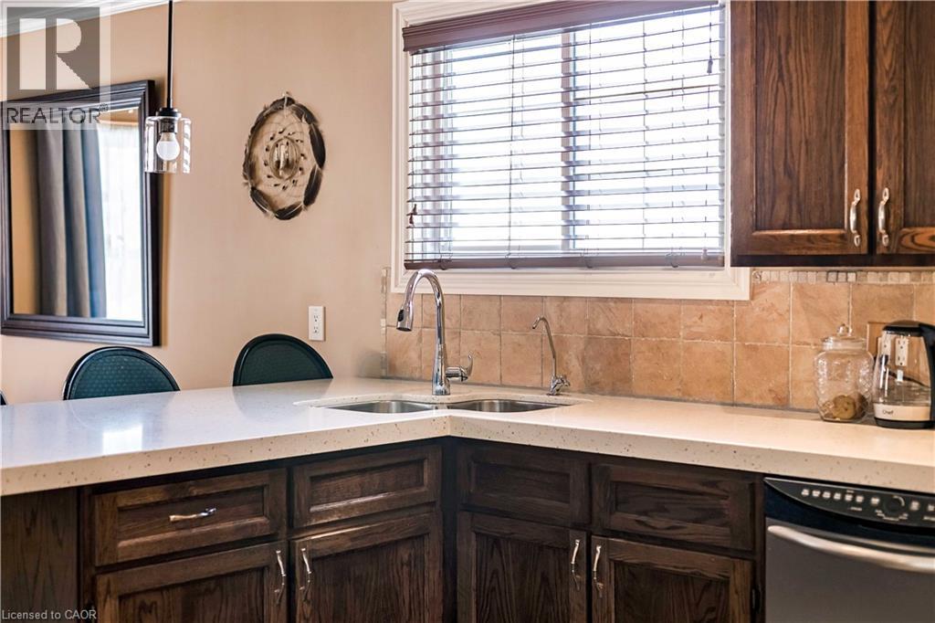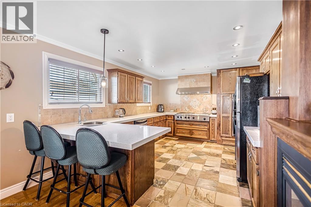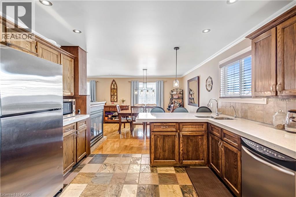 Welcome to 97 Kinross Street! Located in a quiet, family-friendly neighbourhood in Caledonia, this beautifully maintained 3+1 bed, 2 bath raised bungalow offers the perfect blend of space, comfort & everyday convenience for family living. Enjoy nearby parks, schools, walking trails & quick access to local amenities, all just moments from the scenic Grand River. Step inside to a spacious foyer with slate tile flooring that separates the upper & lower levels, complete with inside entry from the attached garage & sliding doors leading to the backyard, where an expansive gazebo creates a fantastic space for outdoor gatherings with family & friends. The main level features gleaming hardwood floors & a cozy 3-way gas fireplace anchoring the living & dining areas. The kitchen is both functional & beautifully finished with espresso-washed cabinetry, slate flooring, quartz countertops & stainless steel appliances, including a commercial-grade gas stovetop with grill & oversized industrial-style range, plus a convenient breakfast bar for casual meals. Generously sized bedrooms offer large windows, natural light & ample closet space, while the main bathroom features upgraded countertops & a glass-enclosed stand-up shower, reflecting the home’s timeless, elegant finishes. The fully finished lower level with 9 ft ceilings adds valuable living space with a spacious rec room, office area adjacent to the rec room, additional bedroom large enough for a king bed, a 3-piece bath with relaxing soaker tub, plus laundry & storage. Outside, the backyard offers plenty of room to relax or entertain, complemented by a large sheltered outdoor area that extends the home’s entertaining possibilities in any season. Completing the property is a 1-car attached garage & extra-wide driveway that comfortably fits 6 vehicles, with potential space for more. A wonderful opportunity to enjoy space, comfort & family living in a welcoming Caledonia neighbourhood. (id:64974)