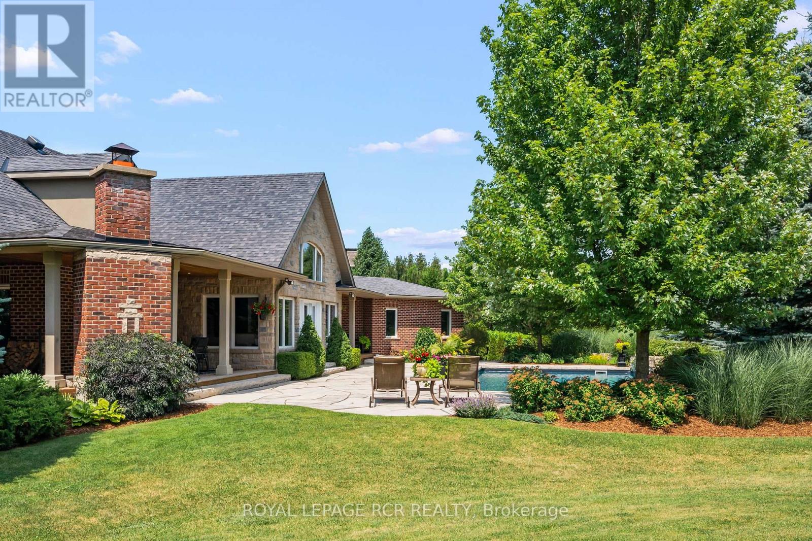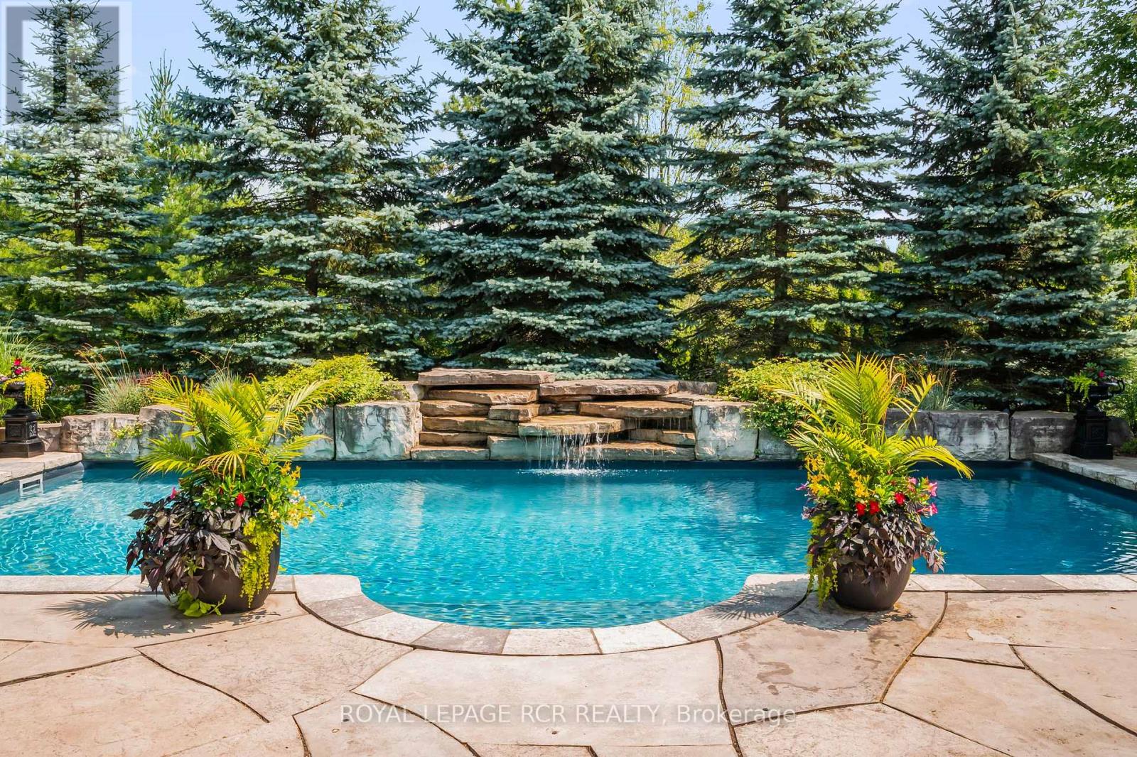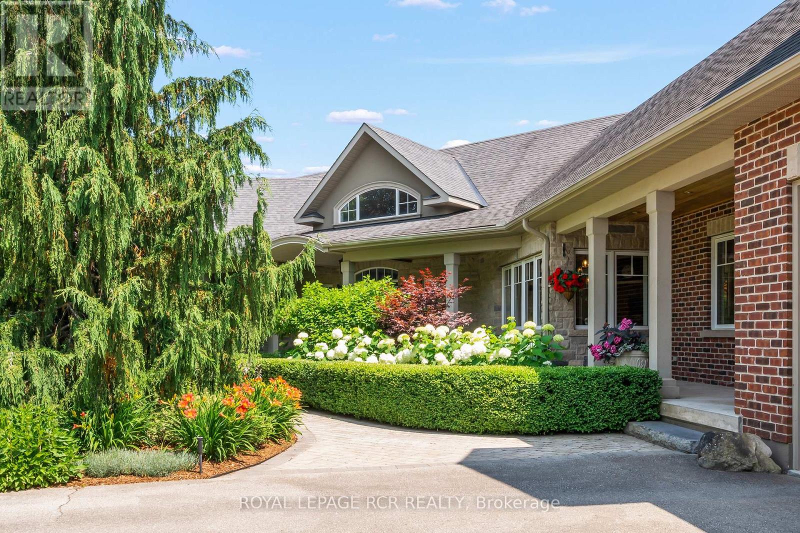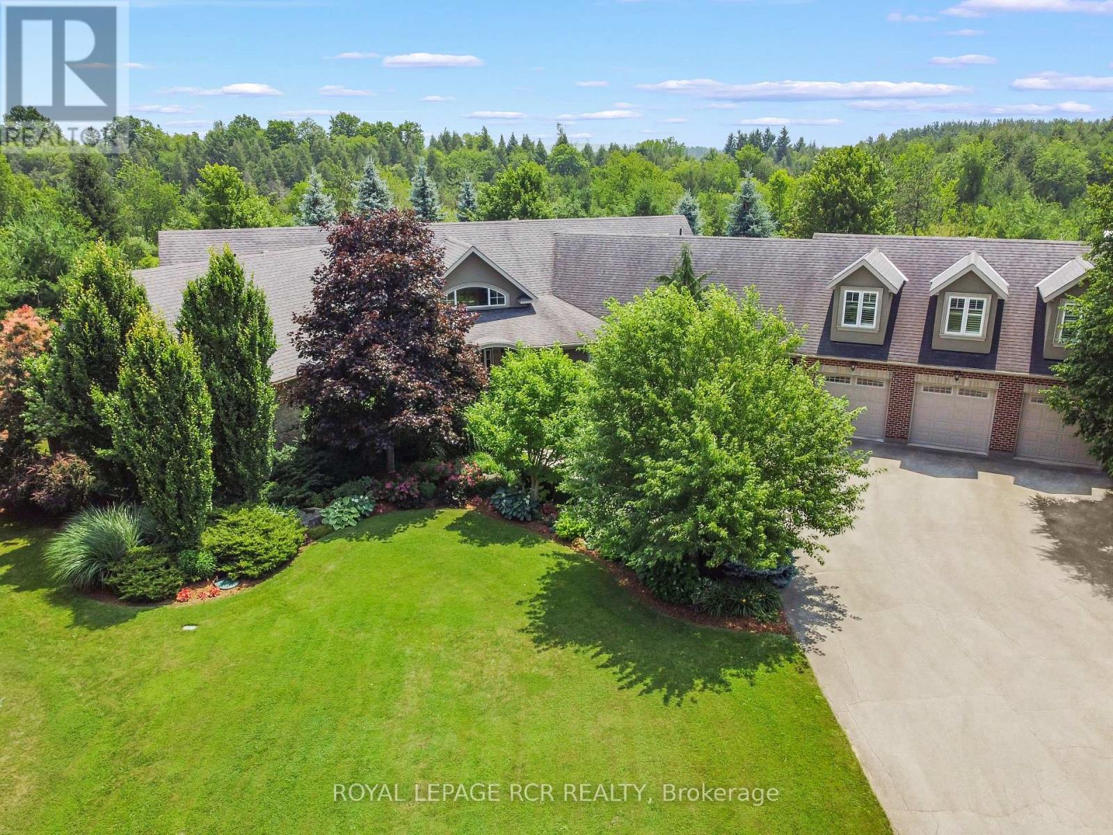 Welcome to your own private paradise just outside of Erin - where luxury, lifestyle, and location converge. This exquisite executive bungalow offers approximately 8,000 sq ft of total finished living space, blending comfort, elegance, and thoughtful design, both inside and out. Set on a beautifully landscaped lot just over an acre, the property is fully fenced and equipped with an in-ground sprinkler system. The backyard is a true oasis for relaxation and entertainment. Dive into the saltwater pool with a cascading waterfall, unwind in the covered hot tub, or host gatherings under the covered porch featuring cedar ceilings, outdoor speakers, a TV, and a wood-burning fireplace for cozy evenings. This outdoor space feels like your private resort, perfect for summer parties or tranquil morning coffees amid lush gardens. Inside, the main floor spans 3,500 sqft with soaring cathedral ceilings in the stunning great room. Durable bamboo flooring and a double- sided fireplace enhance the home's heart, while the eat-in chef-inspired kitchen, updated in 2022, boasts high-end appliances and ample prep space, ideal for daily meals or entertaining. Three generous bedrooms on the main level each offer their own ensuite bathrooms, including the luxurious primary suite with heated floors in both the ensuite and shoe room, a soaker tub beside a fireplace feature, and a walkout to the hot tub. A versatile 1,000 sqft loft above the oversized 3-car garage serves as guest space or a home studio, complete with a three piece bathroom with heated floors. The finished lower level adds approximately 3,500 sqft of living space, featuring heated floors, two bedrooms, two full baths, and a full kitchen. With smart technology and premium finishes, this home is not just a residence; it's a lifestyle. Close to schools, shopping, dining, equestrian centres, golf, and the nearby Elora Cataract Trail, it offers everything you need for a luxurious life. (id:64974)