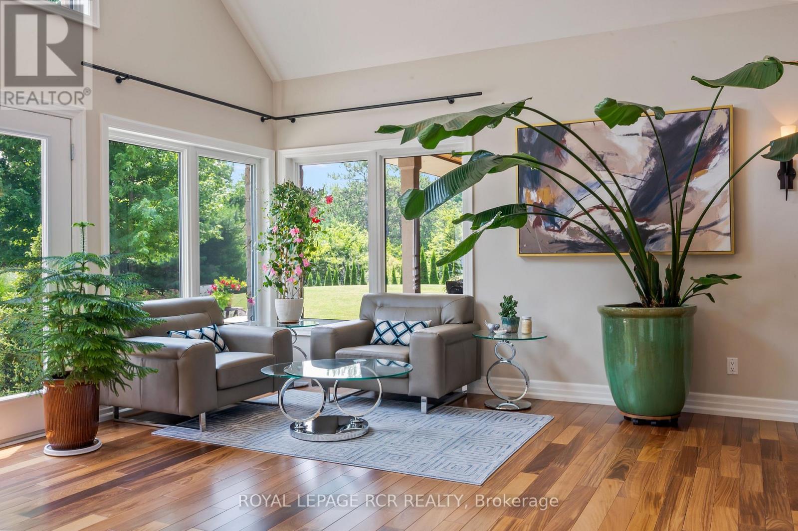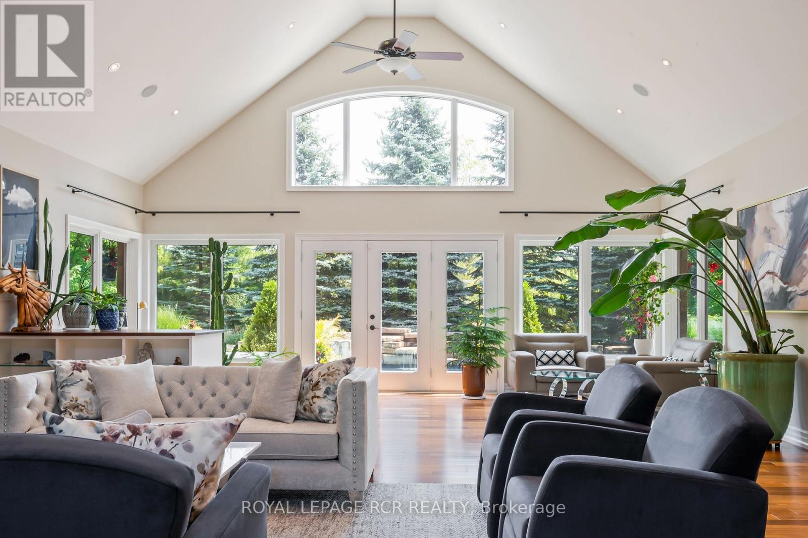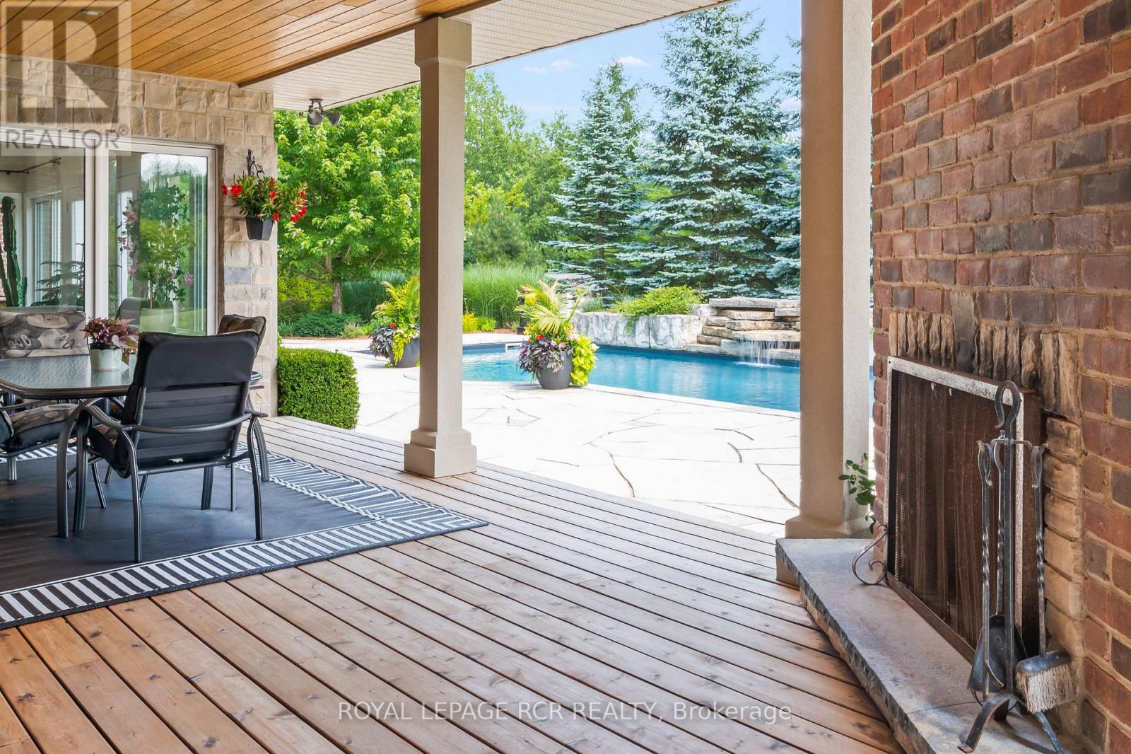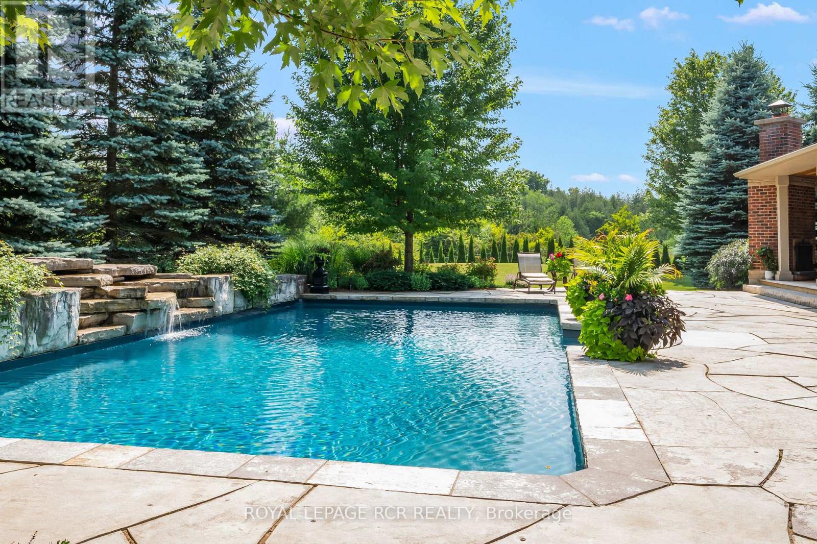 Welcome to your own private paradise just outside of Erin - where luxury, lifestyle, and location converge. This exquisite executive bungalow offers approximately 8,000 sq ft of total finished living space, blending comfort, elegance, and thoughtful design, both inside and out. Set on a beautifully landscaped lot just over an acre, the property is fully fenced and equipped with an in-ground sprinkler system. The backyard is a true oasis for relaxation and entertainment. Dive into the saltwater pool with a cascading waterfall, unwind in the covered hot tub, or host gatherings under the covered porch featuring cedar ceilings, outdoor speakers, a TV, and a wood-burning fireplace for cozy evenings. This outdoor space feels like your private resort, perfect for summer parties or tranquil morning coffees amid lush gardens. Inside, the main floor spans 3,500 sqft with soaring cathedral ceilings in the stunning great room. Durable bamboo flooring and a double- sided fireplace enhance the home's heart, while the eat-in chef-inspired kitchen, updated in 2022, boasts high-end appliances and ample prep space, ideal for daily meals or entertaining. Three generous bedrooms on the main level each offer their own ensuite bathrooms, including the luxurious primary suite with heated floors in both the ensuite and shoe room, a soaker tub beside a fireplace feature, and a walkout to the hot tub. A versatile 1,000 sqft loft above the oversized 3-car garage serves as guest space or a home studio, complete with a three piece bathroom with heated floors. The finished lower level adds approximately 3,500 sqft of living space, featuring heated floors, two bedrooms, two full baths, and a full kitchen. With smart technology and premium finishes, this home is not just a residence; it's a lifestyle. Close to schools, shopping, dining, equestrian centres, golf, and the nearby Elora Cataract Trail, it offers everything you need for a luxurious life. (id:64974)