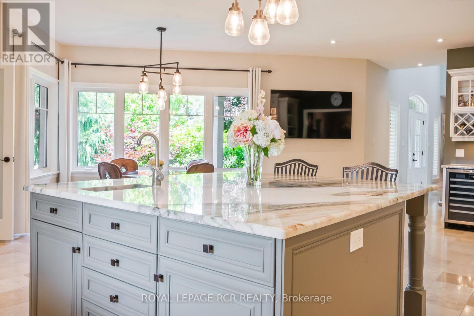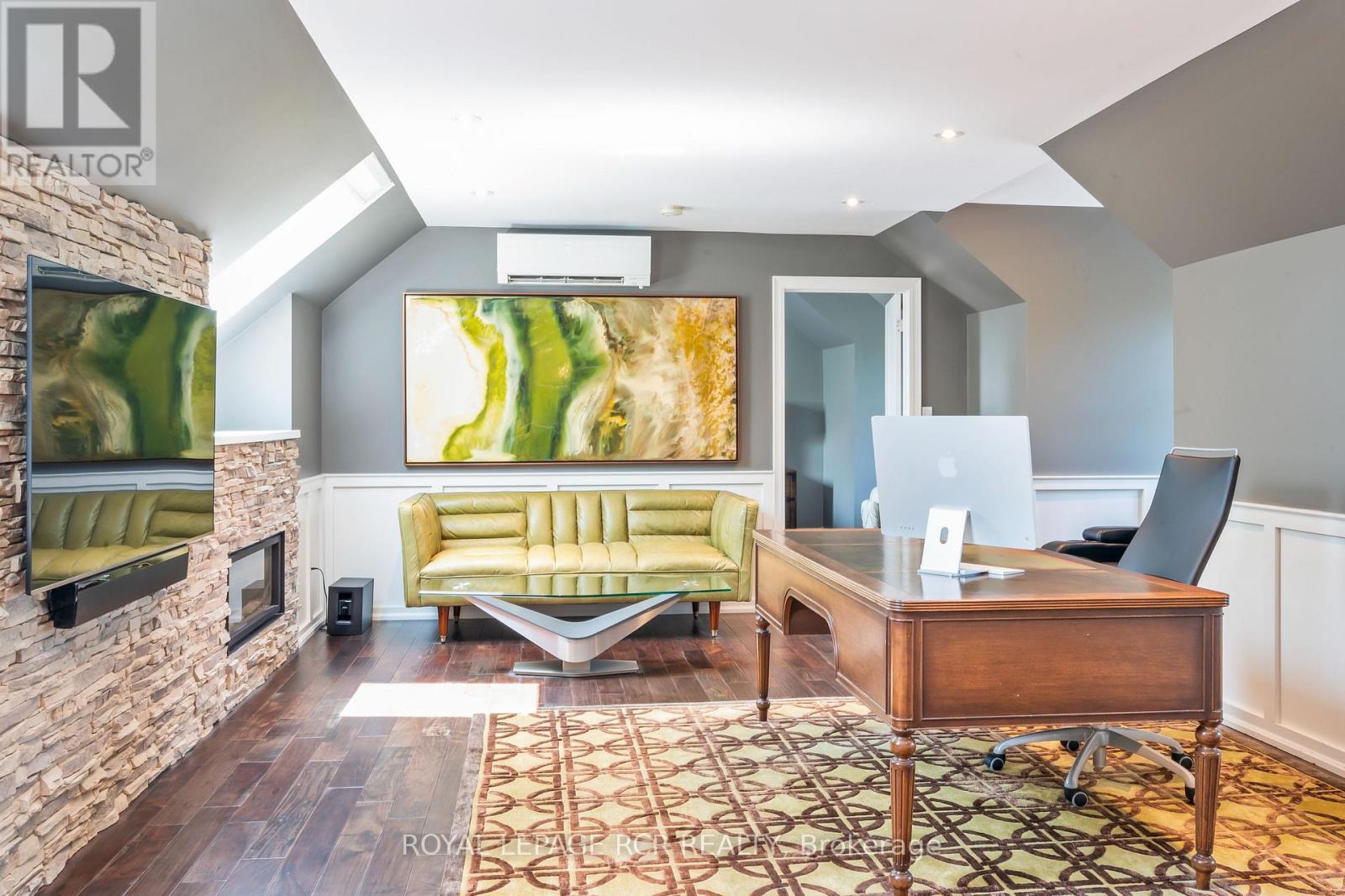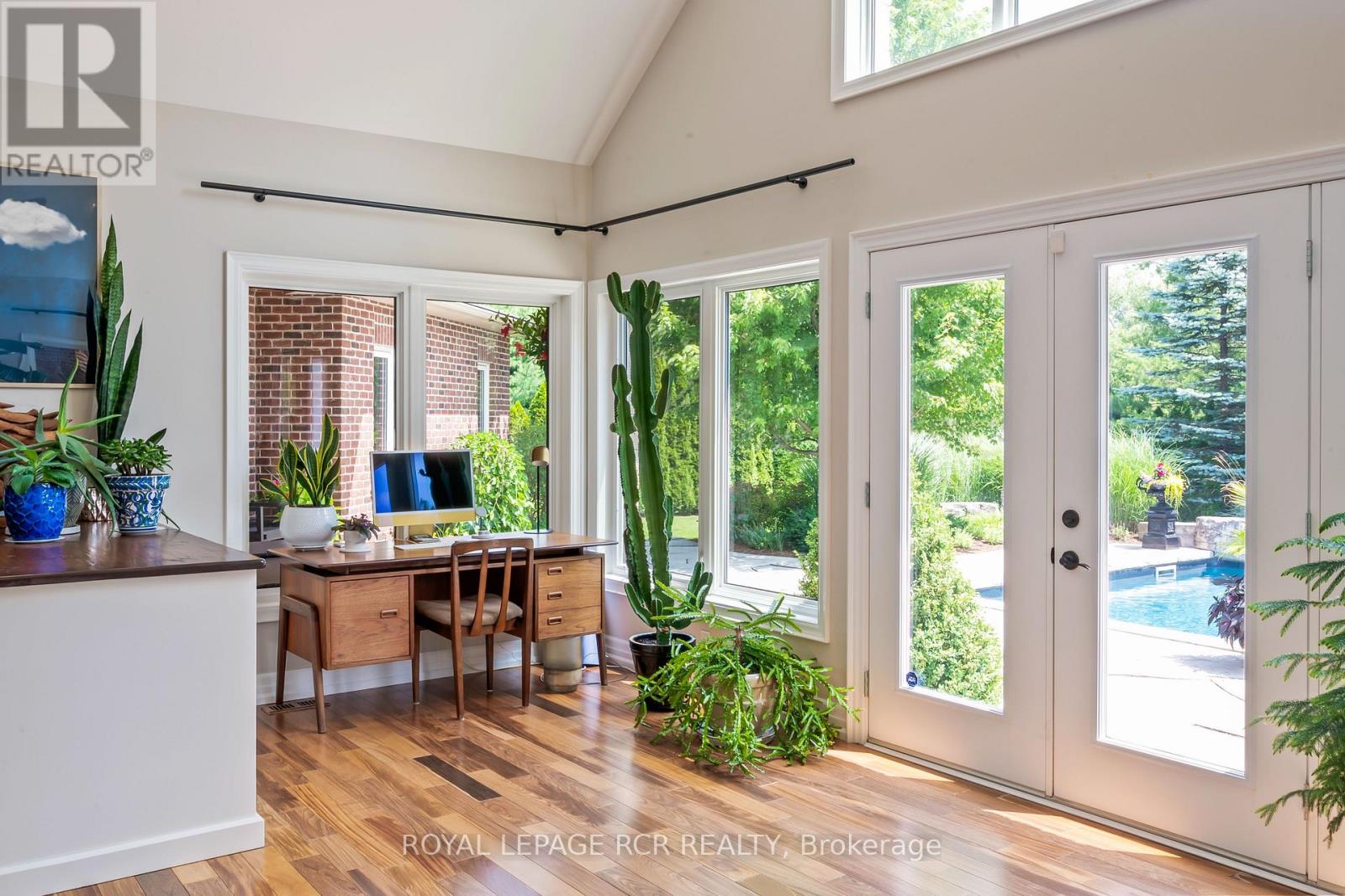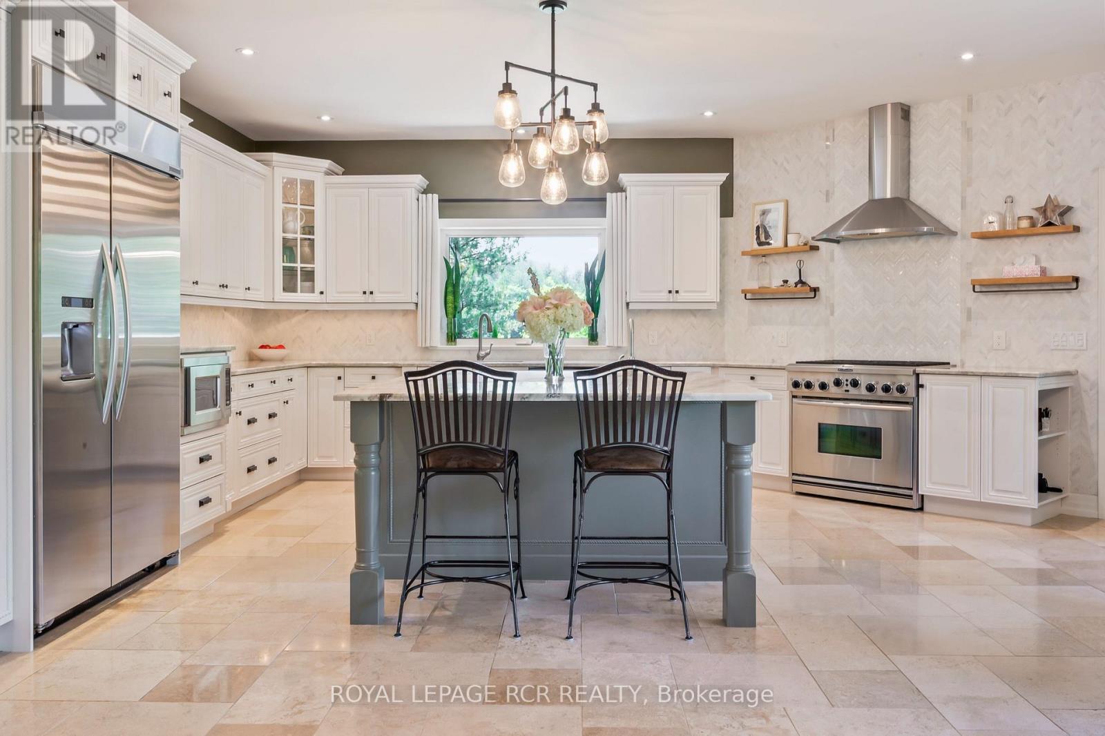 Welcome to your own private paradise just outside of Erin - where luxury, lifestyle, and location converge. This exquisite executive bungalow offers approximately 8,000 sq ft of total finished living space, blending comfort, elegance, and thoughtful design, both inside and out. Set on a beautifully landscaped lot just over an acre, the property is fully fenced and equipped with an in-ground sprinkler system. The backyard is a true oasis for relaxation and entertainment. Dive into the saltwater pool with a cascading waterfall, unwind in the covered hot tub, or host gatherings under the covered porch featuring cedar ceilings, outdoor speakers, a TV, and a wood-burning fireplace for cozy evenings. This outdoor space feels like your private resort, perfect for summer parties or tranquil morning coffees amid lush gardens. Inside, the main floor spans 3,500 sqft with soaring cathedral ceilings in the stunning great room. Durable bamboo flooring and a double- sided fireplace enhance the home's heart, while the eat-in chef-inspired kitchen, updated in 2022, boasts high-end appliances and ample prep space, ideal for daily meals or entertaining. Three generous bedrooms on the main level each offer their own ensuite bathrooms, including the luxurious primary suite with heated floors in both the ensuite and shoe room, a soaker tub beside a fireplace feature, and a walkout to the hot tub. A versatile 1,000 sqft loft above the oversized 3-car garage serves as guest space or a home studio, complete with a three piece bathroom with heated floors. The finished lower level adds approximately 3,500 sqft of living space, featuring heated floors, two bedrooms, two full baths, and a full kitchen. With smart technology and premium finishes, this home is not just a residence; it's a lifestyle. Close to schools, shopping, dining, equestrian centres, golf, and the nearby Elora Cataract Trail, it offers everything you need for a luxurious life. (id:64974)