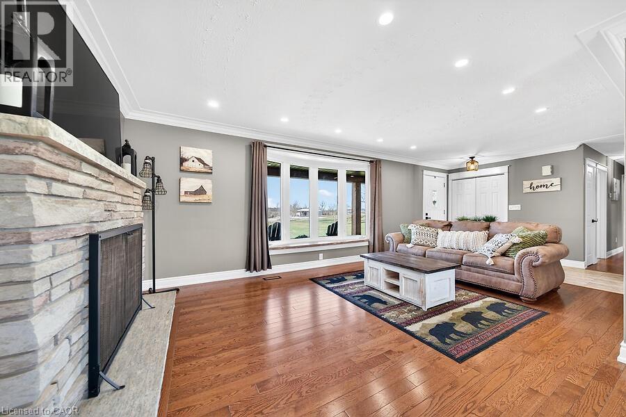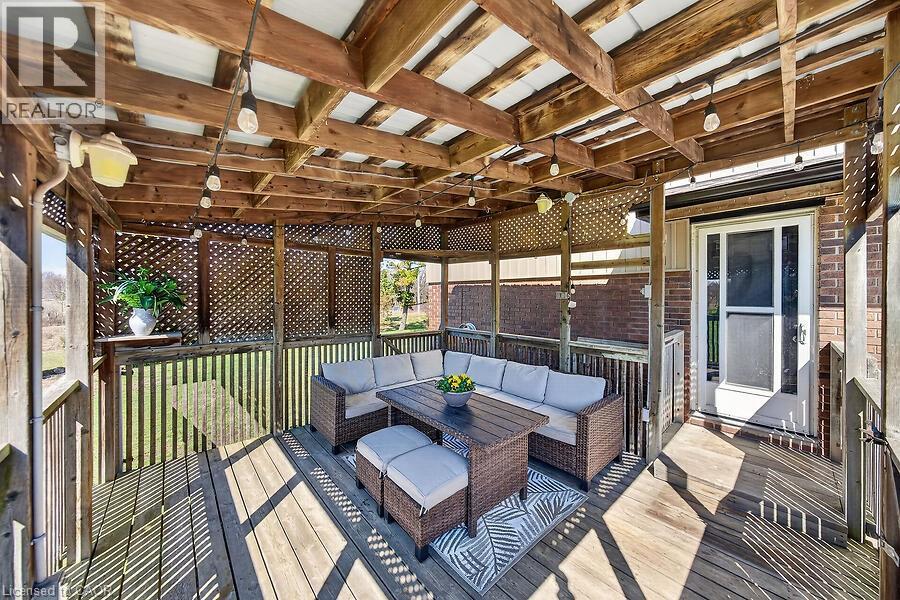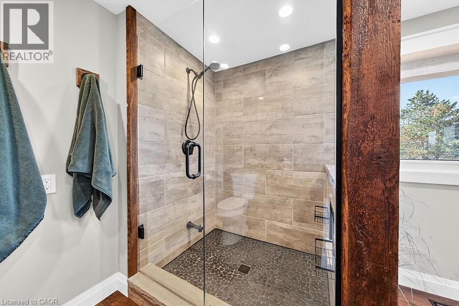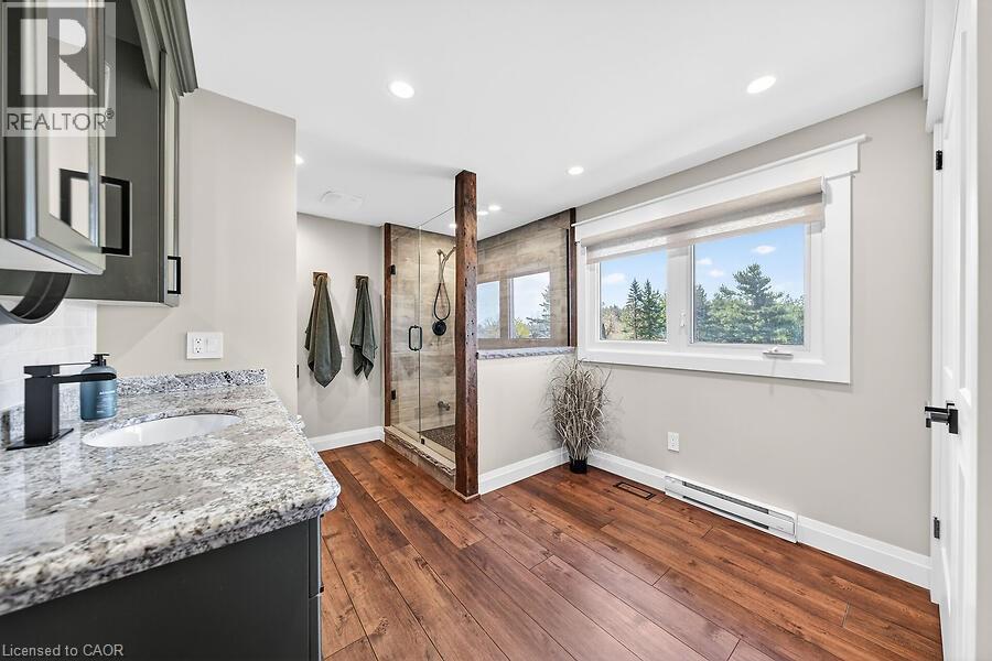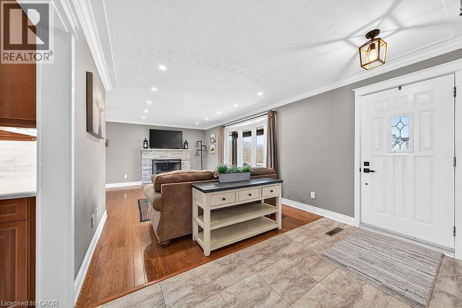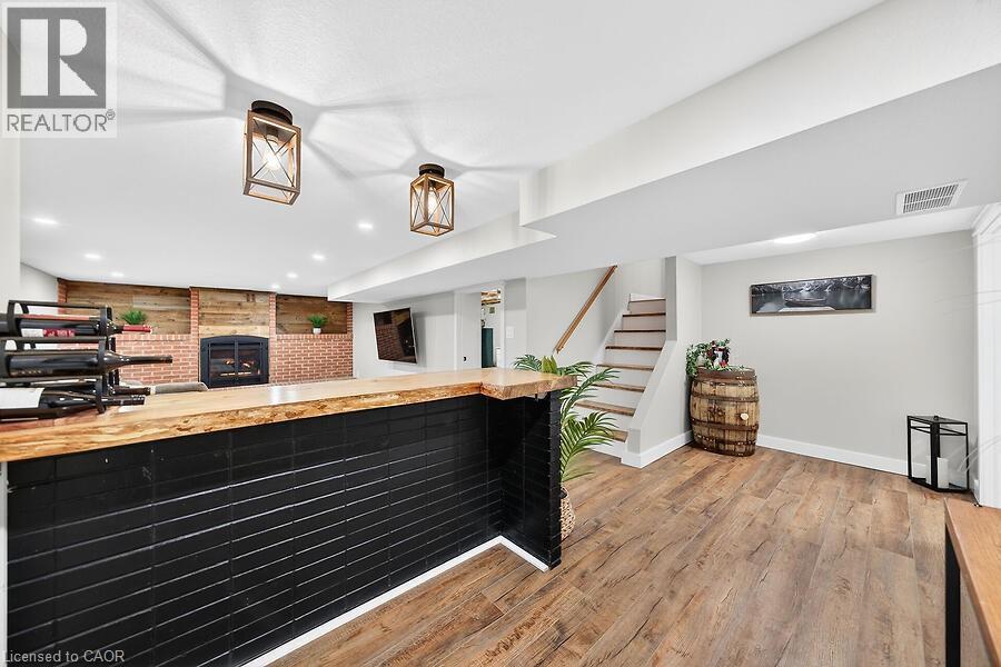 Welcome to this country 4+1, 2 full bath home with natural gas heating, set on a private lot in West Lincoln. The main floor features an L-shaped living and dining room with hardwood floors and a bay window overlooking the expansive front porch. The upgraded kitchen offers custom cabinetry and access to the backyard patio, hot tub, and lower level. There are 3 main floor bedrooms and a beautifully renovated custom bathroom. Off the dining room, the upper-level primary retreat offers a separate entrance, electric fireplace, reclaimed wood accents, and an upgraded ensuite with walk-in shower. The recently renovated lower level includes soundproofing, new flooring, a spacious open-concept family room with wall-to-wall brick and natural gas fireplace insert, bar area with live-edge finishes, an additional bedroom with walk-up access to the attached garage, plus storage and utility rooms. The south-facing outdoor space is perfect for relaxing and enjoying sunset spritzes. Bonus features include reclaimed wood and natural stone finishes, extensive pot lighting, forced air natural gas heating, and generator. (id:64974)