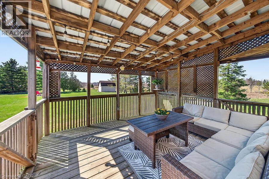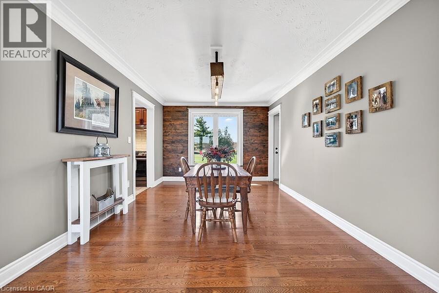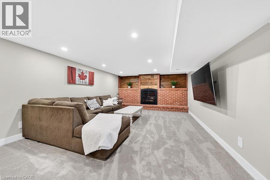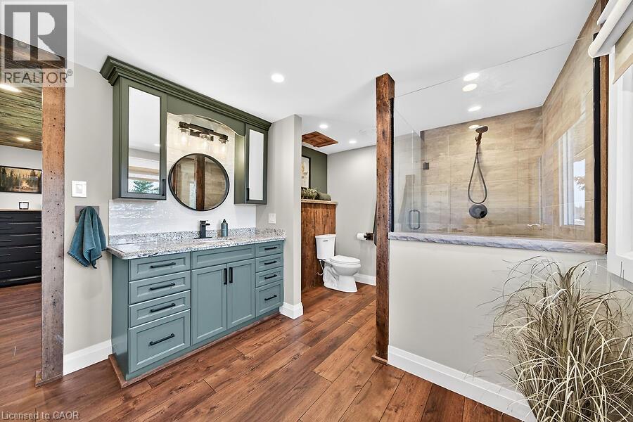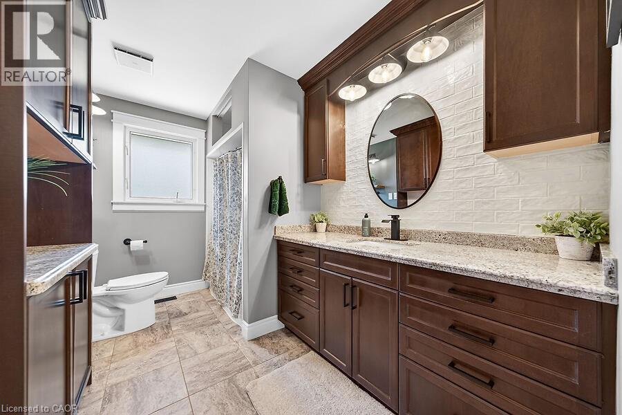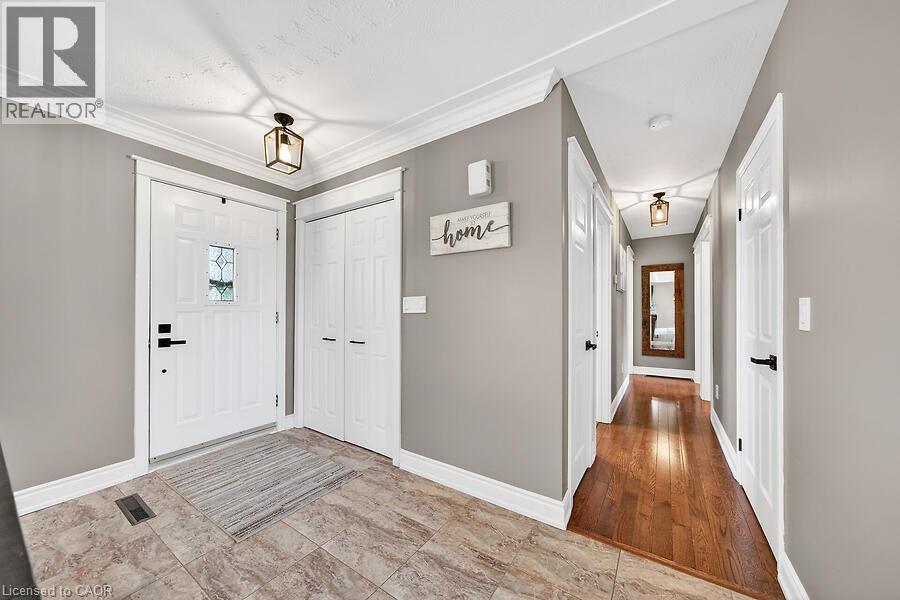 Welcome to this country 4+1, 2 full bath home with natural gas heating, set on a private lot in West Lincoln. The main floor features an L-shaped living and dining room with hardwood floors and a bay window overlooking the expansive front porch. The upgraded kitchen offers custom cabinetry and access to the backyard patio, hot tub, and lower level. There are 3 main floor bedrooms and a beautifully renovated custom bathroom. Off the dining room, the upper-level primary retreat offers a separate entrance, electric fireplace, reclaimed wood accents, and an upgraded ensuite with walk-in shower. The recently renovated lower level includes soundproofing, new flooring, a spacious open-concept family room with wall-to-wall brick and natural gas fireplace insert, bar area with live-edge finishes, an additional bedroom with walk-up access to the attached garage, plus storage and utility rooms. The south-facing outdoor space is perfect for relaxing and enjoying sunset spritzes. Bonus features include reclaimed wood and natural stone finishes, extensive pot lighting, forced air natural gas heating, and generator. (id:64974)