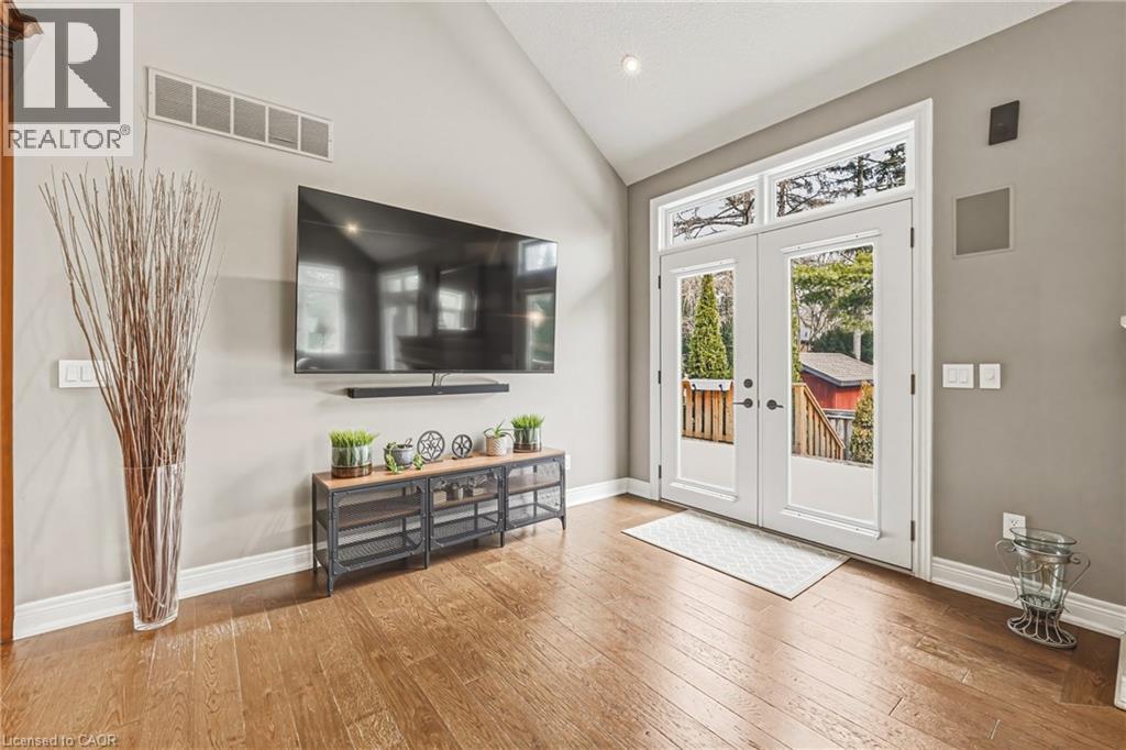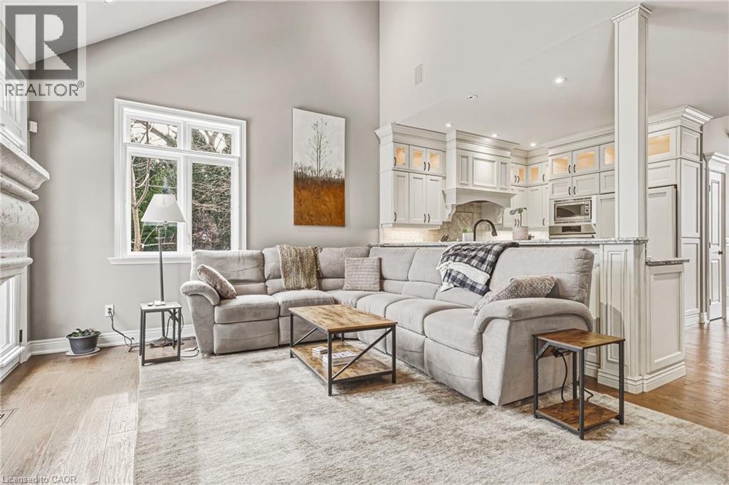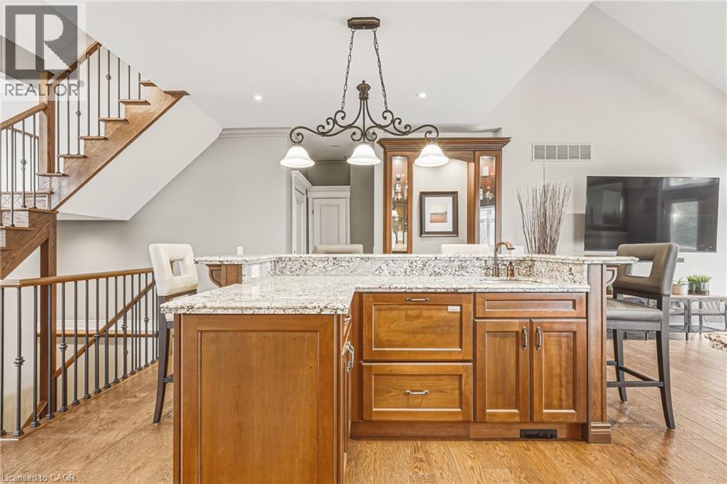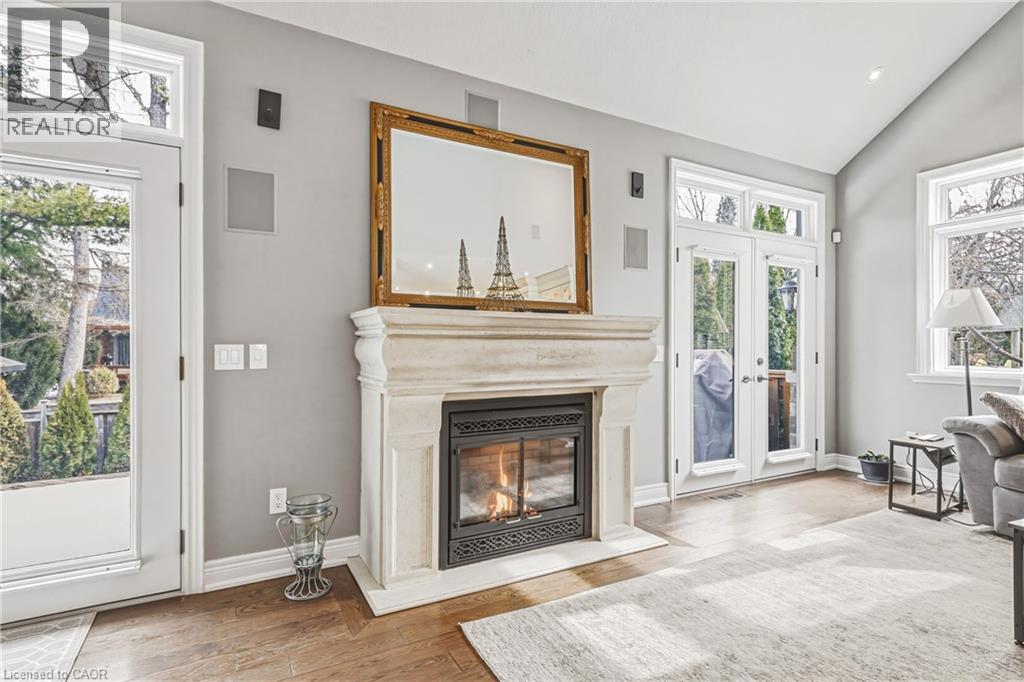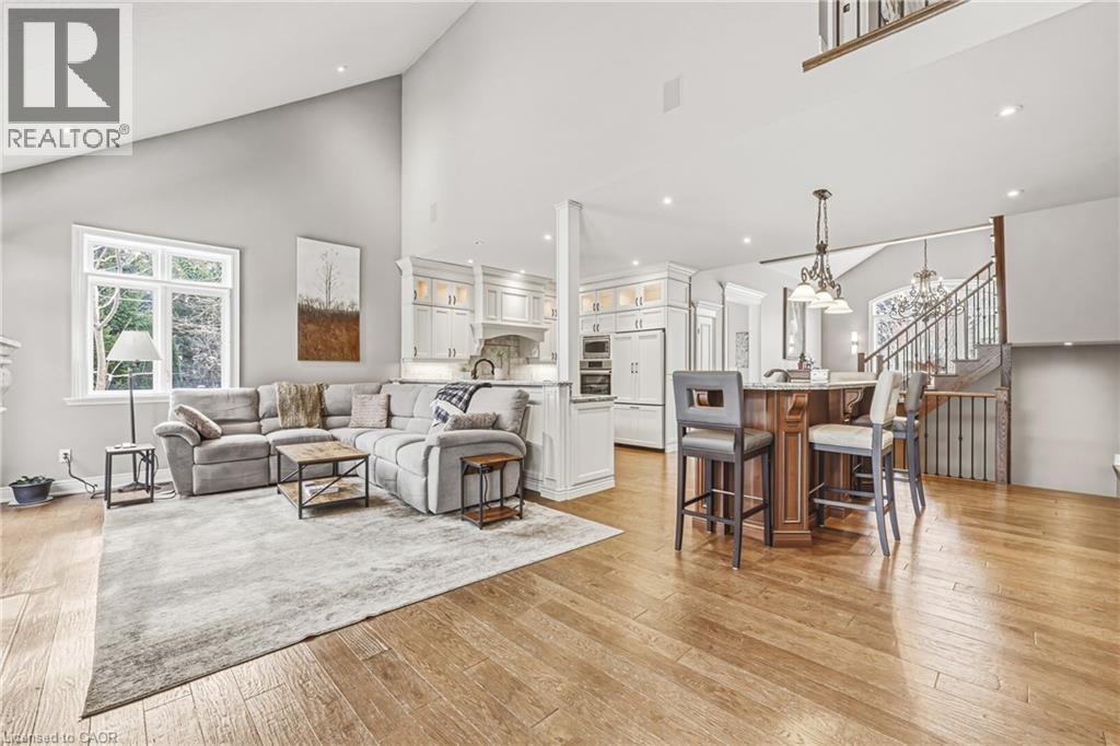 This STUNNING renovated, detached BUNGALOFT sits in a quiet enclave in Aldershot. Featuring 3+2 bedrooms, 3.5 bathrooms, over 2400 square feet PLUS a fully finished lower level and a DOUBLE car garage! The home features quality designer finishes and fixtures throughout. The open concept floor plan boasts vaulted ceilings, hardwood flooring and plenty of natural light. The large foyer opens to the dramatic, oversized dining room with 14’ ceilings. The incredible kitchen features custom cabinetry, a large accent island, granite counters and top-quality appliances. The kitchen flows directly to the large 2-storey family room which includes custom built-ins, a gas fireplace, in-wall speakers and two sets of french doors leading to the private backyard. The large primary bedroom has a walk-in closet and a spa-like 4-piece ensuite with heated flooring. The main level also includes a separate powder room and garage access! The 2nd level includes 2 spacious bedrooms, a beautiful 4-piece bathroom and laundry room. The professionally finished lower level features 9 ft ceilings, radiant in-floor heat flooring throughout, 2 bedrooms AND a den, a 3-piece bathroom, large rec room / media room and plenty of storage space! The exterior of the home has been extensively landscaped and features a private low maintenance backyard with a large deck and turf! Amazing location- close to all amenities and transportation! (id:64974)
