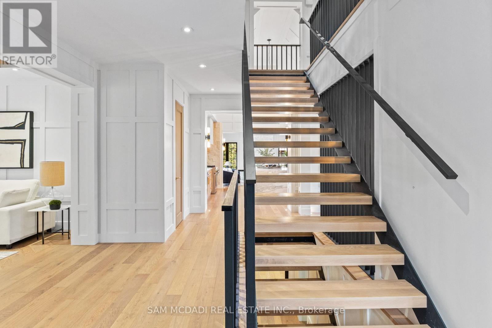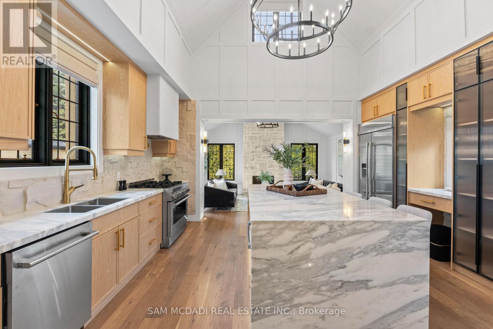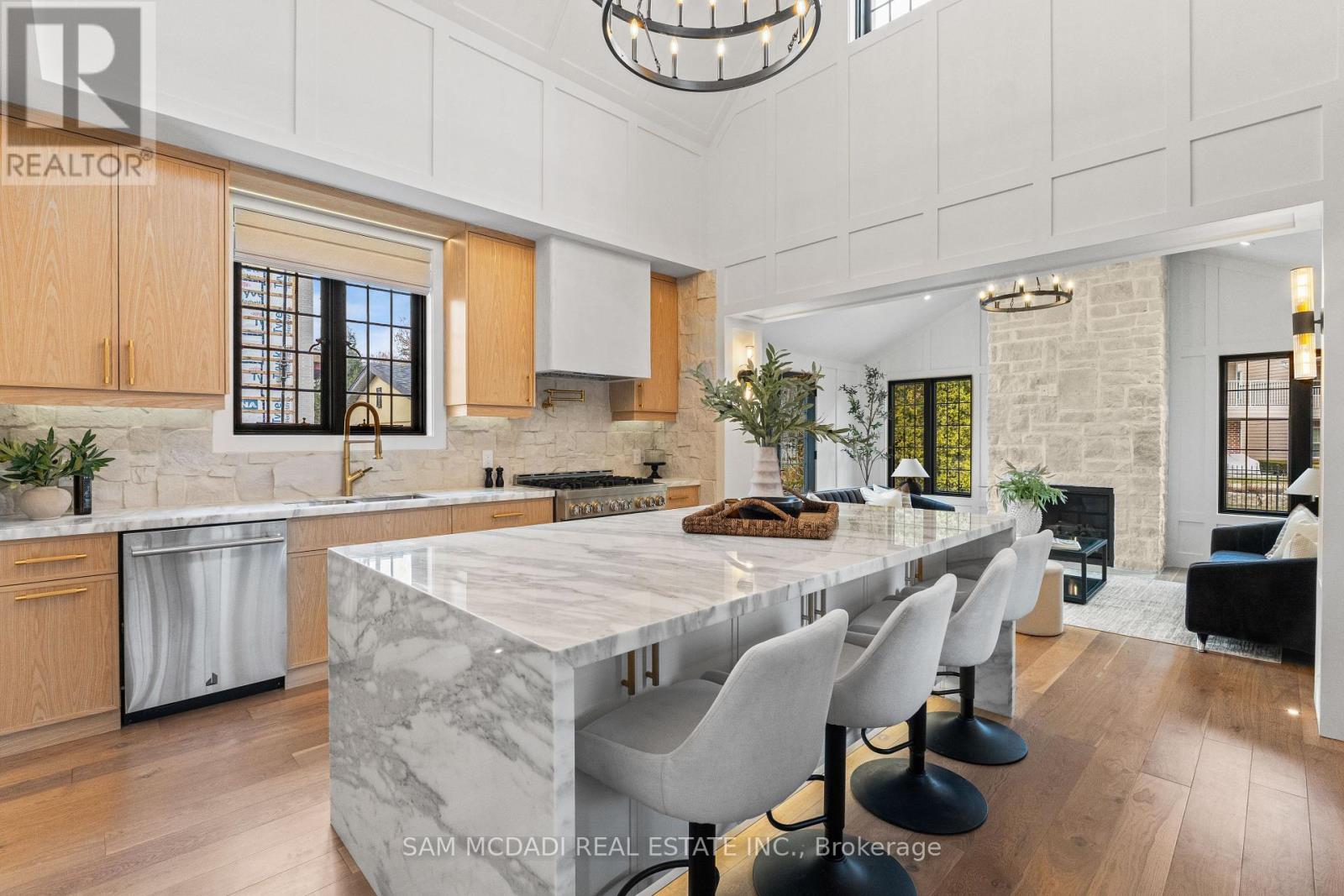 Welcome to the famous George Unsworth home, a high quality Neo-Tudor style home constructed with cut & carved stone alongside a textured stucco exterior finish. Redesigned by renowned architect Walter Scott, and located in Aldershot's upscale neighbourhood, this beautiful home w/ approximately 5,000 SF total has been completely reimagined w/ a modern yet charming design. Upon entering, you'll find large principal rooms enhanced with sophisticated hardwood floors, LED pot lights, panelled walls, and more. At the heart of this home is where you'll locate the chef's kitchen elevated w/ a centre island, stone countertops, JennAir appliances, charming stone backsplash and ample cabinetry space. Overlooking the kitchen is the grand family room, which boasts cathedral ceilings, a stone fireplace, and direct access to your covered outdoor patio, perfect for al-fresco dining with loved ones. Also on this level is the formal living room, which features a fireplace, wood beam ceilings, and access to the outdoor patio, as well as a home office perfect for professionals working from home. Ascend to the owner's suite, curated with a boutique inspired walk-in closet, a wet-bar, and an oversized 6-pc ensuite w/ heated floors, a soaker tub, and a rainfall shower. 2 more bedrooms with built-in closets and a shared 3-pc bath with heated floors are down the hall. The loft can easily serve as a nanny or in-law suite, featuring a spacious bedroom w/ a 3-pc ensuite, a seating area, and a separate laundry room. The basement completes this home with perfect entertainment spaces incl: a wet bar, a large recreation room, a 5th bedroom, a 3-pc bath w/ heated floors, and a den that can serve as a gym, play room, spa, or theatre - the possibilities are endless. Beautifully situated in a highly rated family oriented neighbourhood nearby top rated schools, grocery stores, shopping malls, lakeside parks and trails & more. A piece of history with a modern twist! (id:64974)
