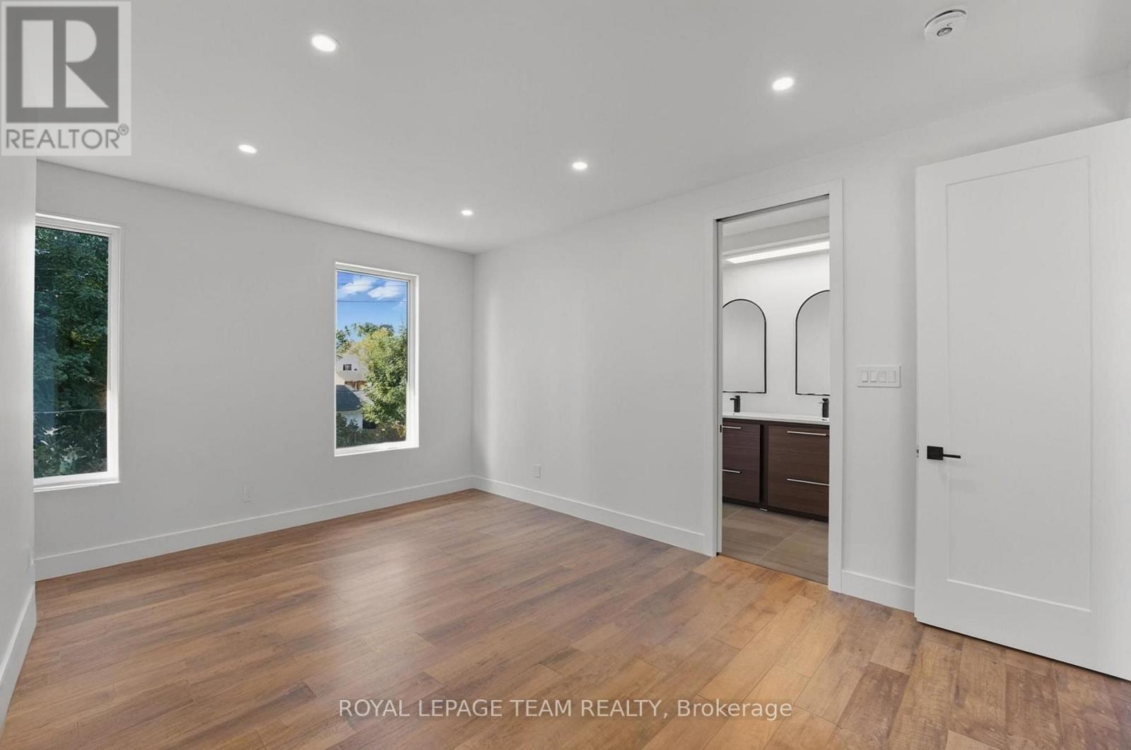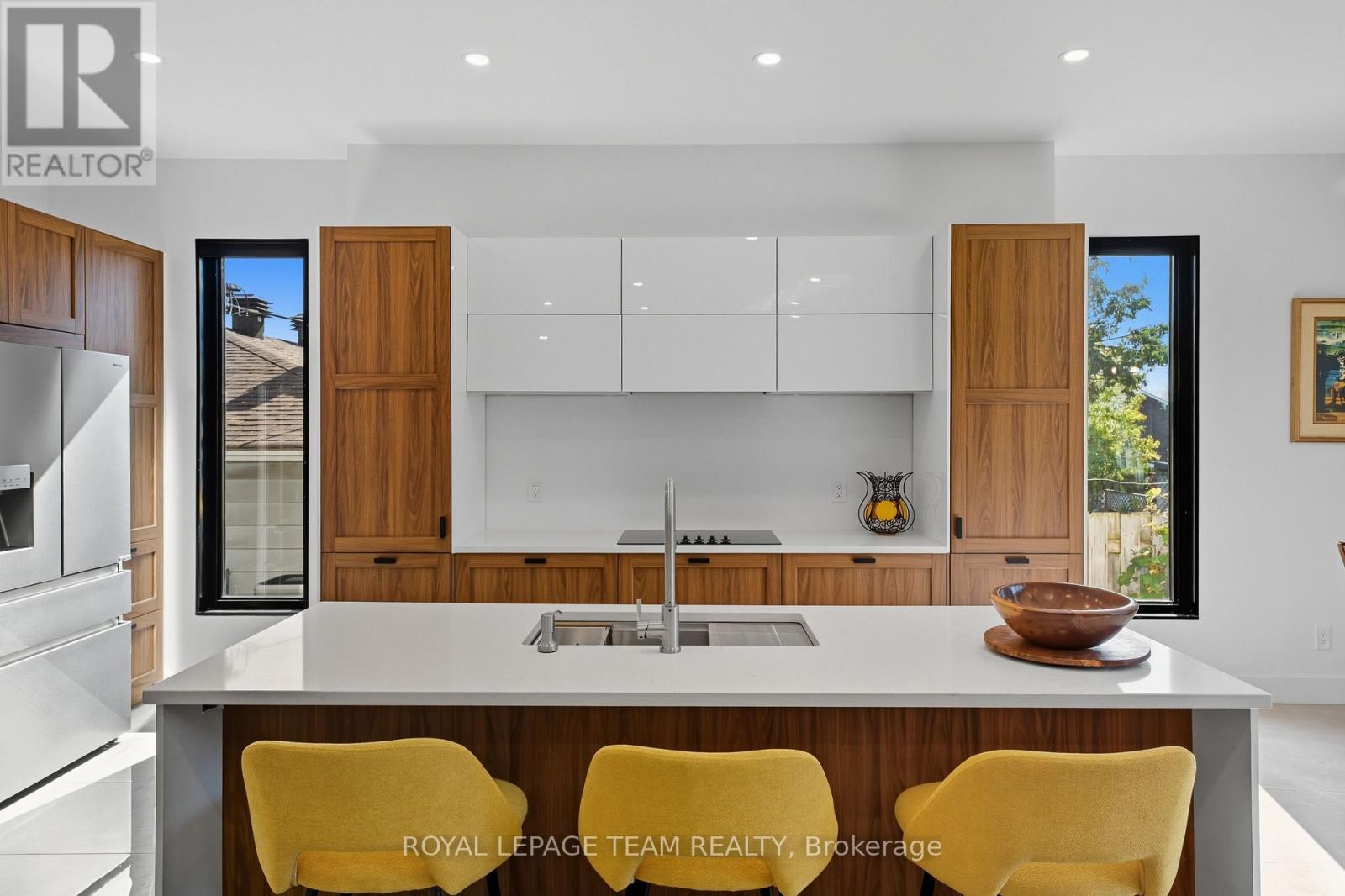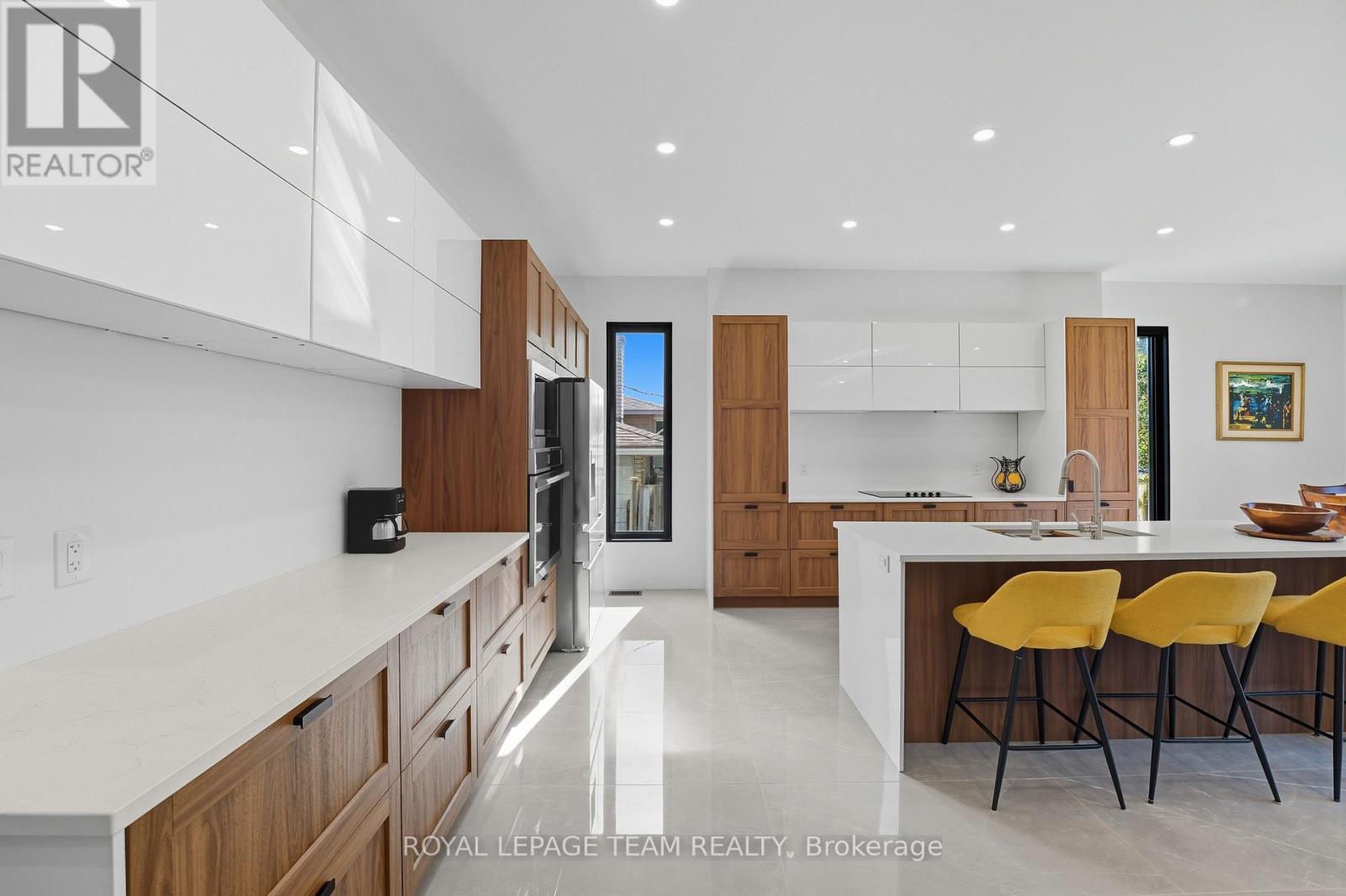 This custom semi at 984 Watson blends modern design, and low maintenance luxury with everyday function and flexibility - Featuring over 2,900 sq.ft. of living space, 4 beds, 4 baths, and an attached garage with inside entry. The main level showcases a modern open concept layout anchored by a two-tone kitchen (waterfall island, quartz counters, double wall ovens, sleek cooktop, under-mount island sink) set against large-format polished porcelain and pot lights; dining flows to a bright great room with a linear feature fireplace and oversized black-framed sliders to the yard, while a statement open-riser staircase elevates the architecture and a mud/laundry plus powder room keep life effortless. Upstairs, wide-plank wood floors lead to a bright office area / loft, and three generous bedrooms, including a primary retreat with a custom walk-in closet with built-ins, and spa-style ensuite (double vanity, freestanding soaker, oversized glass shower); a chic family bath adds an oversized shower with rain head + body jets. The lower level offers incredible flexibility, designed with a self-contained suite complete with private exterior entrance, living area, 4th bedroom, full bath, and kitchenette/wet-bar. Perfect for multi-generational living, an in-law suite, teenage retreat, home office, or private rental income unit. Prefer single-family living? The space can easily be re-opened to extend the main home's lower level.Step outside to enjoy an easy-care yard and unbeatable convenience: minutes to IKEA, Bayshore Shopping Centre, good schools, Algonquin College, and Hwy417, with fast transit at Pinecrest Station on the east-west LRT extension; parks, the Ottawa River Pathway, Elmhurst Park, Frank Ryan Park, and Britannia Beach are all close by. Disclosure: Sale is conditional upon final registration of the approved severance. Conditional consent has been granted, and municipal requirements have been satisfied. Final registration is in progress with the Seller's lawyer. (id:64974)