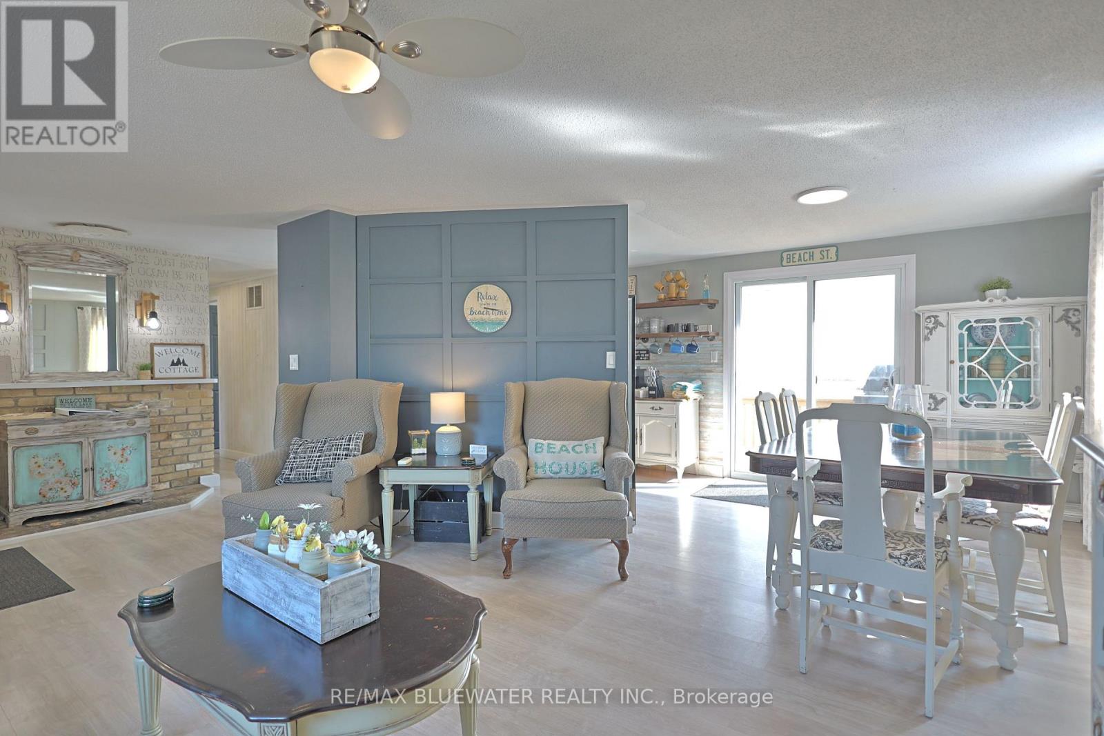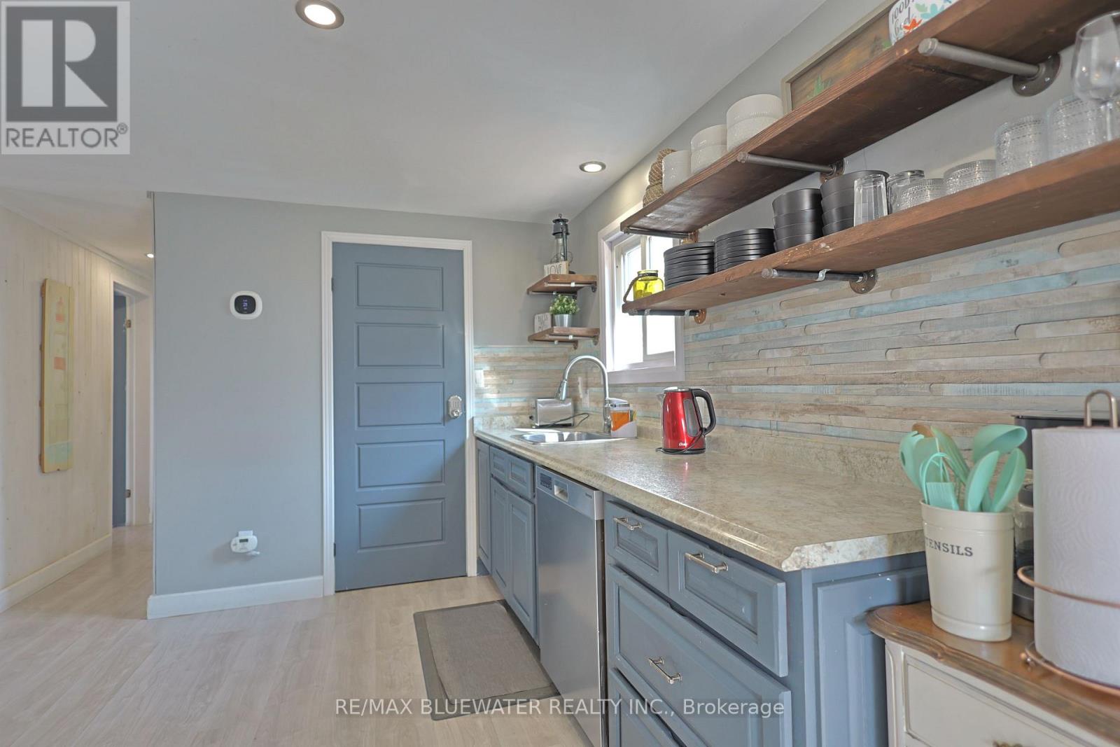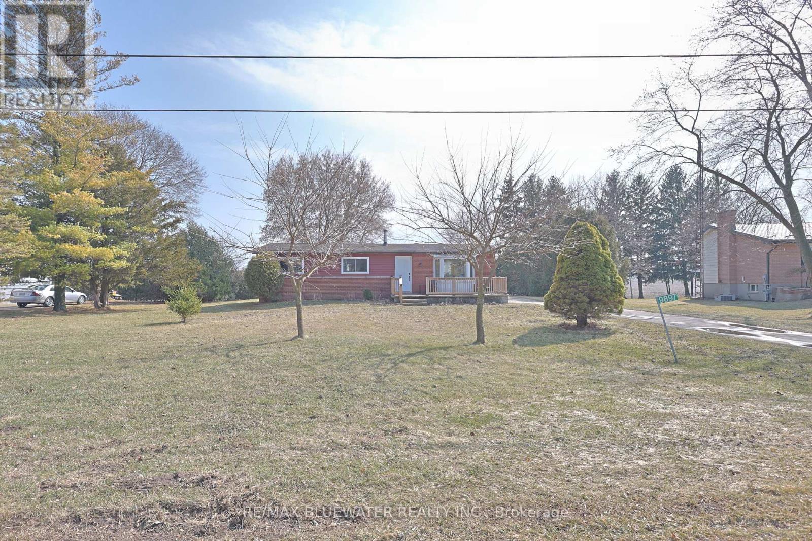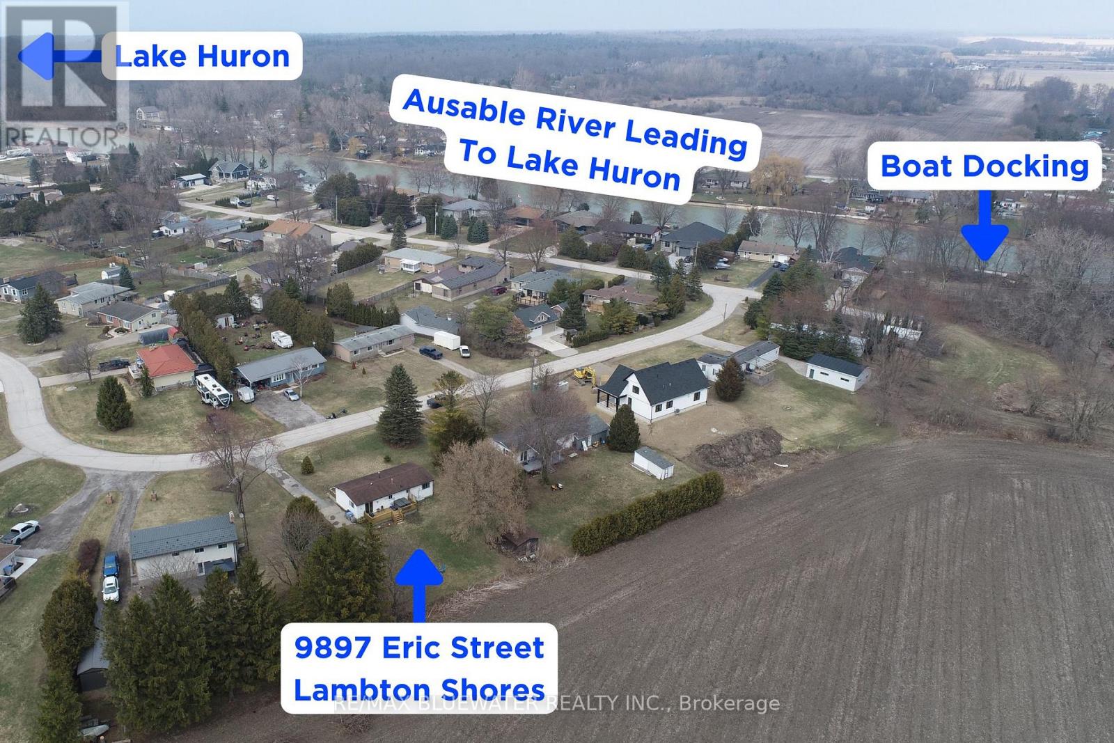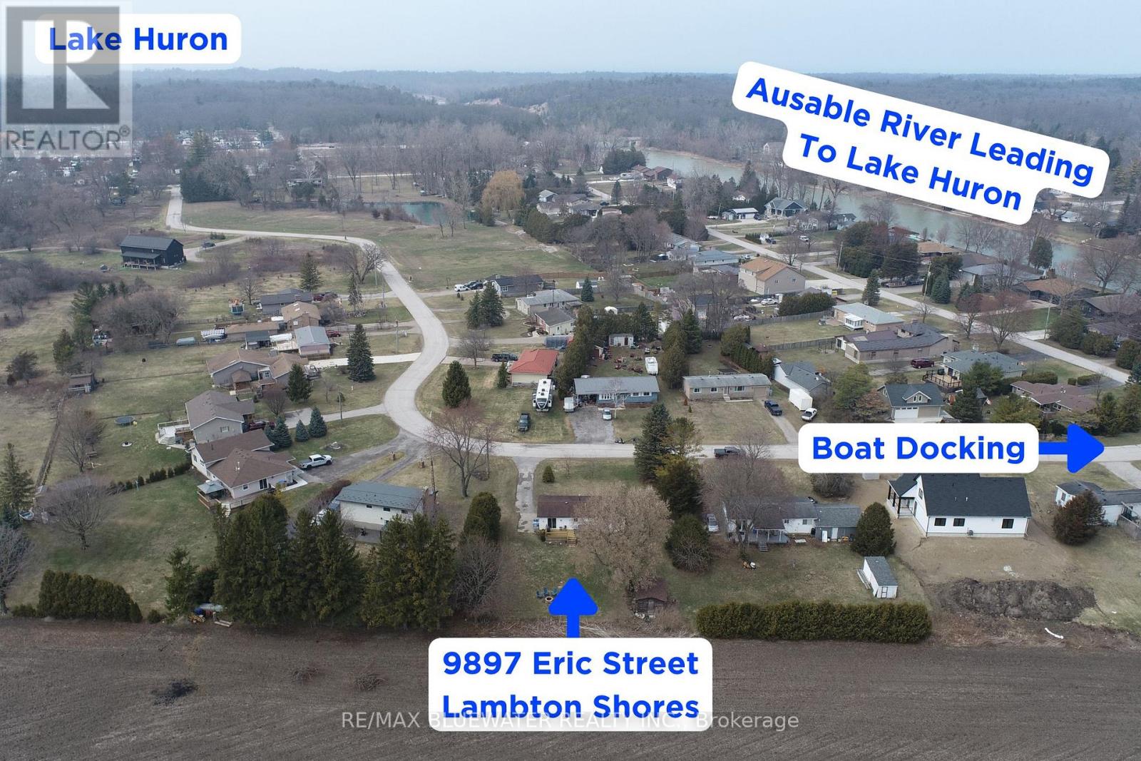 Three-bedroom bungalow with community boat docking in the Ausable River near Port Franks. Located at 9897 Eric Street, this well-maintained home offers comfortable, one-floor living-perfect for first-time buyers, retirees, or those seeking a peaceful getaway near Lake Huron. Situated on a quiet street backing onto farmland with a spacious yard, paved driveway and back yard firepit. Inside, the home features laminate flooring throughout finished in a beach tone color palette highlighting accent walls with wall trim molding or themed wallpaper. Large living room with bay window overlooking the front yard. Kitchen features stainless steel appliances, beach toned backsplash and modern design with lower cabinetry and upper floating shelving. Eating area between the kitchen and living room with patio doors to back deck. Main floor bathroom with decorative wall tile above a tub insert includes both a shower and bath option. Lots of area for guests with 3 bedrooms. Just steps to the Ausable River and the community riverfront parcel for your boat dock. Take the short ride up the river to Lake Huron at Port Franks. Just a short drive to the amenities of Grand Bend, beaches of Lake Huron or Pinery Provincial Park. (id:64974)