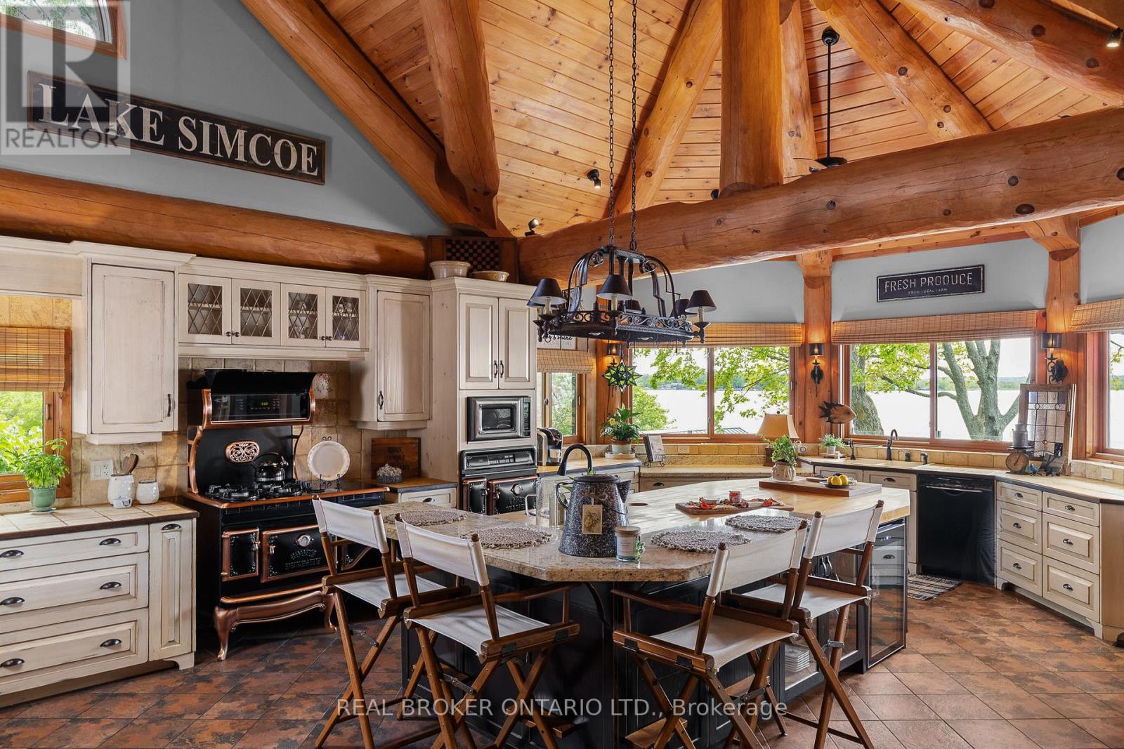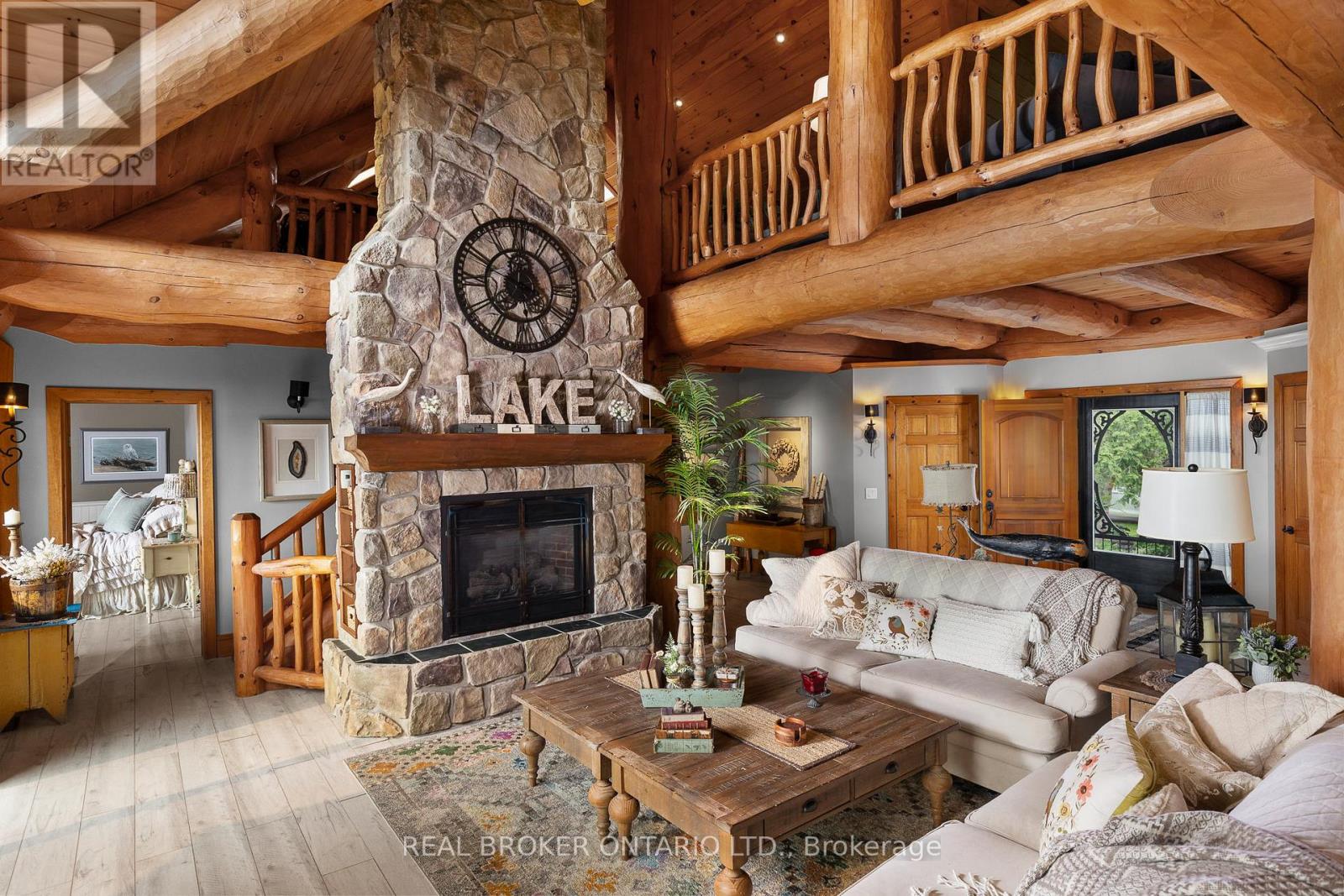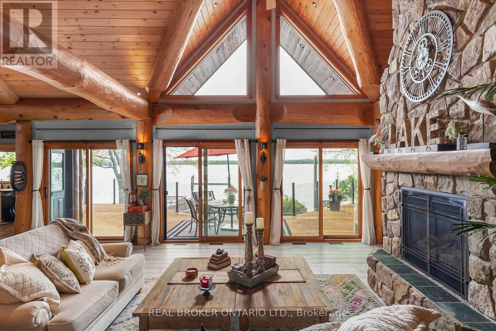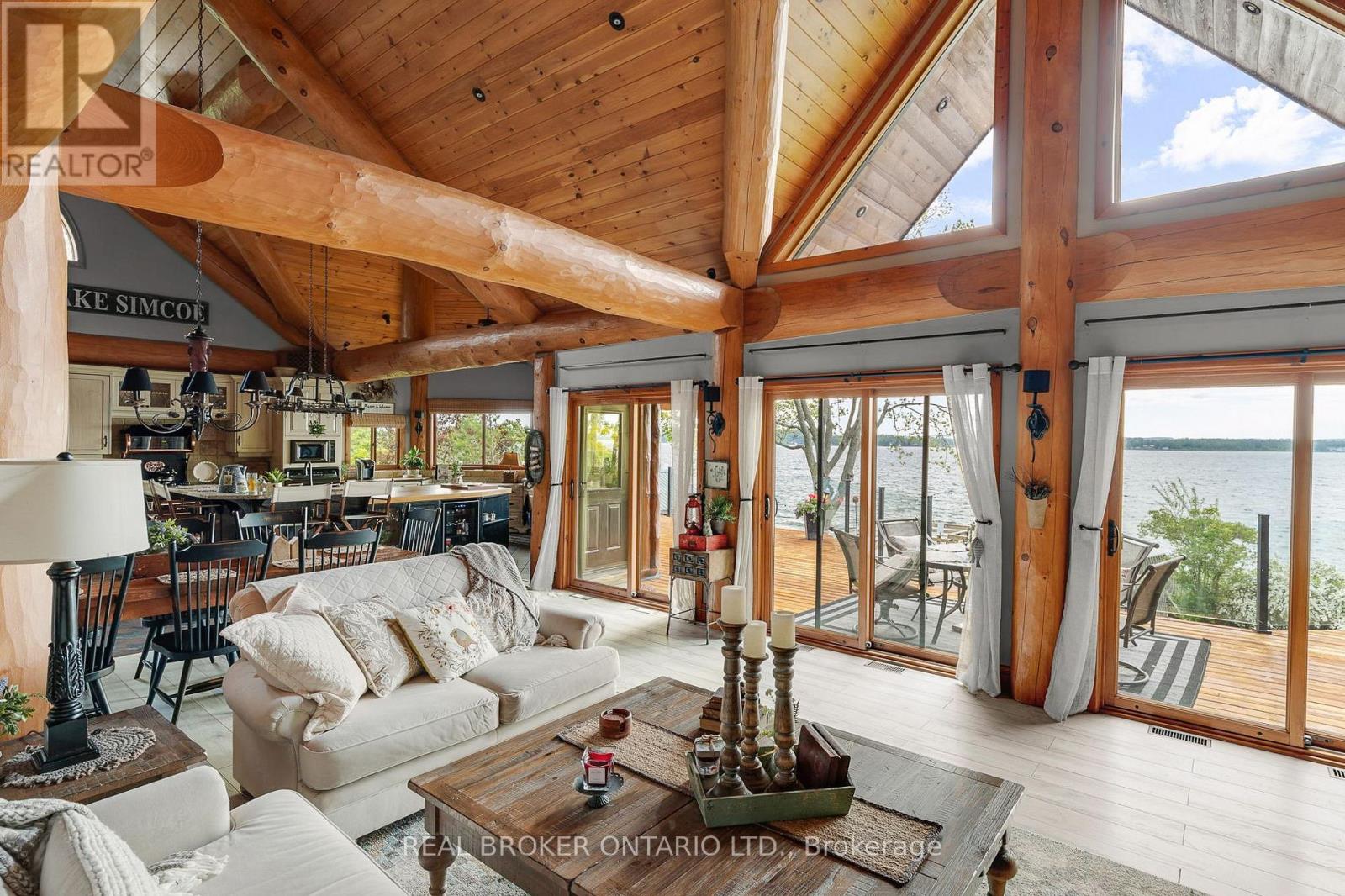 Welcome to 'Four Winds', one of Orillia's most exceptional waterfront properties located on Lake Simcoe. Situated on a rare 206 feet of private shoreline, this 2005-built round log home by Moonstone Timberframe with almost 5000 square feet of finished living space, offers timeless craftsmanship, remarkable design, and panoramic lake views from nearly every room. West-facing exposure delivers unforgettable sunsets, while the setting near the narrows connecting Lake Simcoe and Lake Couchiching offers incredible access to the Trent Severn Waterway and year-round enjoyment. Inside, a 30-ft vaulted great room showcases true log construction and stunning stonework around the gas fireplace. The chefs kitchen is a showpiece with an oversized island, high-end Elmira Heritage appliances, and wraparound views of the lake. The main floor primary suite features a 5-piece ensuite, walk-in closet, in-suite laundry, and private access to the expansive glass-railed deck overlooking the lake. Upstairs, a spacious open loft currently functions as a lounge and home office, originally designed to accommodate 2 additional bedrooms and a full bathroom. The fully finished walkout basement includes in-floor heating throughout, an entertainers bar, media room, two large guest bedrooms, full bathroom with laundry hookup, and access to a screened-in porch and covered patio. At the waters edge, a 458 sq ft finished boathouse bunkie with waterfront deck offers additional guest space. The 1,289 sq ft heated garage/workshop easily stores up to a 38-ft boat plus 2 vehicles. On the water, enjoy a 60ft cantilever dock, large observation deck, boat rail system and additional floating dock. Just 10 minutes to Orillia, under an hour to Muskoka, and only an hour from the GTA, this is lakeside living at its absolute finest. See agent website for info, additional photos and floor plans. (id:64974)