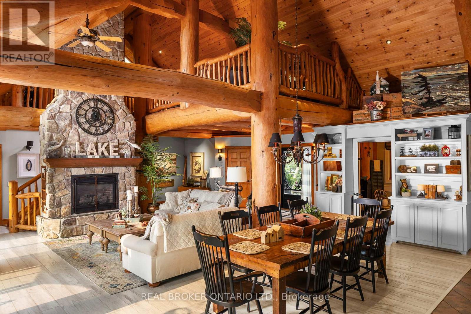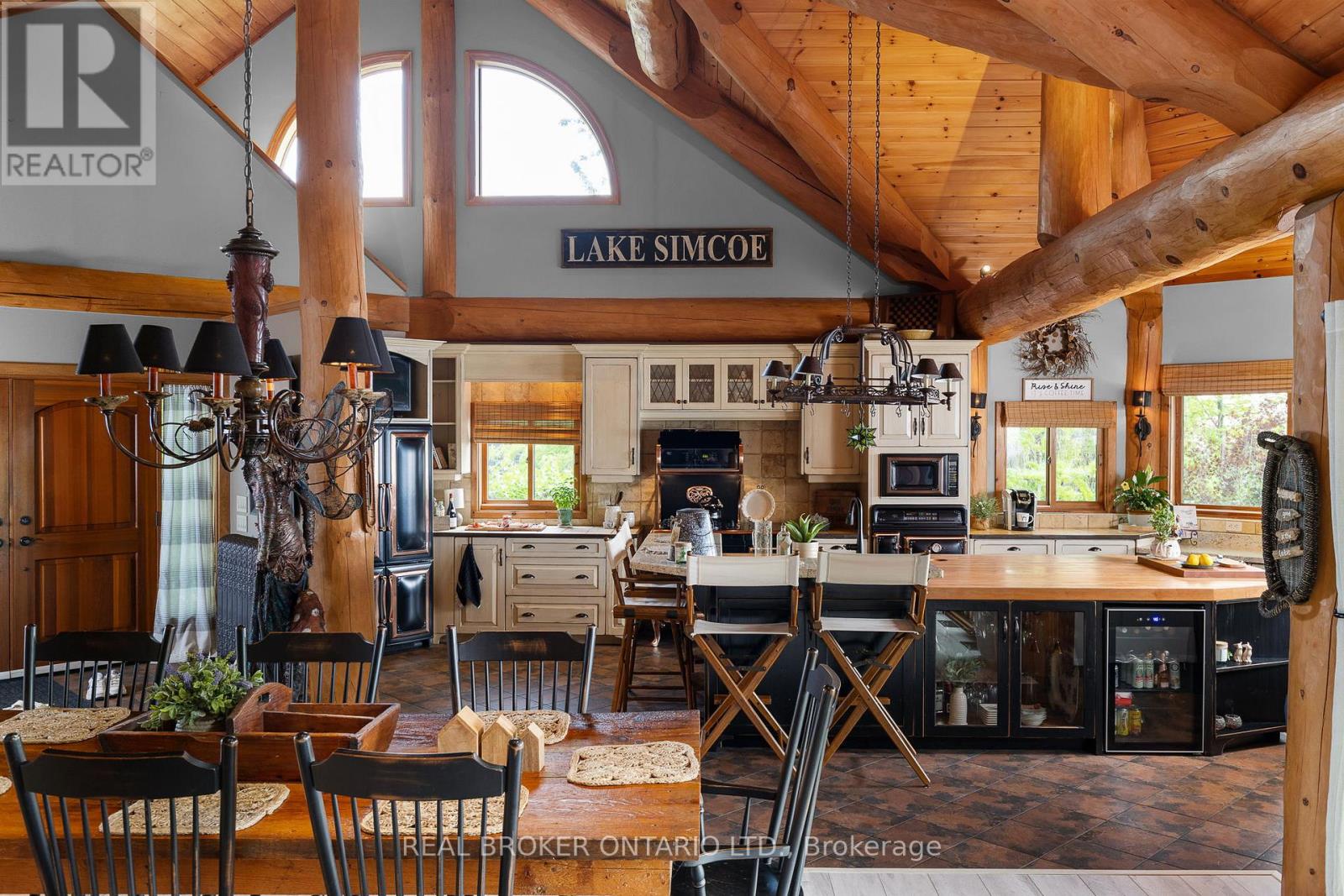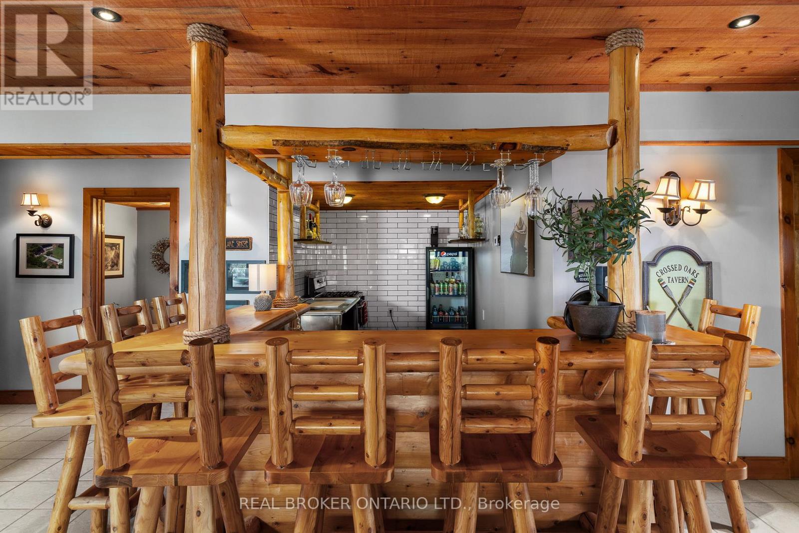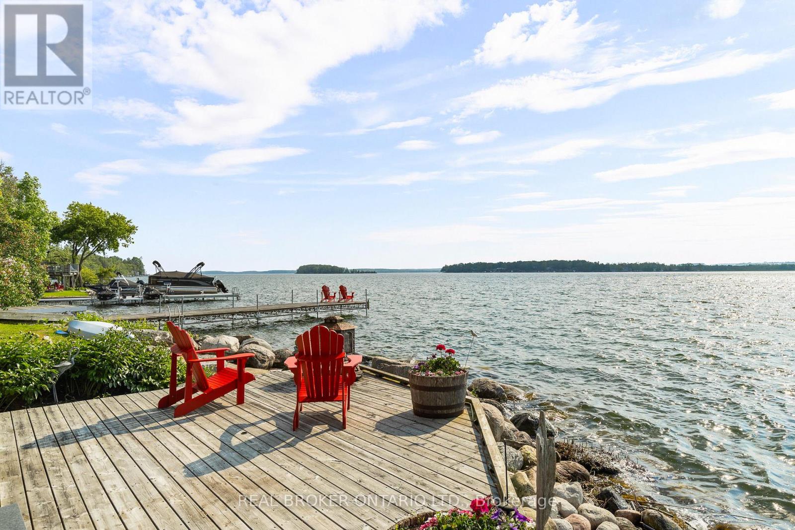 Welcome to 'Four Winds', one of Orillia's most exceptional waterfront properties located on Lake Simcoe. Situated on a rare 206 feet of private shoreline, this 2005-built round log home by Moonstone Timberframe with almost 5000 square feet of finished living space, offers timeless craftsmanship, remarkable design, and panoramic lake views from nearly every room. West-facing exposure delivers unforgettable sunsets, while the setting near the narrows connecting Lake Simcoe and Lake Couchiching offers incredible access to the Trent Severn Waterway and year-round enjoyment. Inside, a 30-ft vaulted great room showcases true log construction and stunning stonework around the gas fireplace. The chefs kitchen is a showpiece with an oversized island, high-end Elmira Heritage appliances, and wraparound views of the lake. The main floor primary suite features a 5-piece ensuite, walk-in closet, in-suite laundry, and private access to the expansive glass-railed deck overlooking the lake. Upstairs, a spacious open loft currently functions as a lounge and home office, originally designed to accommodate 2 additional bedrooms and a full bathroom. The fully finished walkout basement includes in-floor heating throughout, an entertainers bar, media room, two large guest bedrooms, full bathroom with laundry hookup, and access to a screened-in porch and covered patio. At the waters edge, a 458 sq ft finished boathouse bunkie with waterfront deck offers additional guest space. The 1,289 sq ft heated garage/workshop easily stores up to a 38-ft boat plus 2 vehicles. On the water, enjoy a 60ft cantilever dock, large observation deck, boat rail system and additional floating dock. Just 10 minutes to Orillia, under an hour to Muskoka, and only an hour from the GTA, this is lakeside living at its absolute finest. See agent website for info, additional photos and floor plans. (id:64974)