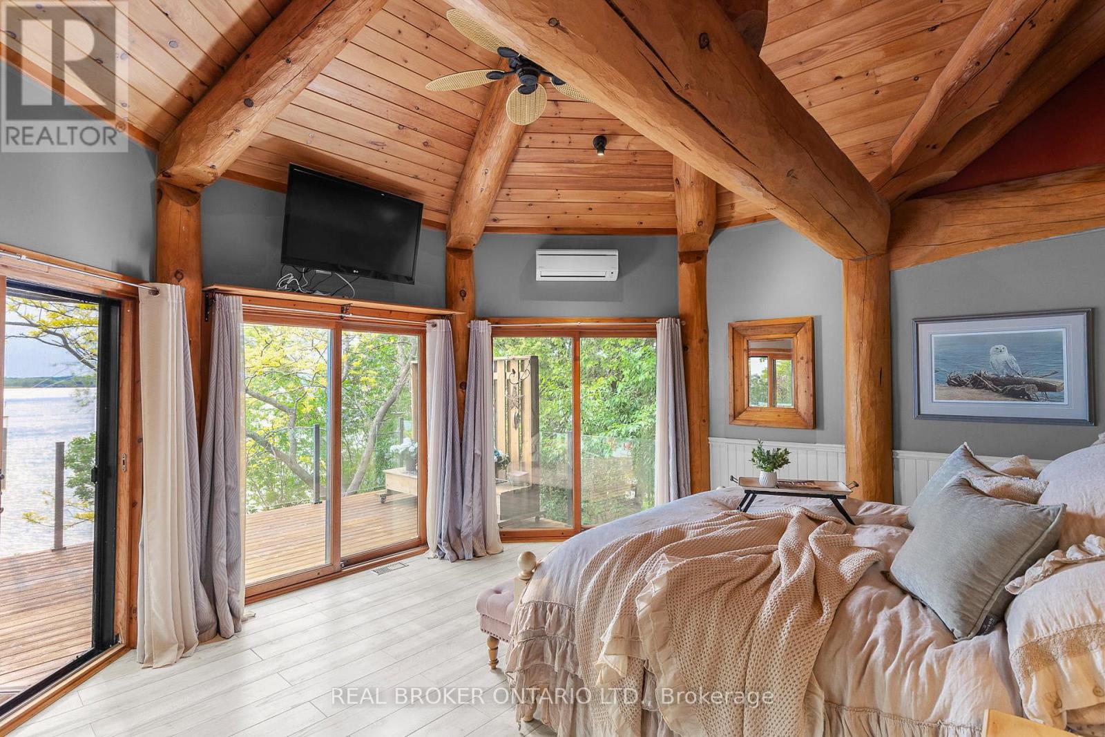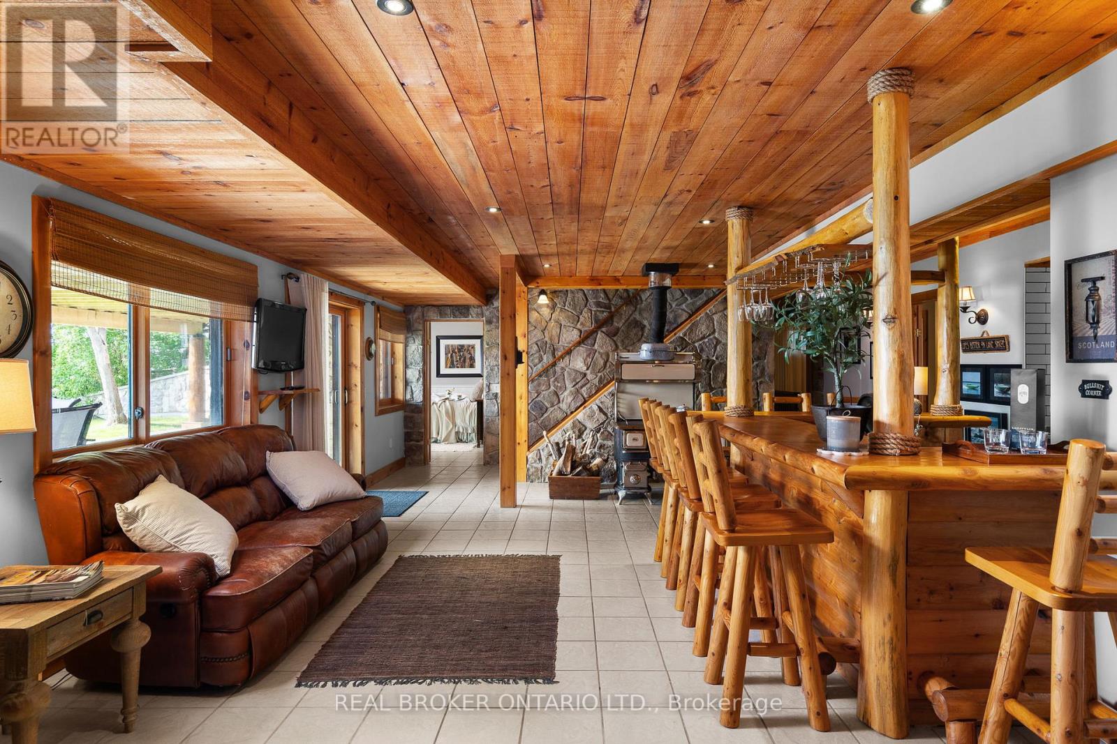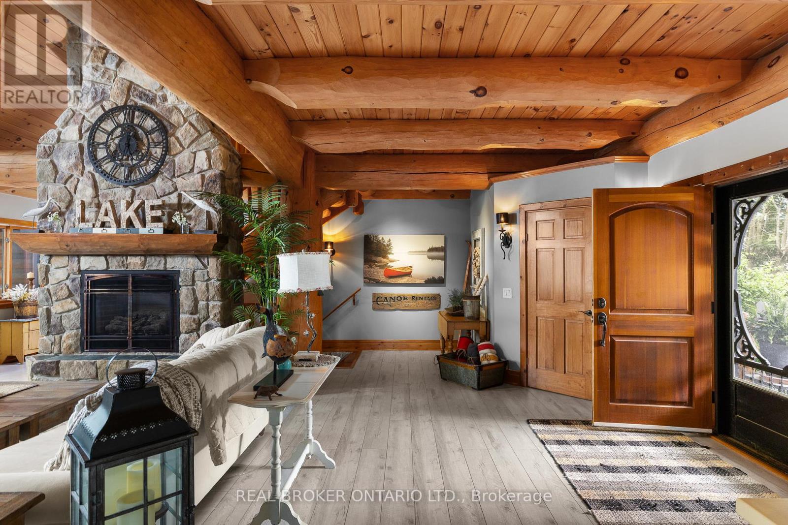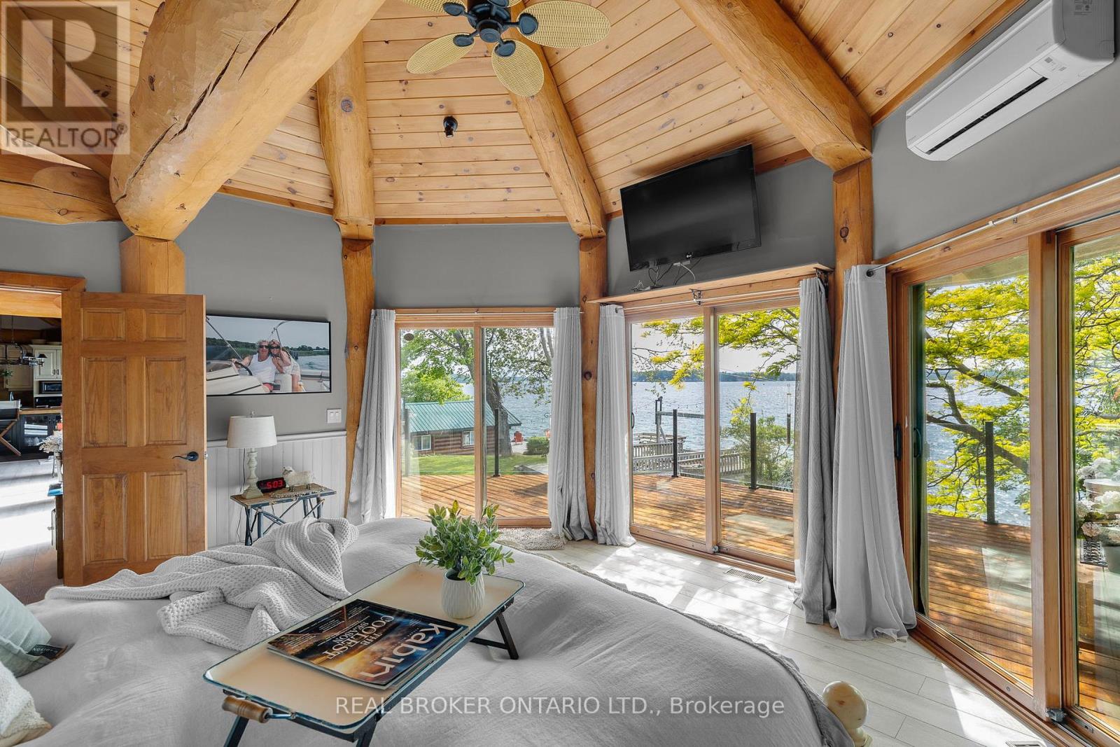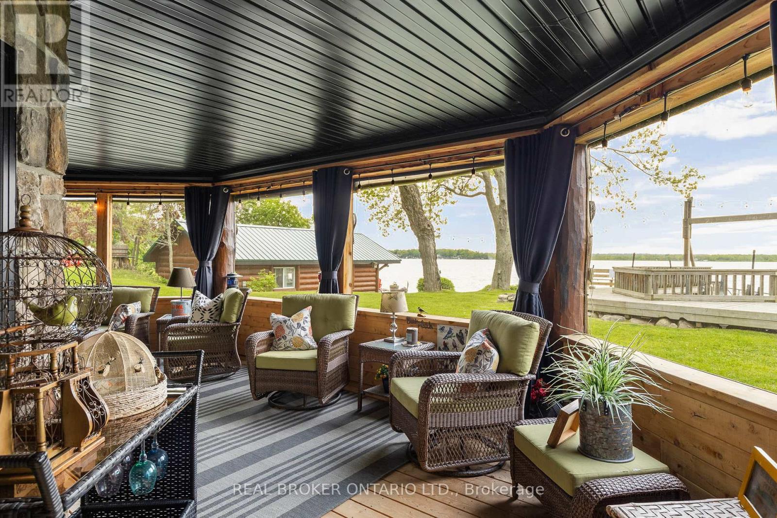 Welcome to 'Four Winds', one of Orillia's most exceptional waterfront properties located on Lake Simcoe. Situated on a rare 206 feet of private shoreline, this 2005-built round log home by Moonstone Timberframe with almost 5000 square feet of finished living space, offers timeless craftsmanship, remarkable design, and panoramic lake views from nearly every room. West-facing exposure delivers unforgettable sunsets, while the setting near the narrows connecting Lake Simcoe and Lake Couchiching offers incredible access to the Trent Severn Waterway and year-round enjoyment. Inside, a 30-ft vaulted great room showcases true log construction and stunning stonework around the gas fireplace. The chefs kitchen is a showpiece with an oversized island, high-end Elmira Heritage appliances, and wraparound views of the lake. The main floor primary suite features a 5-piece ensuite, walk-in closet, in-suite laundry, and private access to the expansive glass-railed deck overlooking the lake. Upstairs, a spacious open loft currently functions as a lounge and home office, originally designed to accommodate 2 additional bedrooms and a full bathroom. The fully finished walkout basement includes in-floor heating throughout, an entertainers bar, media room, two large guest bedrooms, full bathroom with laundry hookup, and access to a screened-in porch and covered patio. At the waters edge, a 458 sq ft finished boathouse bunkie with waterfront deck offers additional guest space. The 1,289 sq ft heated garage/workshop easily stores up to a 38-ft boat plus 2 vehicles. On the water, enjoy a 60ft cantilever dock, large observation deck, boat rail system and additional floating dock. Just 10 minutes to Orillia, under an hour to Muskoka, and only an hour from the GTA, this is lakeside living at its absolute finest. See agent website for info, additional photos and floor plans. (id:64974)