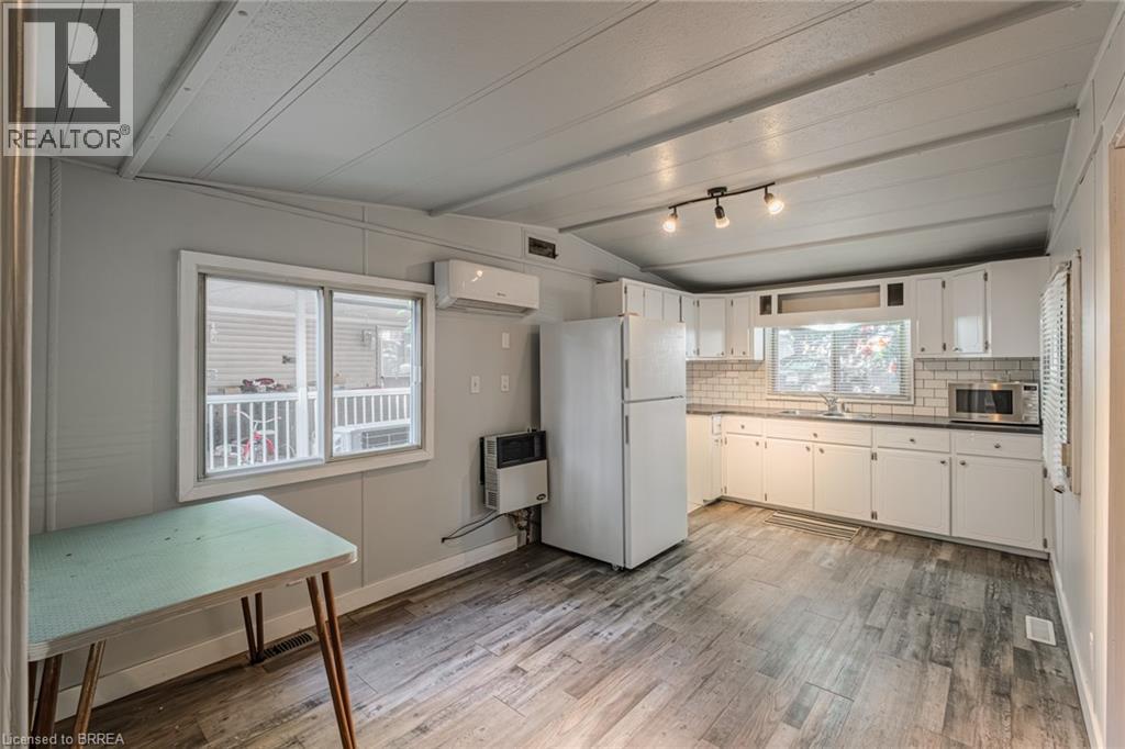 Welcome to this charming modular home, perfectly situated on a mature lot in a well-kept community. The exterior has been beautifully updated with vinyl siding and stone accents, complemented by a stone patio and low-maintenance composite decking—ideal for enjoying the outdoors. Step inside to find a cozy living room highlighted by a unique stained-glass window, a bright kitchen with updated countertops and backsplash, and a spacious four-piece bath with space for added laundry. The home features a comfortable bedroom with built-in storage cupboards for added convenience. Parking is available for up to three vehicles, with paved walkway and attractive landscaping. Park fees of $569.92 include property taxes, community water and septic; maintained by the park, providing peace of mind and ease of living. Powered by hydro with Hydro One, paved roads and natural gas service is to be completed by the park at a later date, adding even more value to this property. A wonderful opportunity for downsizers or first-time buyers looking for affordable, low-maintenance living. (id:64974)
