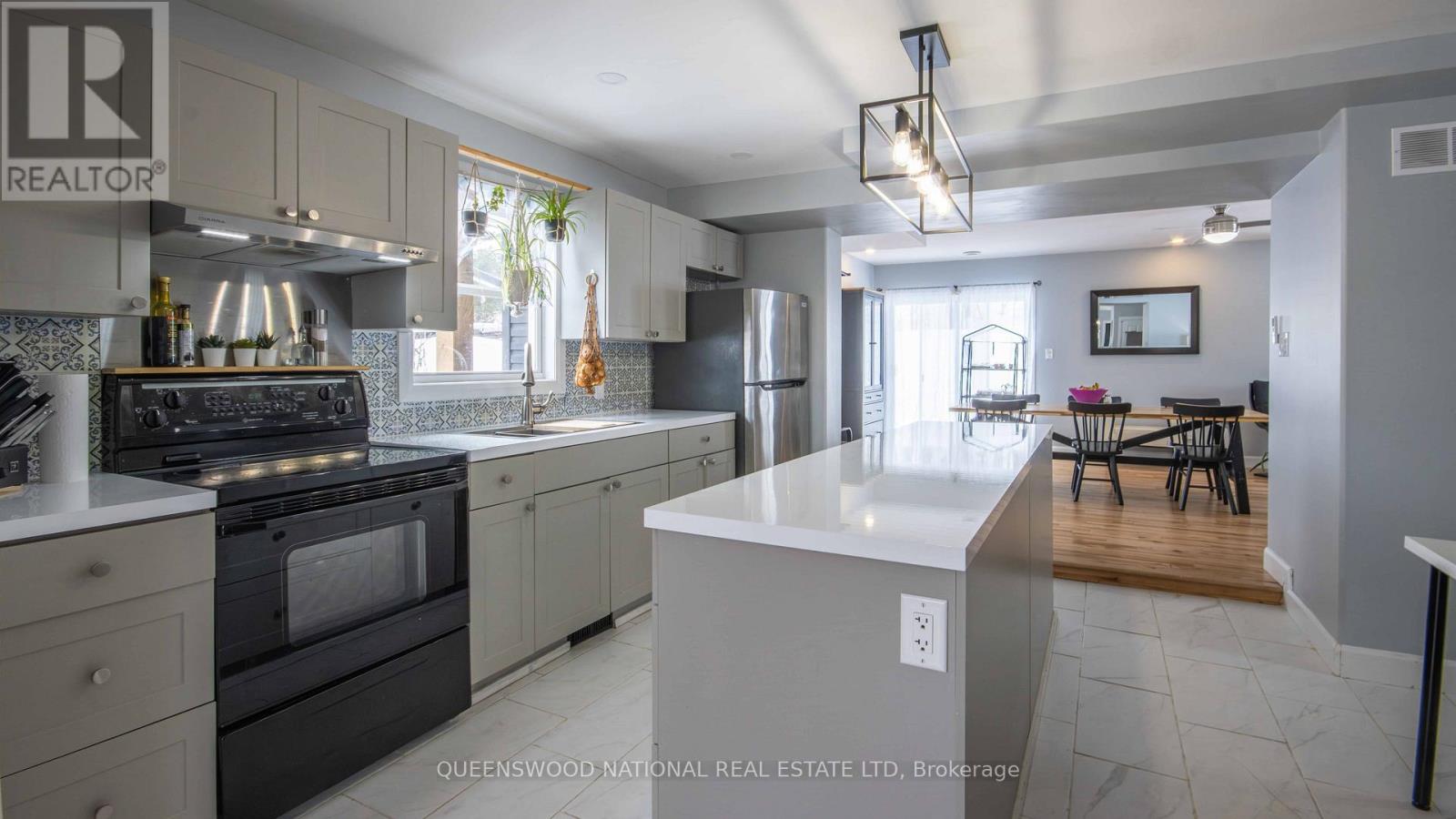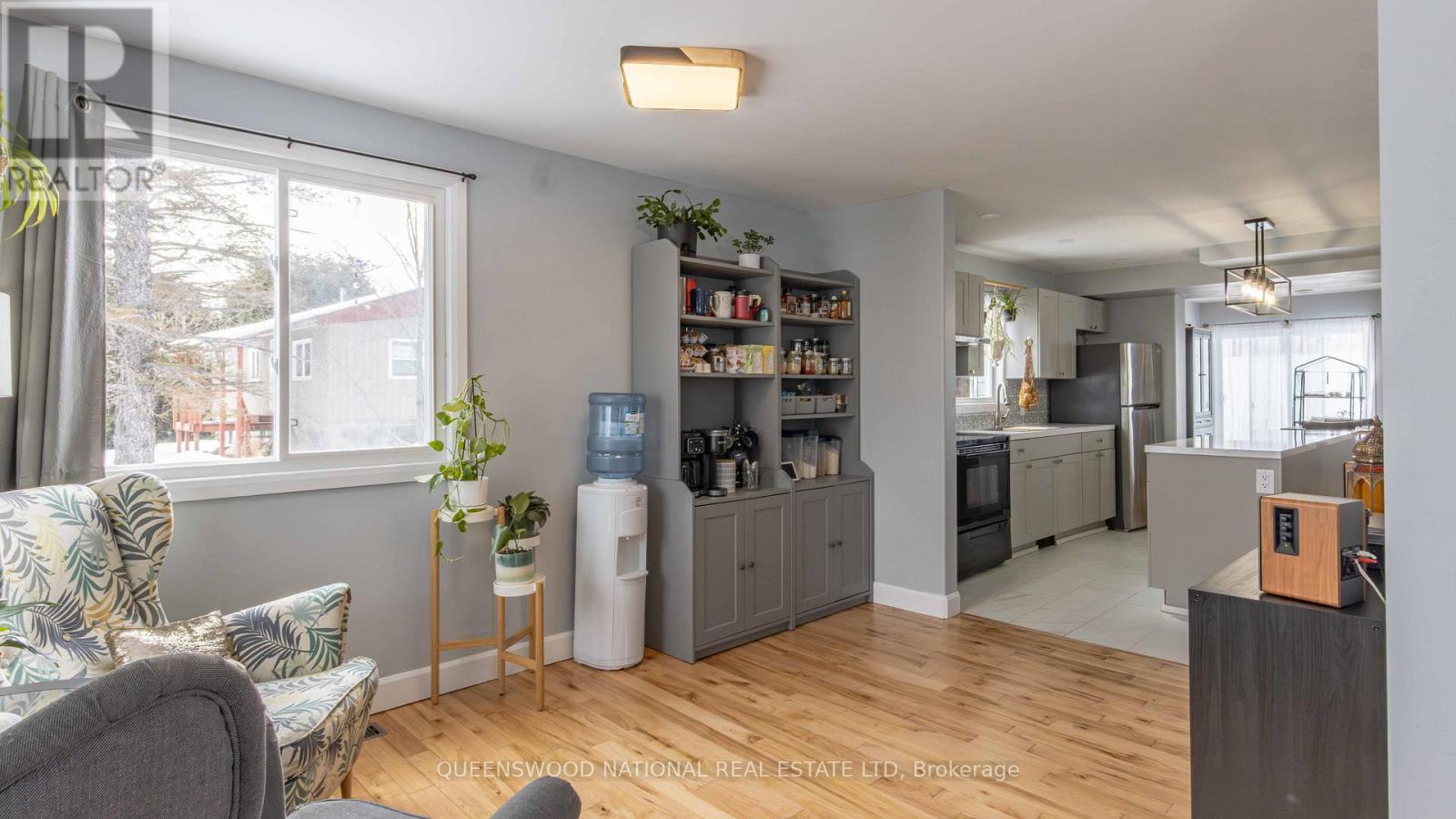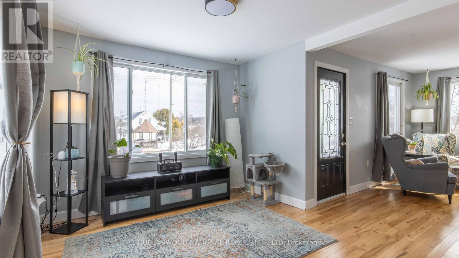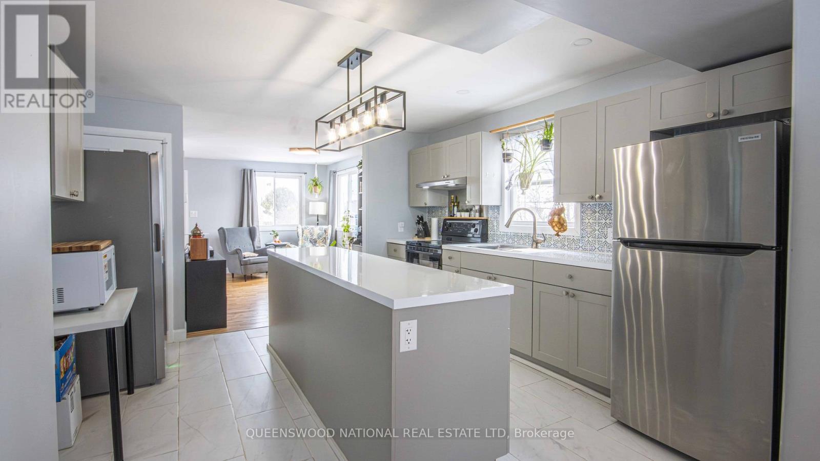 Welcome to your nearly-new sanctuary in the heart of Barry's Bay, where modern elegance meets the tranquility of nature. This meticulously fully renovated home offers the pristine feel of a new build, boasting two separate living spaces on the main floor separated by a chef-inspired kitchen-a layout ideal for large family gatherings. This culinary heart features a large kitchen island, expansive quartz countertops, and oversized ceramic tiles, while high-end hardwood and premium laminate flooring flow throughout the remainder of the home. Sliding doors lead from the main living area to a private retreat that backs onto a lush, tree-lined greenspace, all while being just steps away from the local hospital, library, boutique shopping, and dining. Designed for effortless living, the main floor also includes a convenient laundry room, a substantial walk-in storage closet, and a stunning oak staircase leading to the upper level.The upper level is thoughtfully designed for a growing family with four bedrooms in total, including three practical bedrooms and an expansive master suite that serves as a true showstopper. This primary retreat offers dramatic vaulted ceilings, a large walk-in closet, and a four-piece dream ensuite complete with double sinks. A versatile bonus nook on the upper level provides the perfect spot for a home office or quiet reading corner, adding to the home's functional layout. With three stylish bathrooms in total and the comfort of a high-efficiency forced-air propane furnace, every inch of this home has been optimized for quality and convenience. This is a rare opportunity to own a sophisticated, move-in-ready home that perfectly balances small-town charm with contemporary luxury. Furnace, roof, water heater, electrical and plumbing all newer 2022 (id:64974)