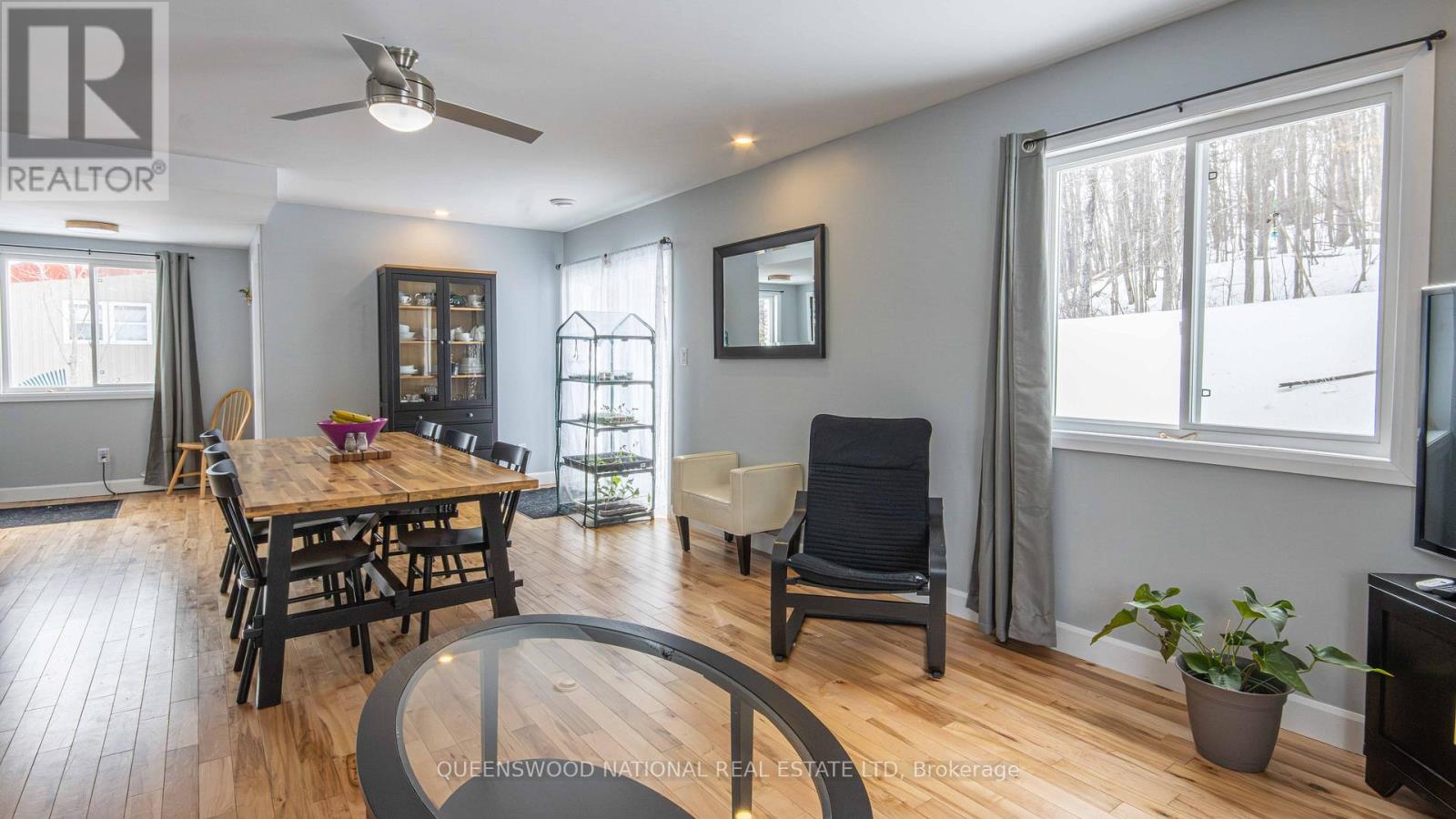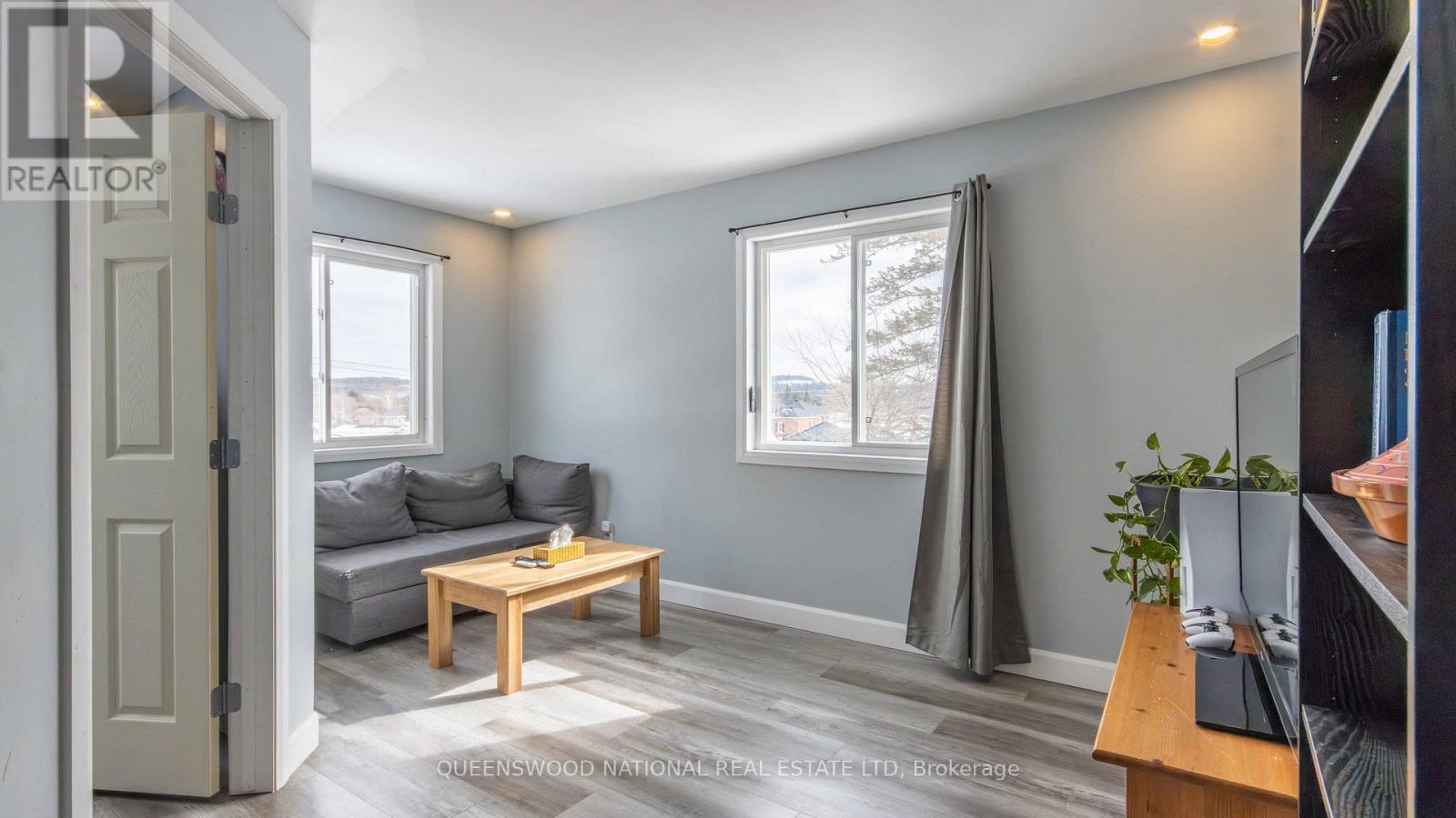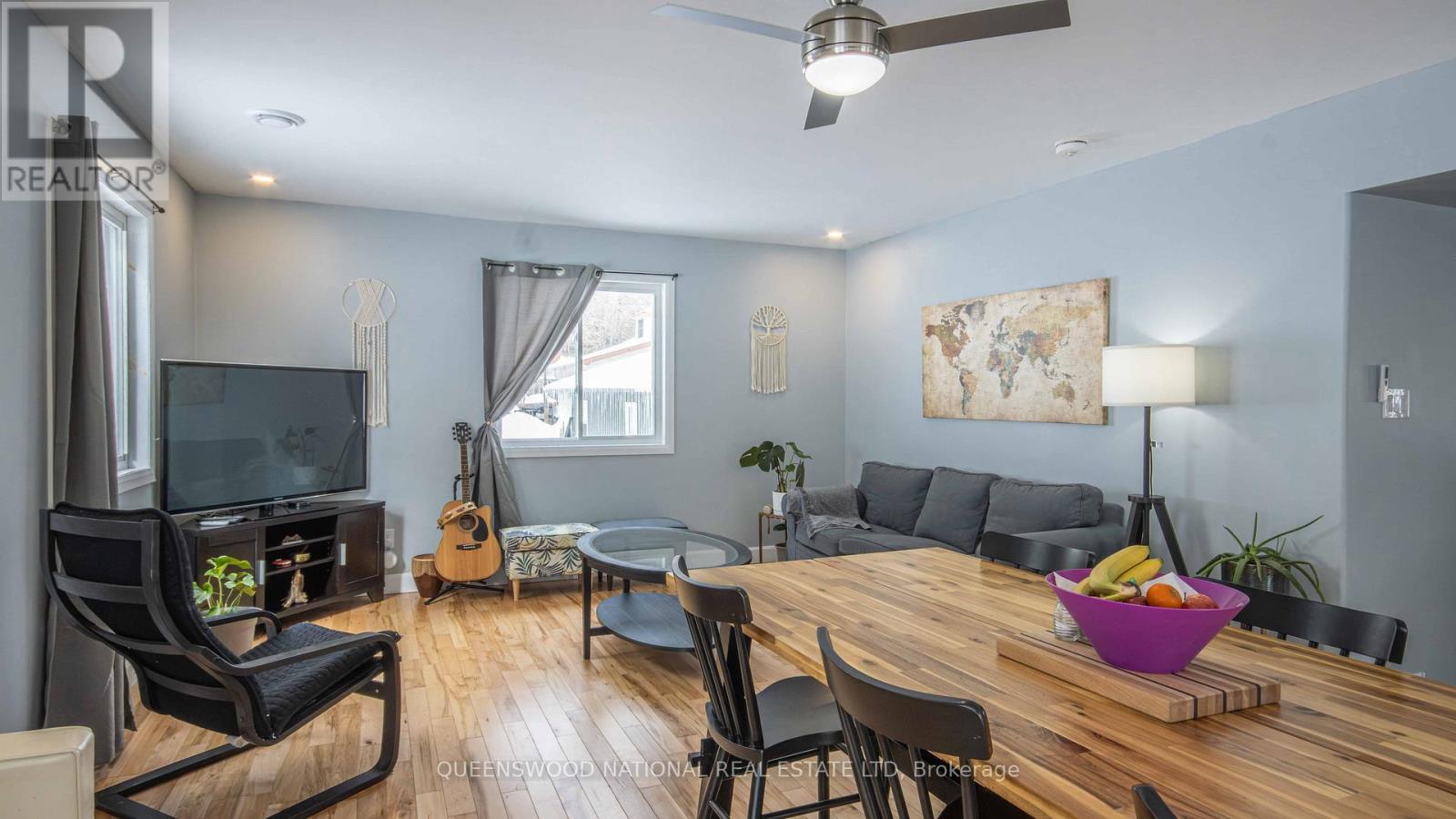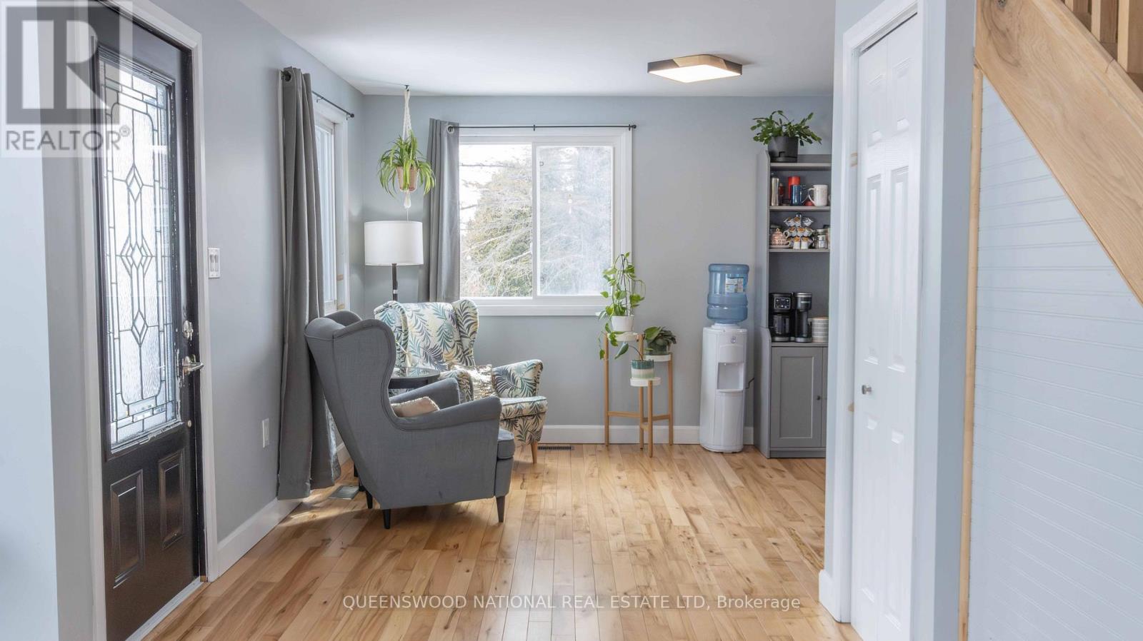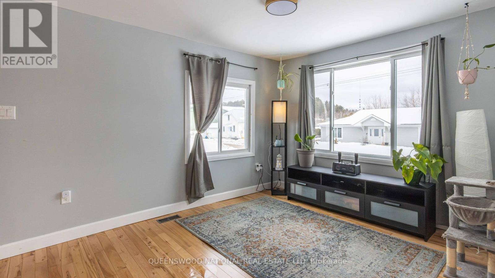 Welcome to your nearly-new sanctuary in the heart of Barry's Bay, where modern elegance meets the tranquility of nature. This meticulously fully renovated home offers the pristine feel of a new build, boasting two separate living spaces on the main floor separated by a chef-inspired kitchen-a layout ideal for large family gatherings. This culinary heart features a large kitchen island, expansive quartz countertops, and oversized ceramic tiles, while high-end hardwood and premium laminate flooring flow throughout the remainder of the home. Sliding doors lead from the main living area to a private retreat that backs onto a lush, tree-lined greenspace, all while being just steps away from the local hospital, library, boutique shopping, and dining. Designed for effortless living, the main floor also includes a convenient laundry room, a substantial walk-in storage closet, and a stunning oak staircase leading to the upper level.The upper level is thoughtfully designed for a growing family with four bedrooms in total, including three practical bedrooms and an expansive master suite that serves as a true showstopper. This primary retreat offers dramatic vaulted ceilings, a large walk-in closet, and a four-piece dream ensuite complete with double sinks. A versatile bonus nook on the upper level provides the perfect spot for a home office or quiet reading corner, adding to the home's functional layout. With three stylish bathrooms in total and the comfort of a high-efficiency forced-air propane furnace, every inch of this home has been optimized for quality and convenience. This is a rare opportunity to own a sophisticated, move-in-ready home that perfectly balances small-town charm with contemporary luxury. Furnace, roof, water heater, electrical and plumbing all newer 2022 (id:64974)